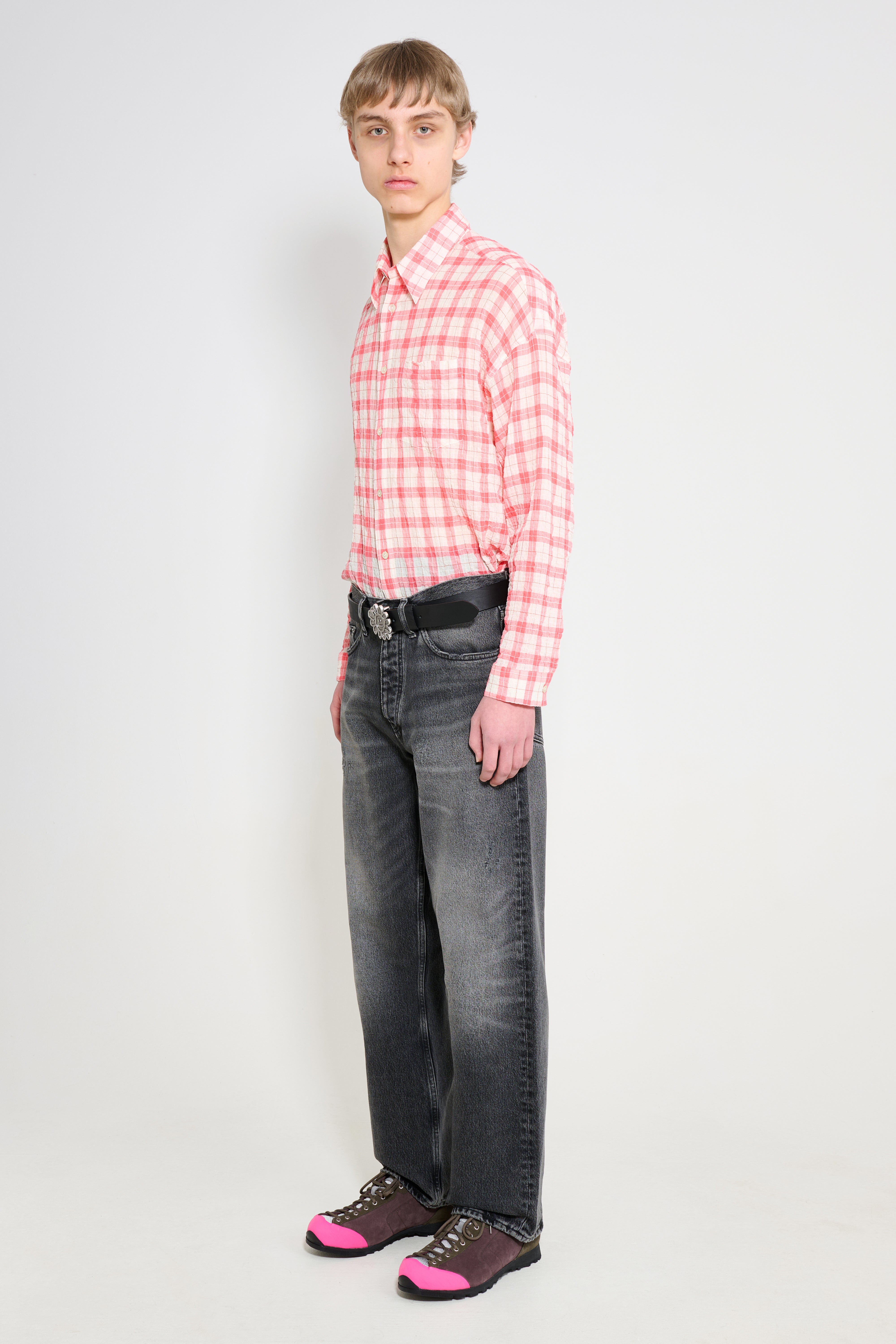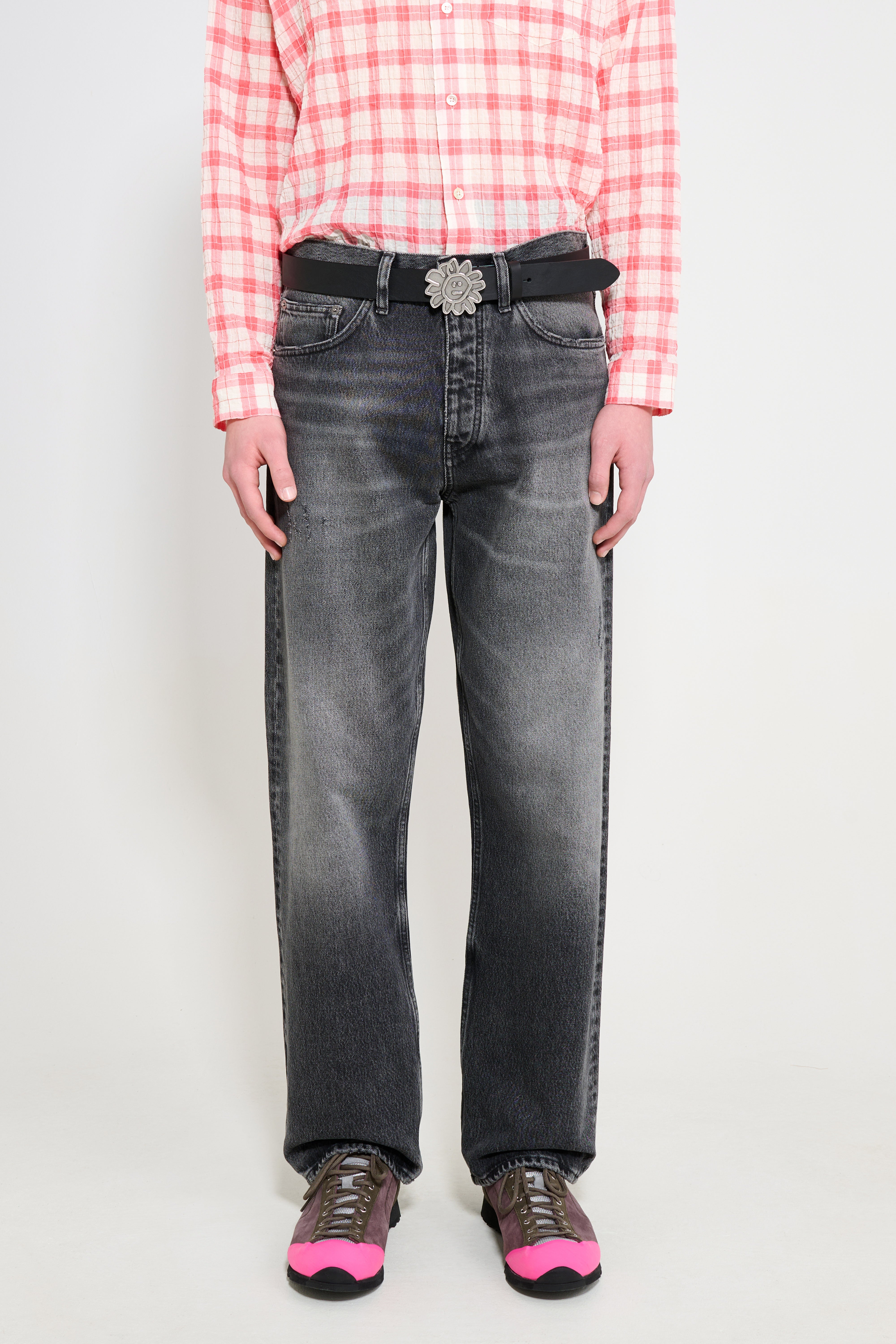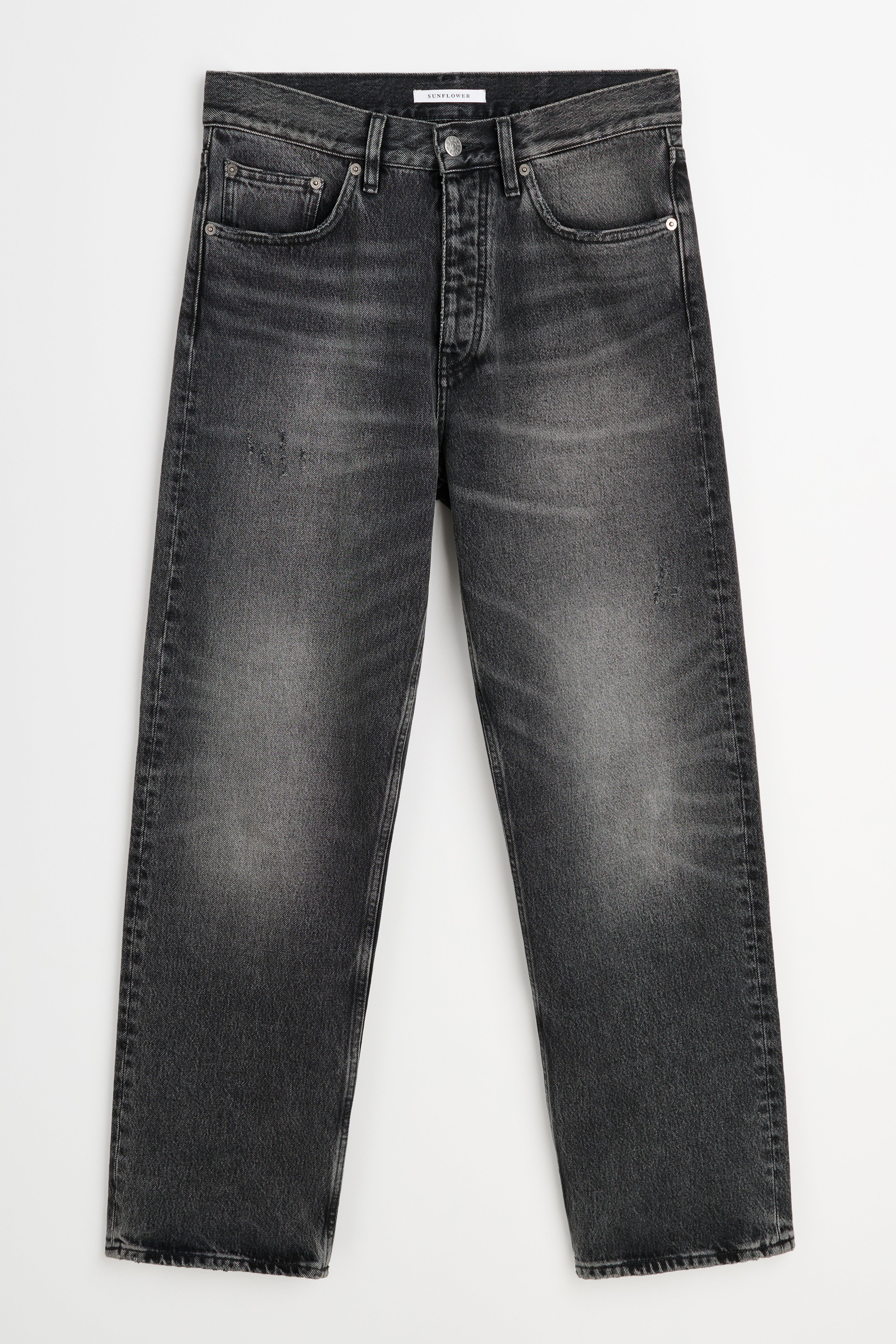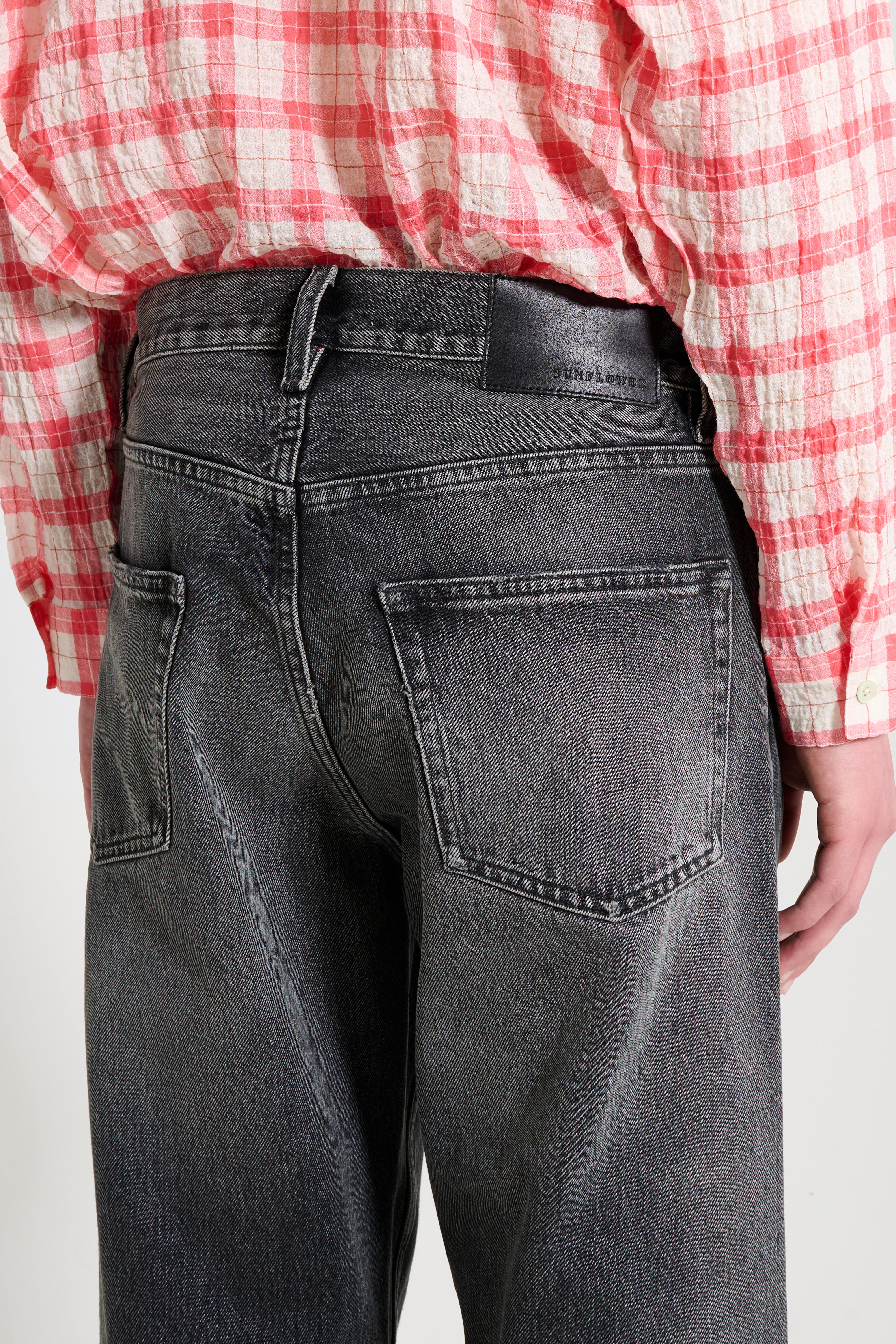 Loose jeans from Sunflower. Made from 13.5 oz organic cotton denim with a vintage washed black tone and worn character. The cut is loose through the leg with a straight profile. Details include recycled metal trims, a button fly and a Sunflower logo leather patch at the back.