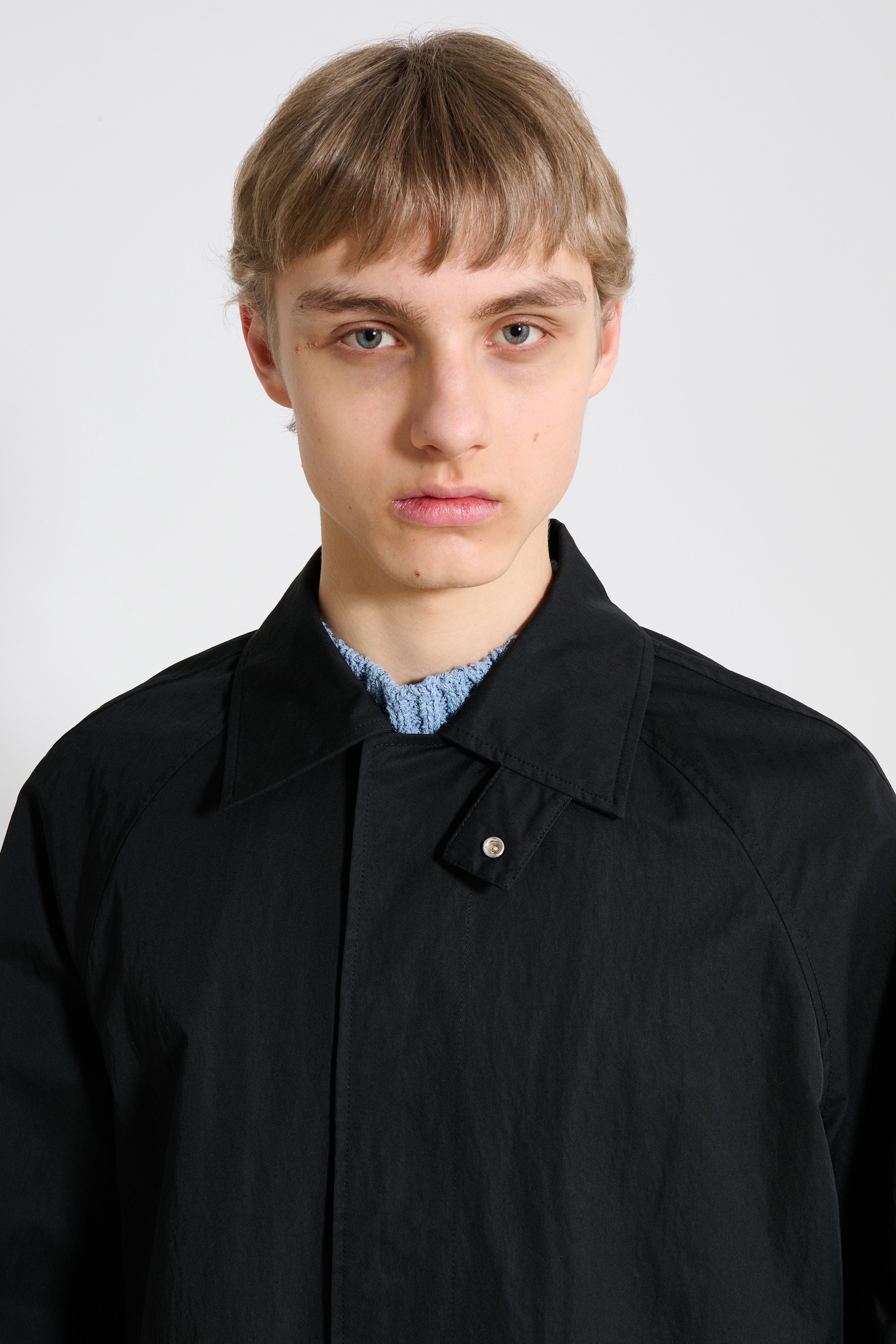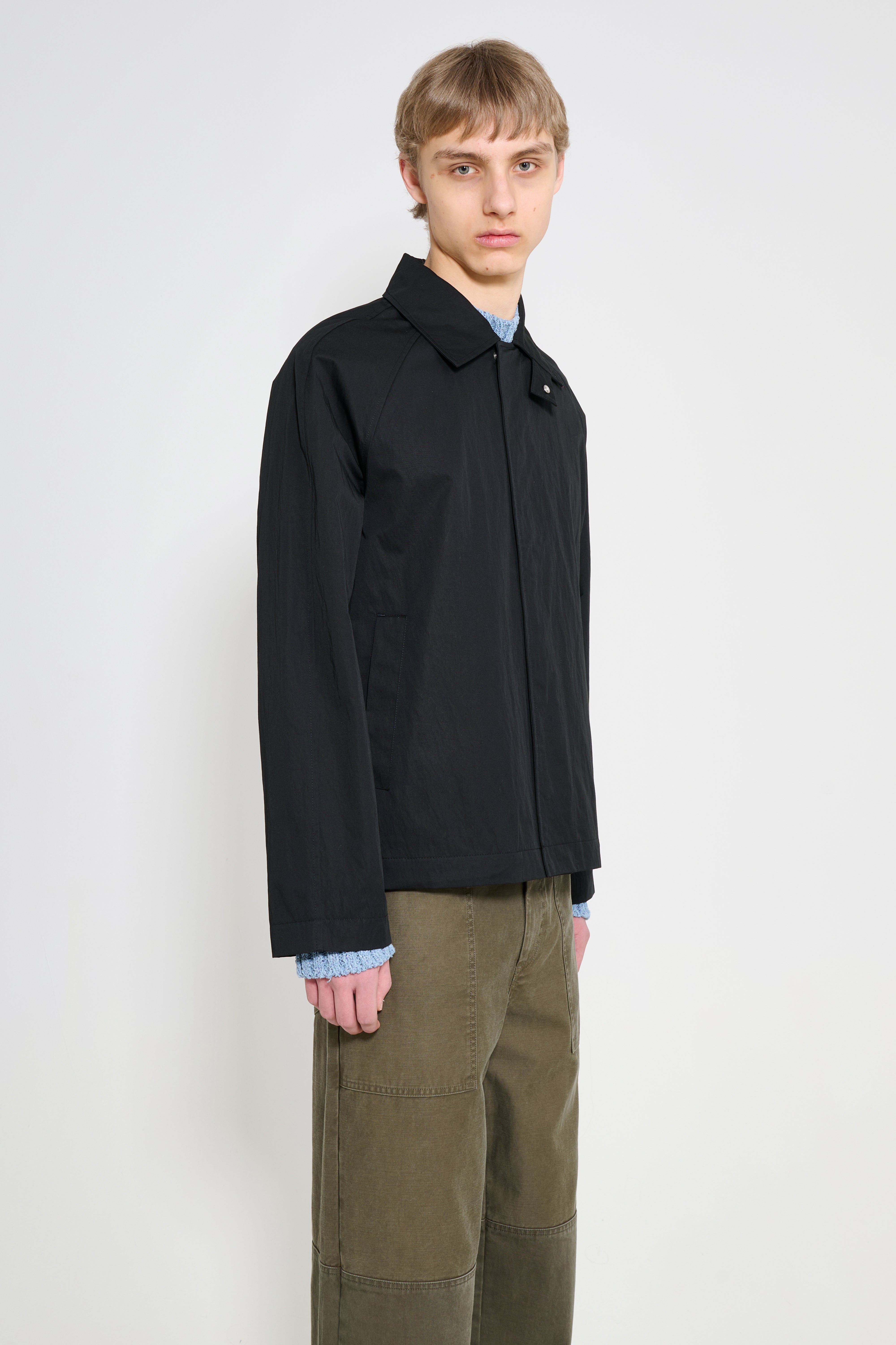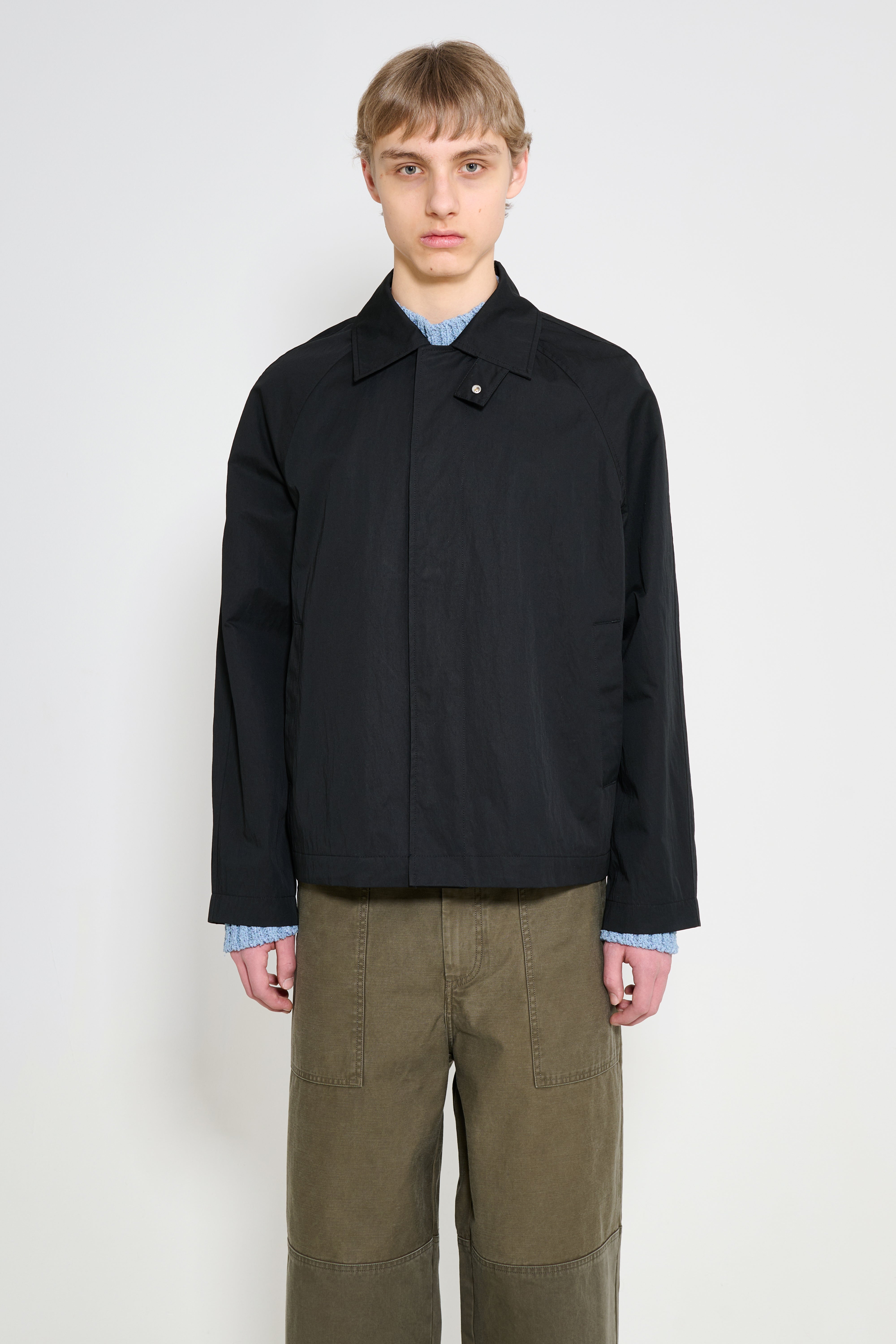 Short raglan coat from Sunflower. Constructed from double-face cotton nylon coating fabric with a smooth, structured surface. Designed with a cropped car coat length, raglan sleeves and a contrast corduroy collar. The front has a concealed push button placket, while paspel pockets sit at the sides. Fully lined in viscose.