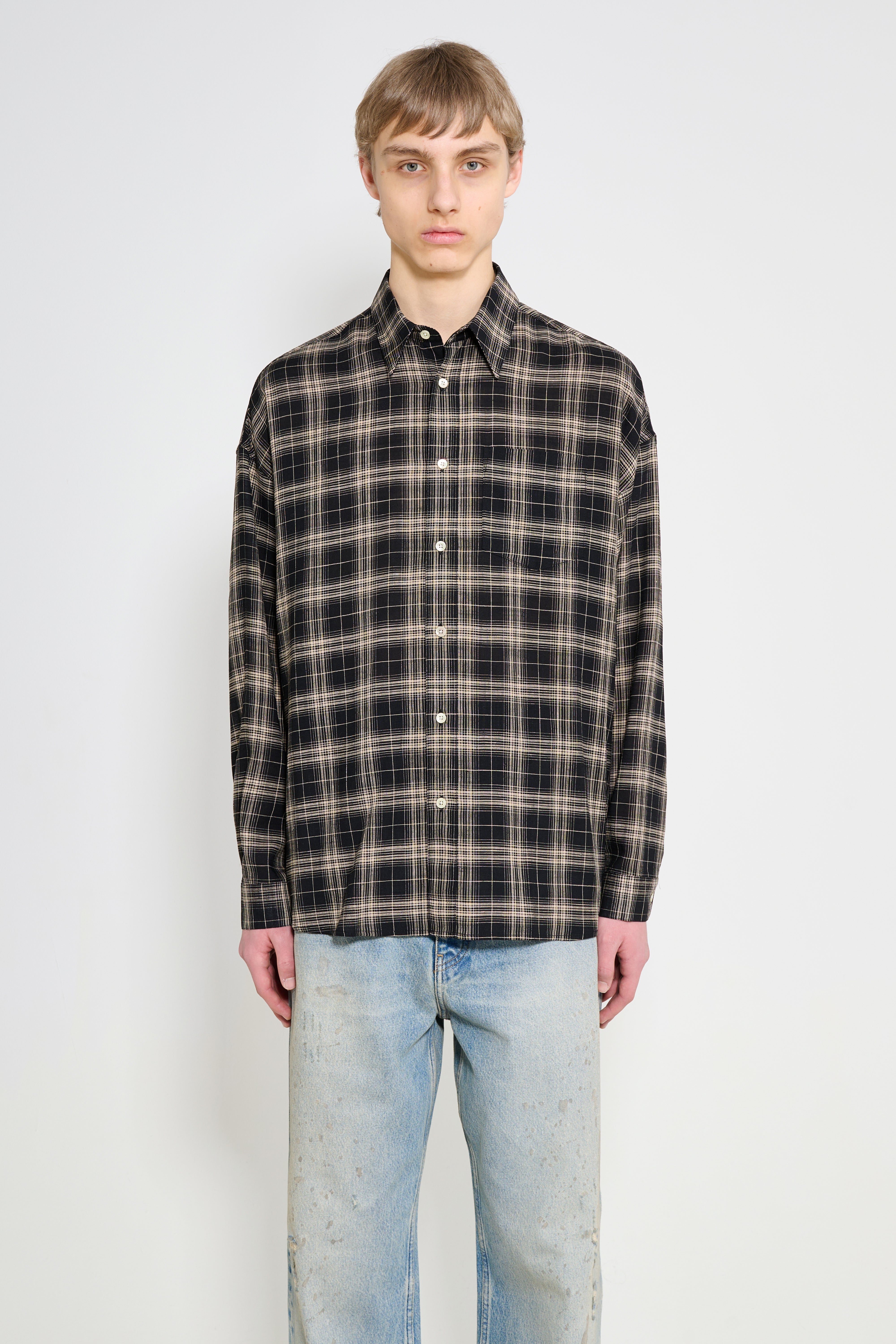 Button up shirt from Sunflower. Cut in a regular shape with a split collar and curved hem. The lightweight checked fabric has a refined high and low surface texture. Front closure uses real mother-of-pearl buttons. Finished with a single chest patch pocket and buttoned cuffs.