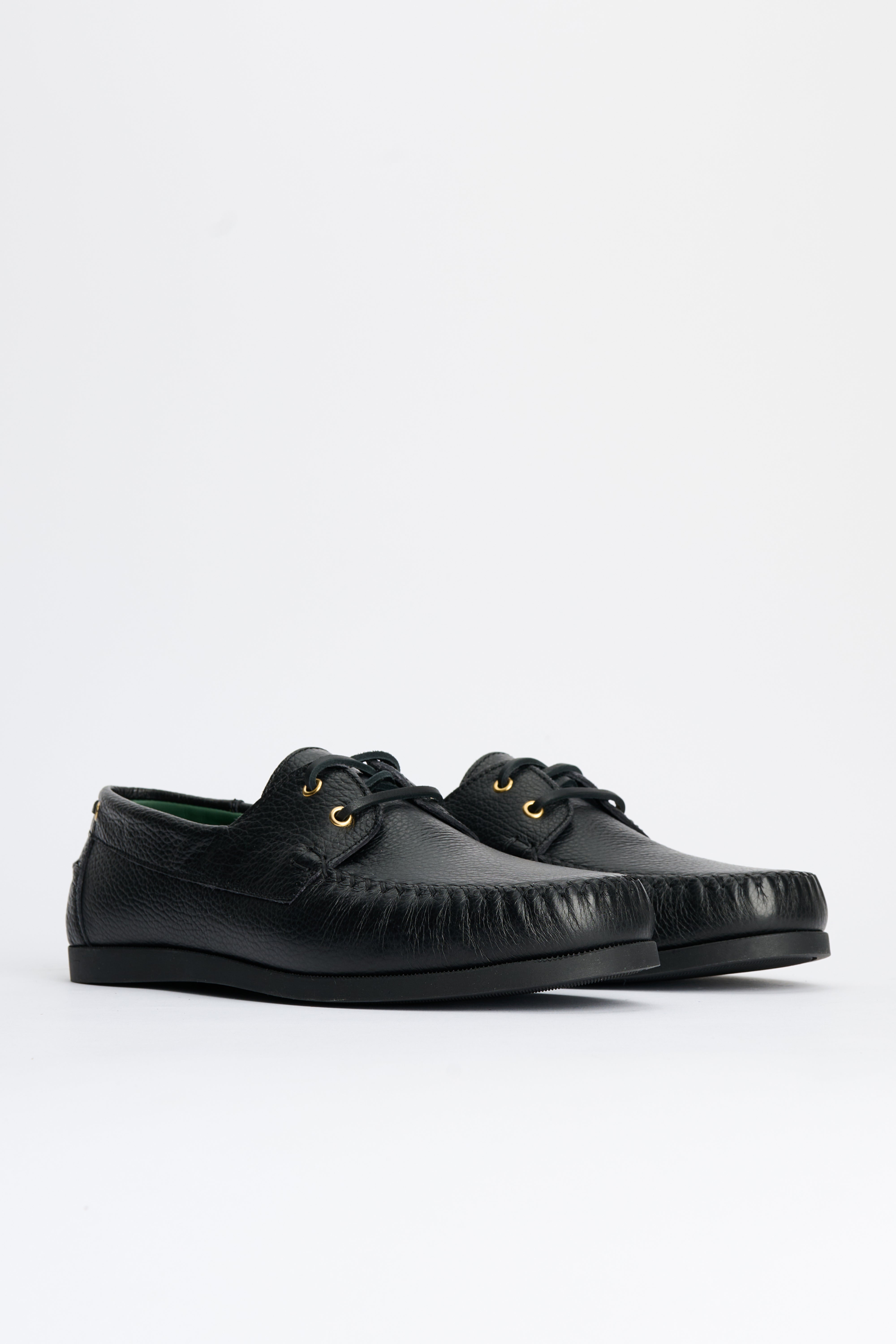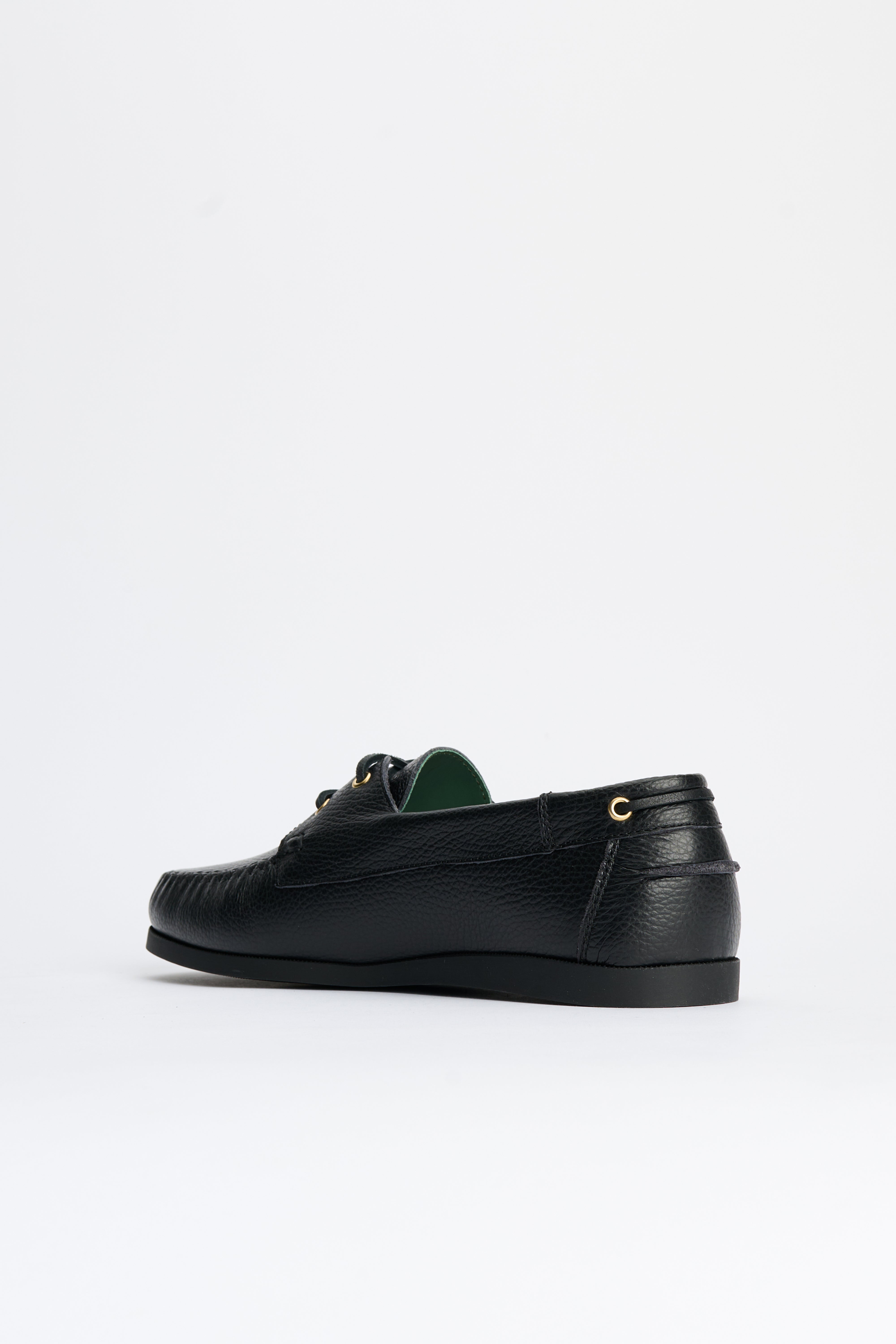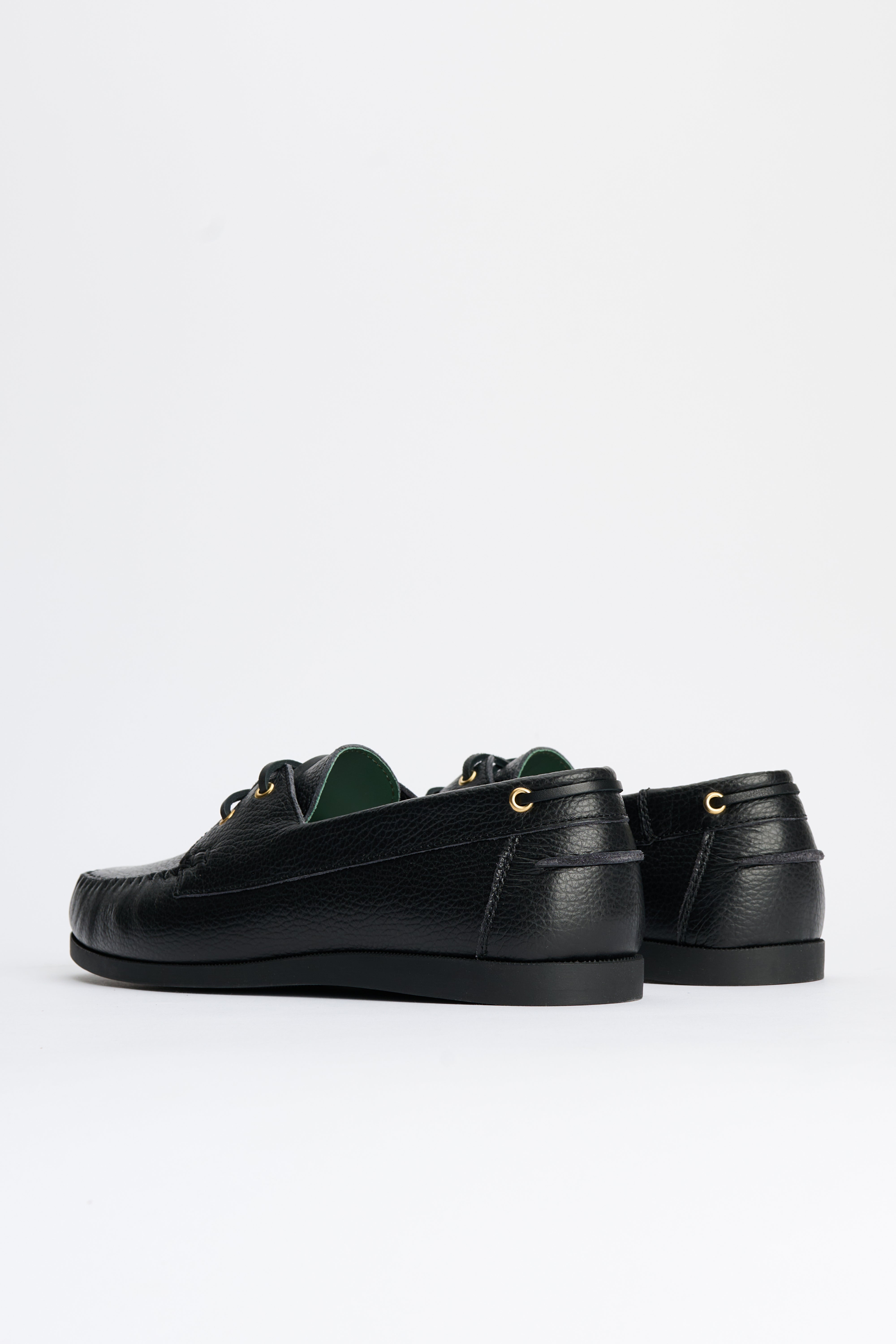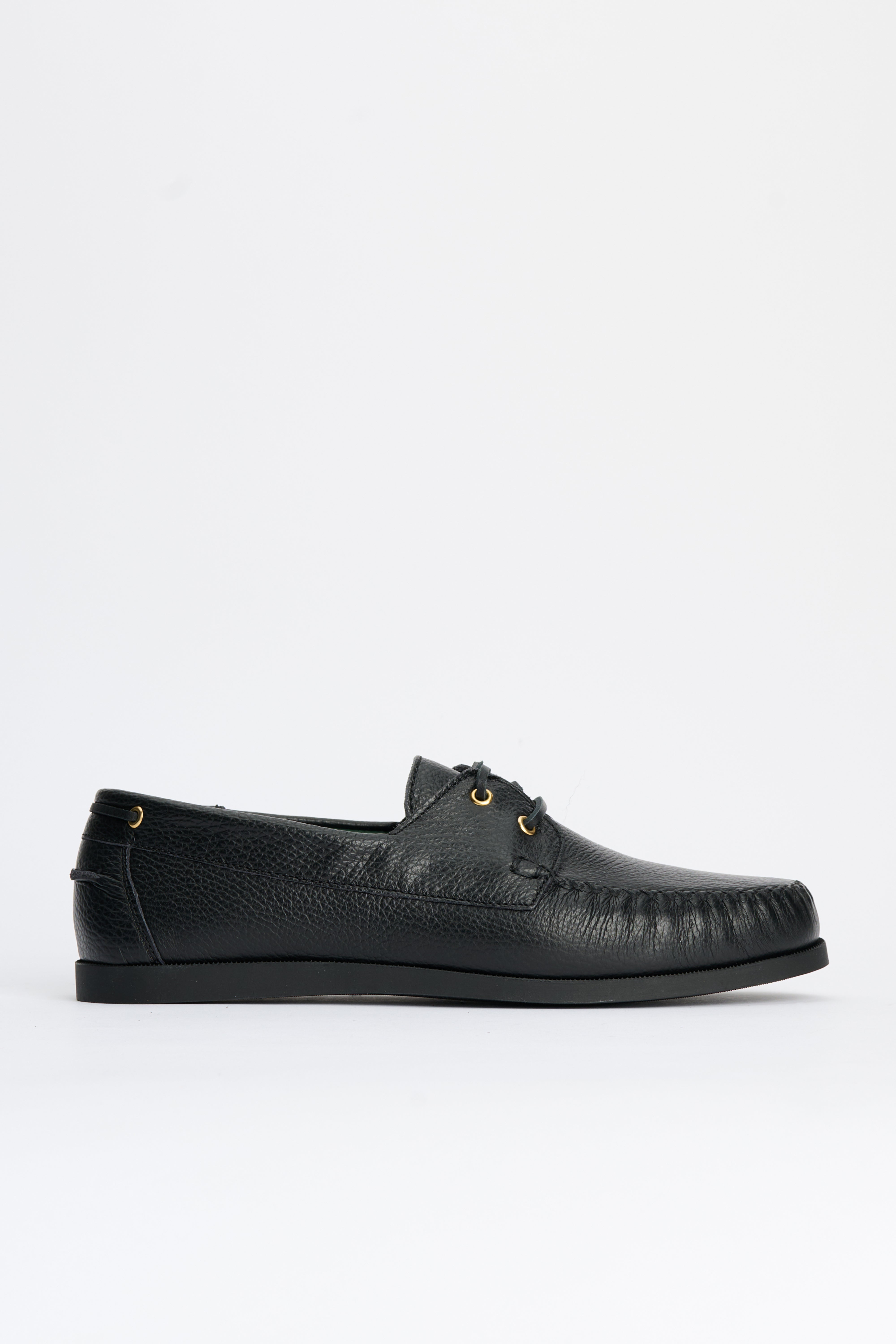 Boat shoe from VINNY’s. Designed in black grain leather with crossed hand-stitching along the apron and sidewalls. A leather-lined interior and padded insole sit inside a moccasin-attached rubber sole. The outsole features a low 15 mm lift at the heel for added support under a compact profile.