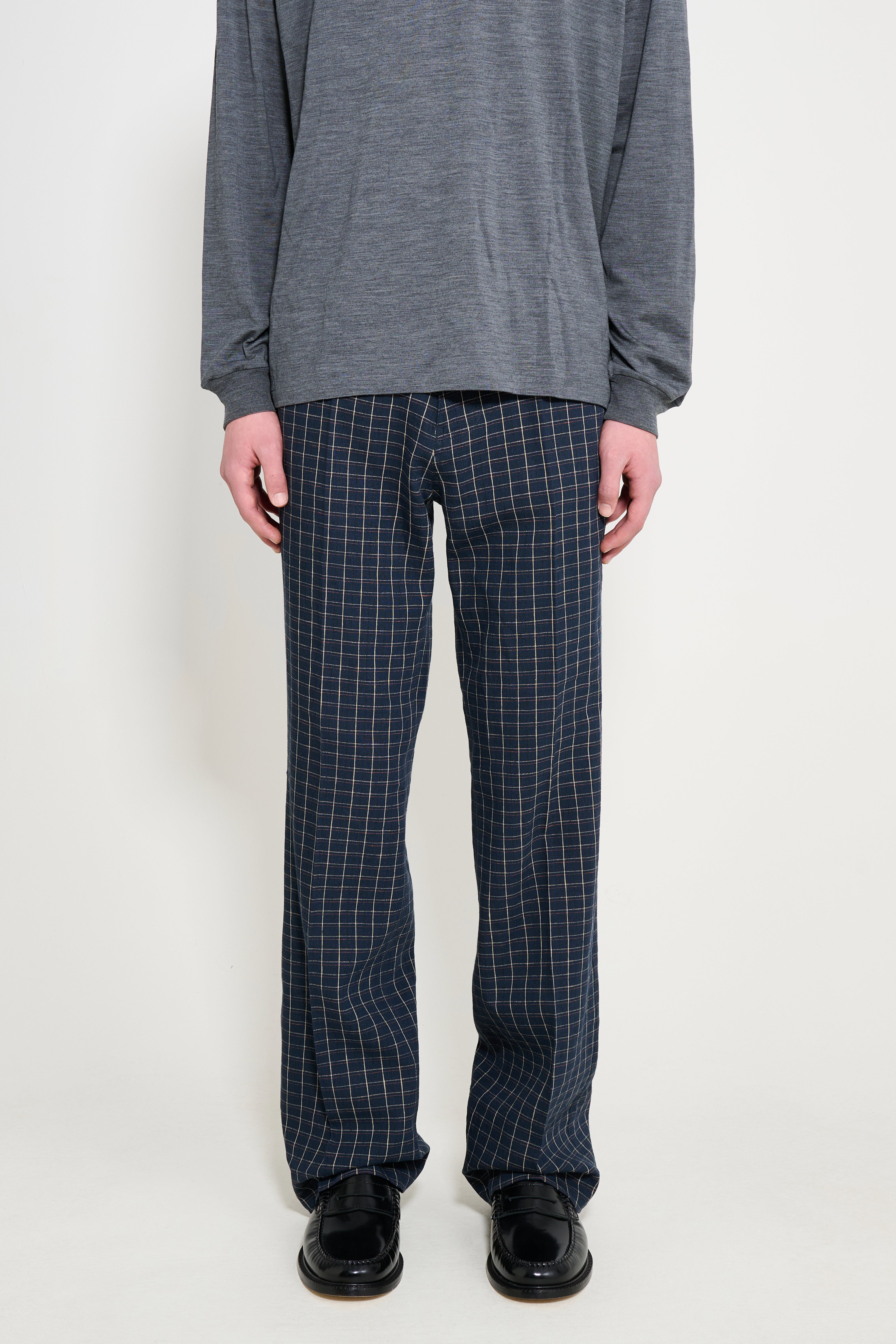 Tailored trousers from Wales Bonner. Cut in a regular profile with a structured waistband and belt loops. The design features front and back pockets with pressed creases through the legs. The navy blue base is complemented by ivory white and rust brown accents in a defined colorway.