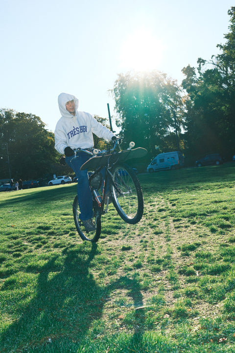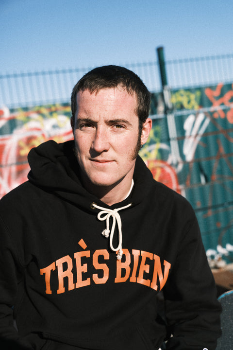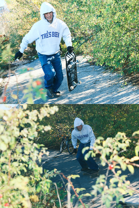 “The Reverse Weave hood has the perfect weight and a slightly boxy fit, great for movement. The kangaroo pocket is very much the right size, big enough to warm both hands and small enough not to mess with the fit of the sweater. Also, we added three layers of screen printing to ensure a rich texture and a refined tear as the garment ages.” -Hannes Hogeman CD TRÈS BIEN