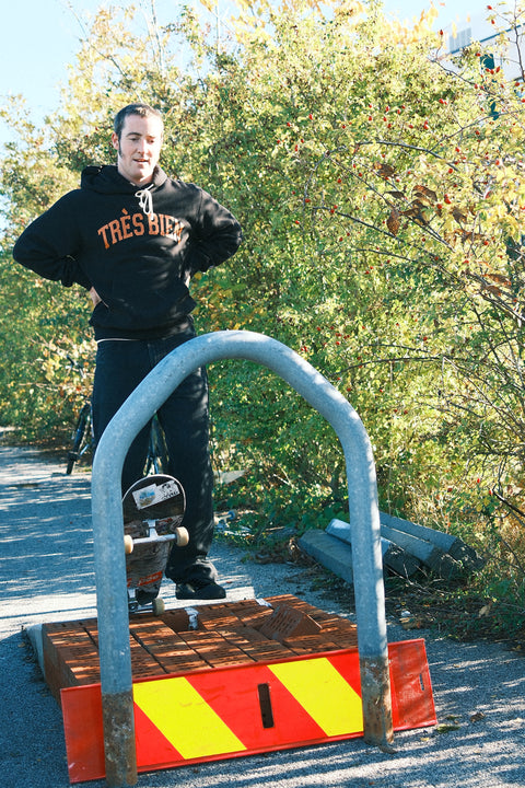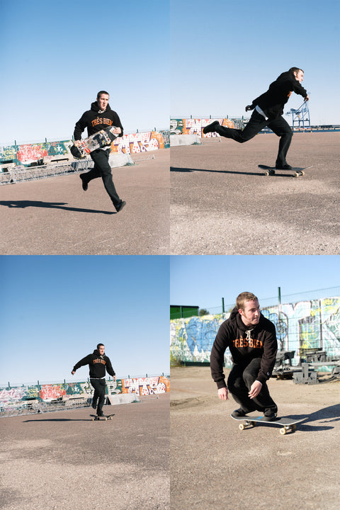 The campaign features two friends of TRÈS BIEN, Jonathan and Jamie, photographed across various locations on a sunny fall day in Malmö, Sweden.