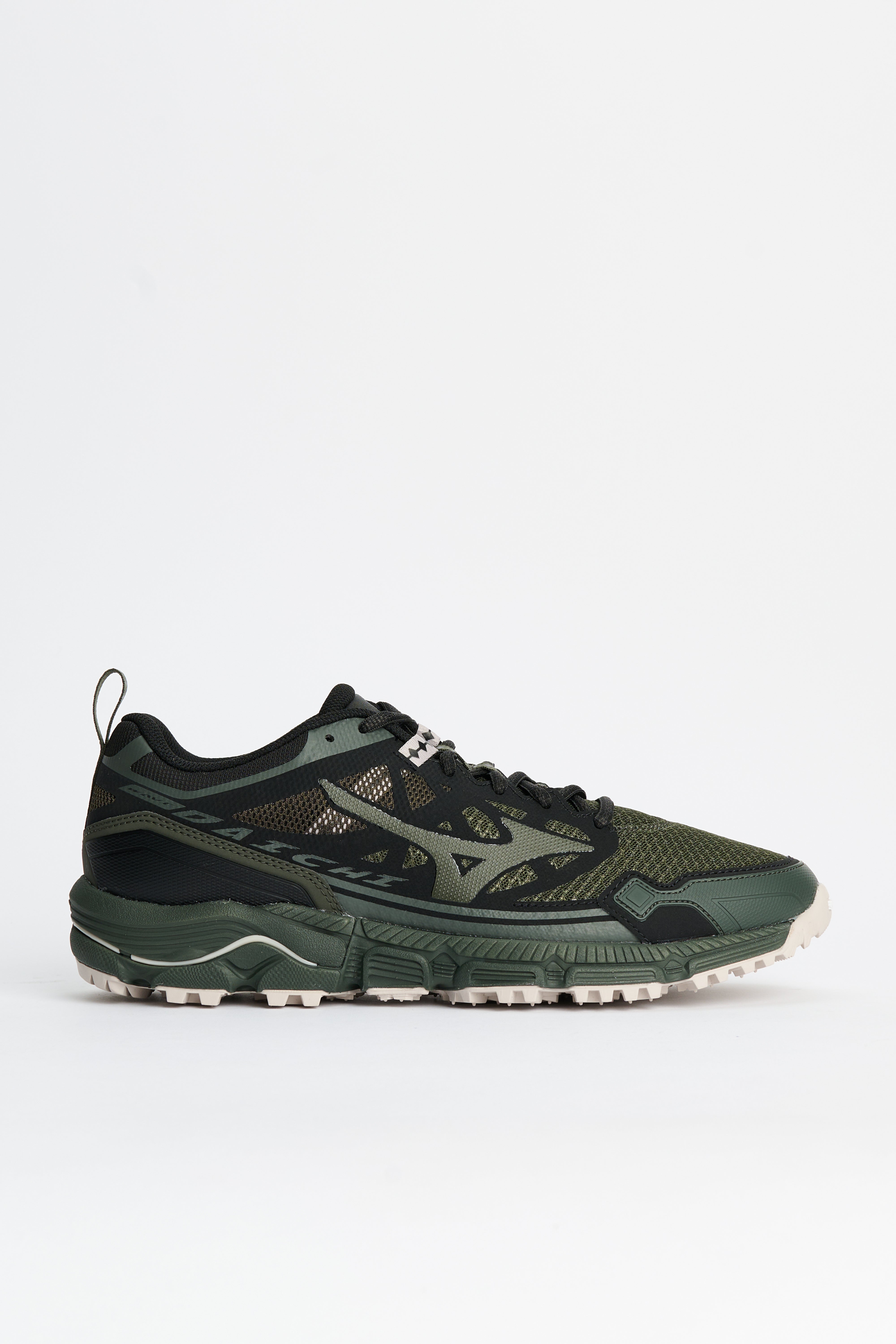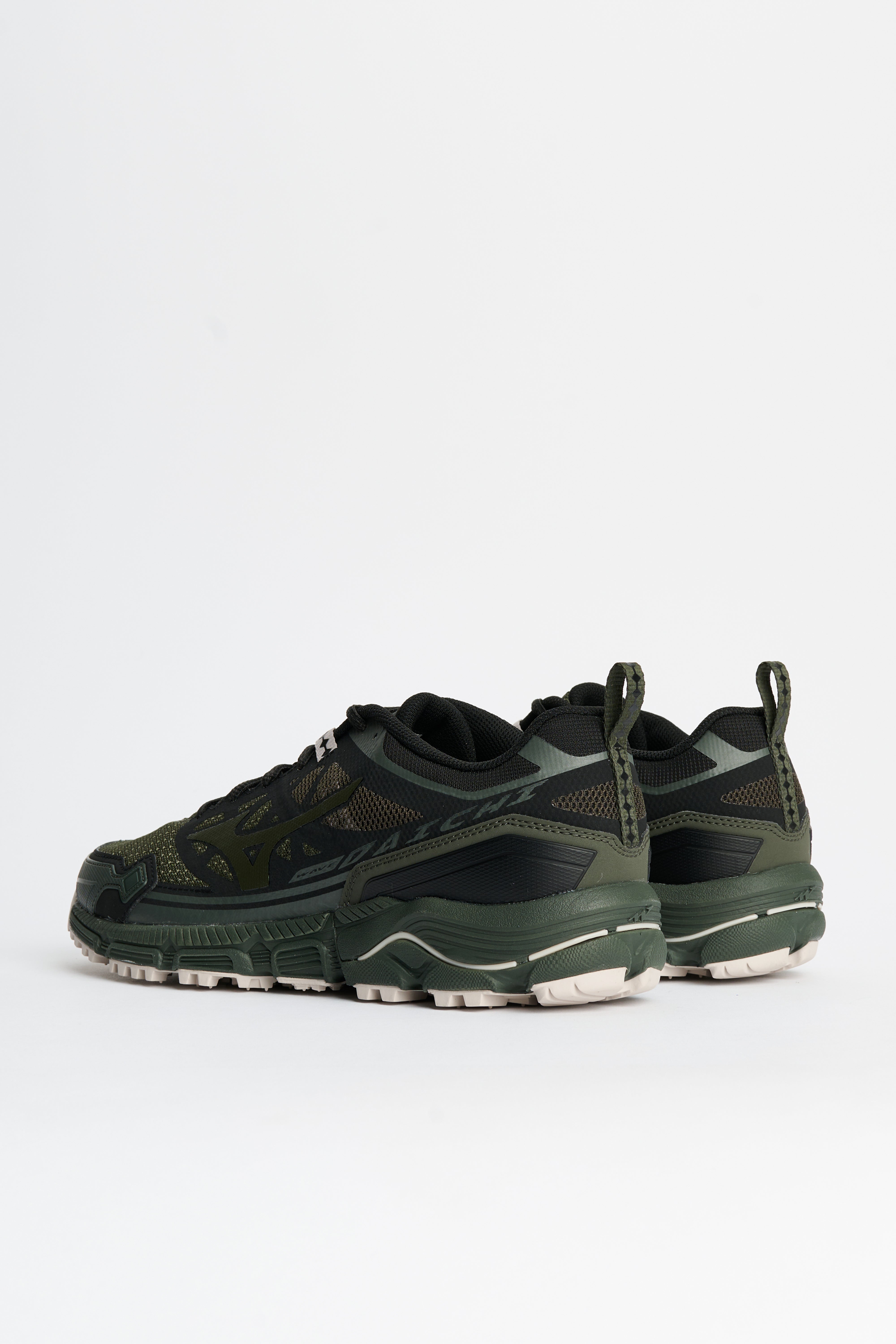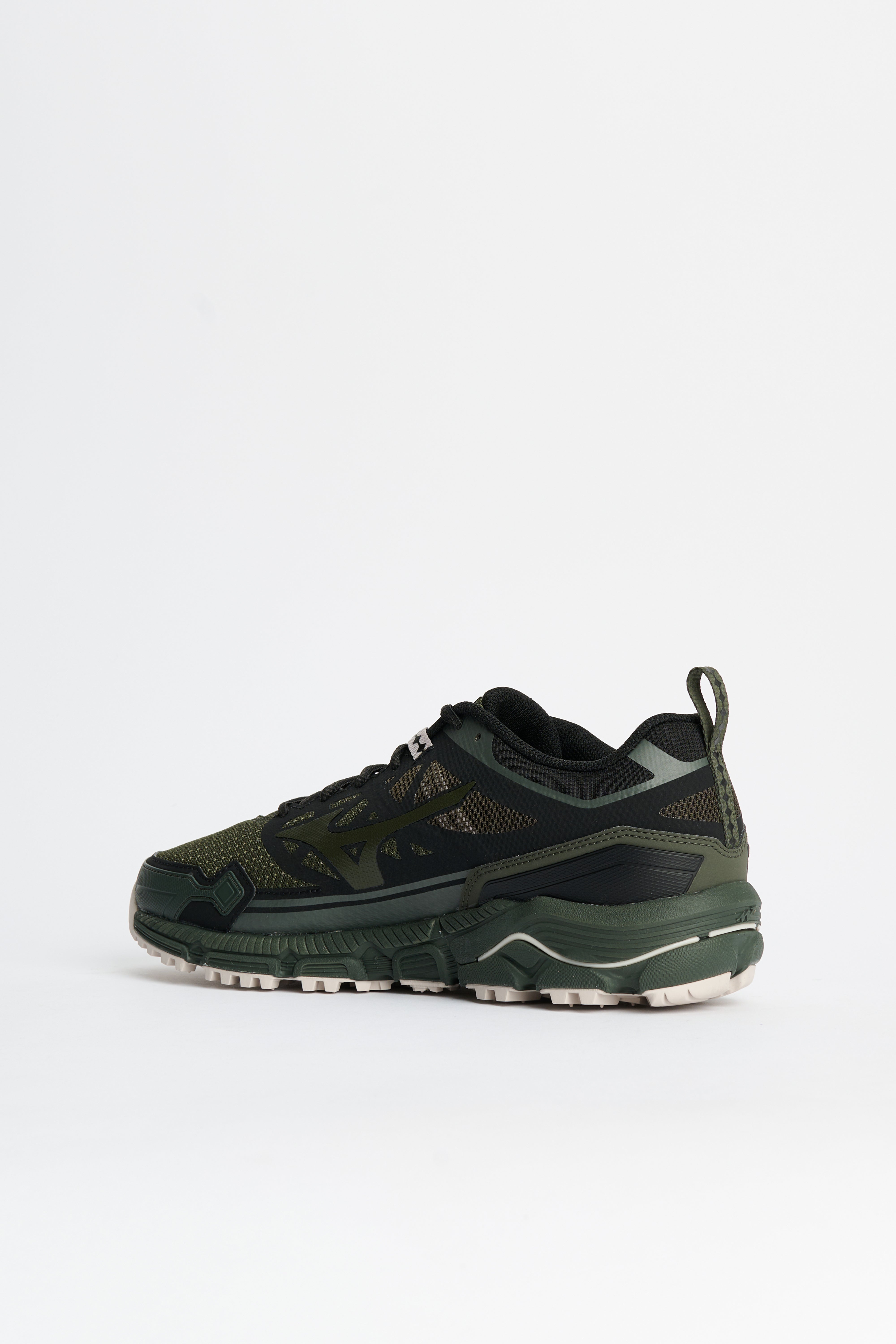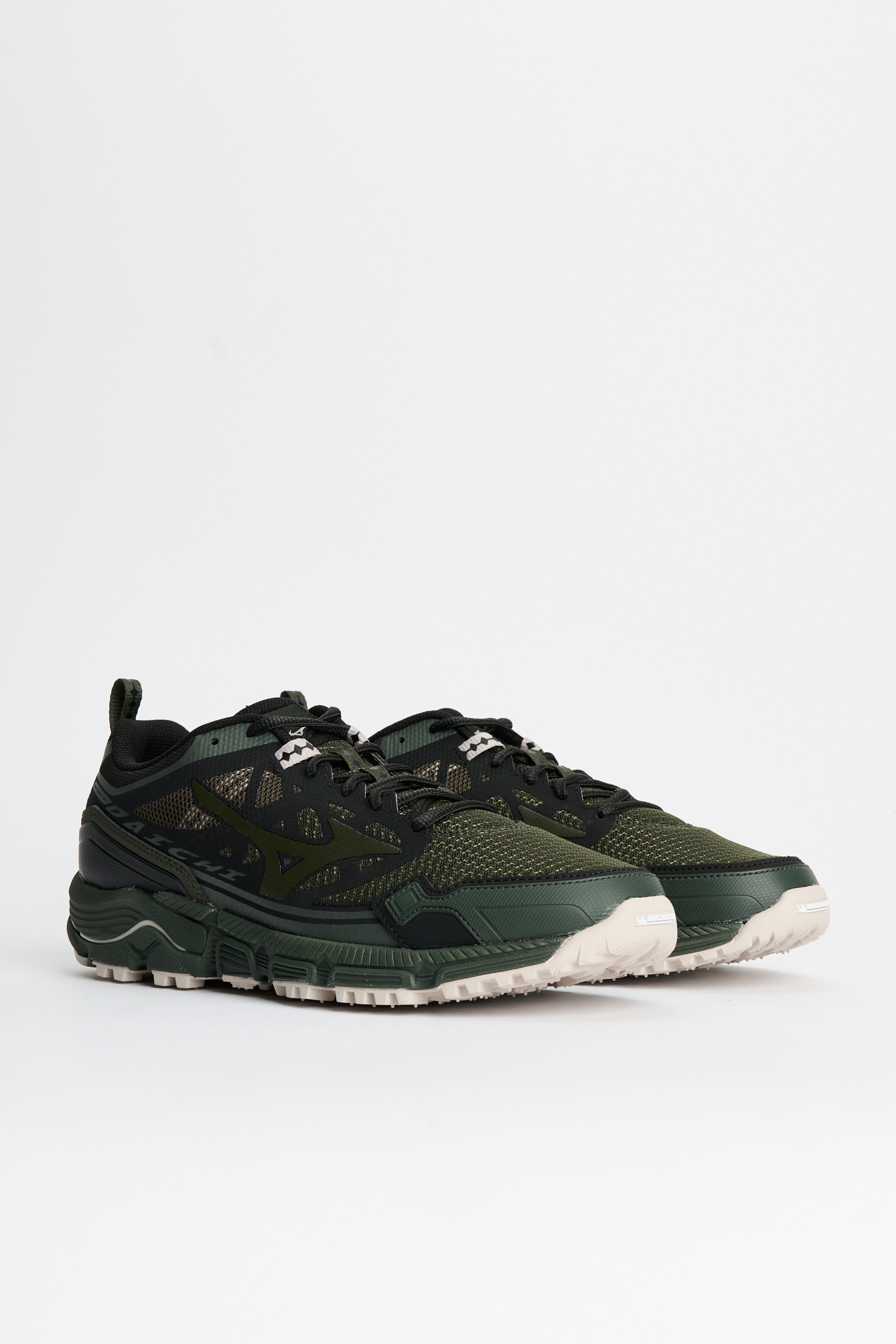 Trail sneaker from Mizuno. Mesh base with synthetic overlays and contrasting forest green and black panels. Chunky sculpted sole with rugged rubber tread. Padded tongue with branding and flat laces through webbing eyelets. Subtle logo hits on the side and heel.