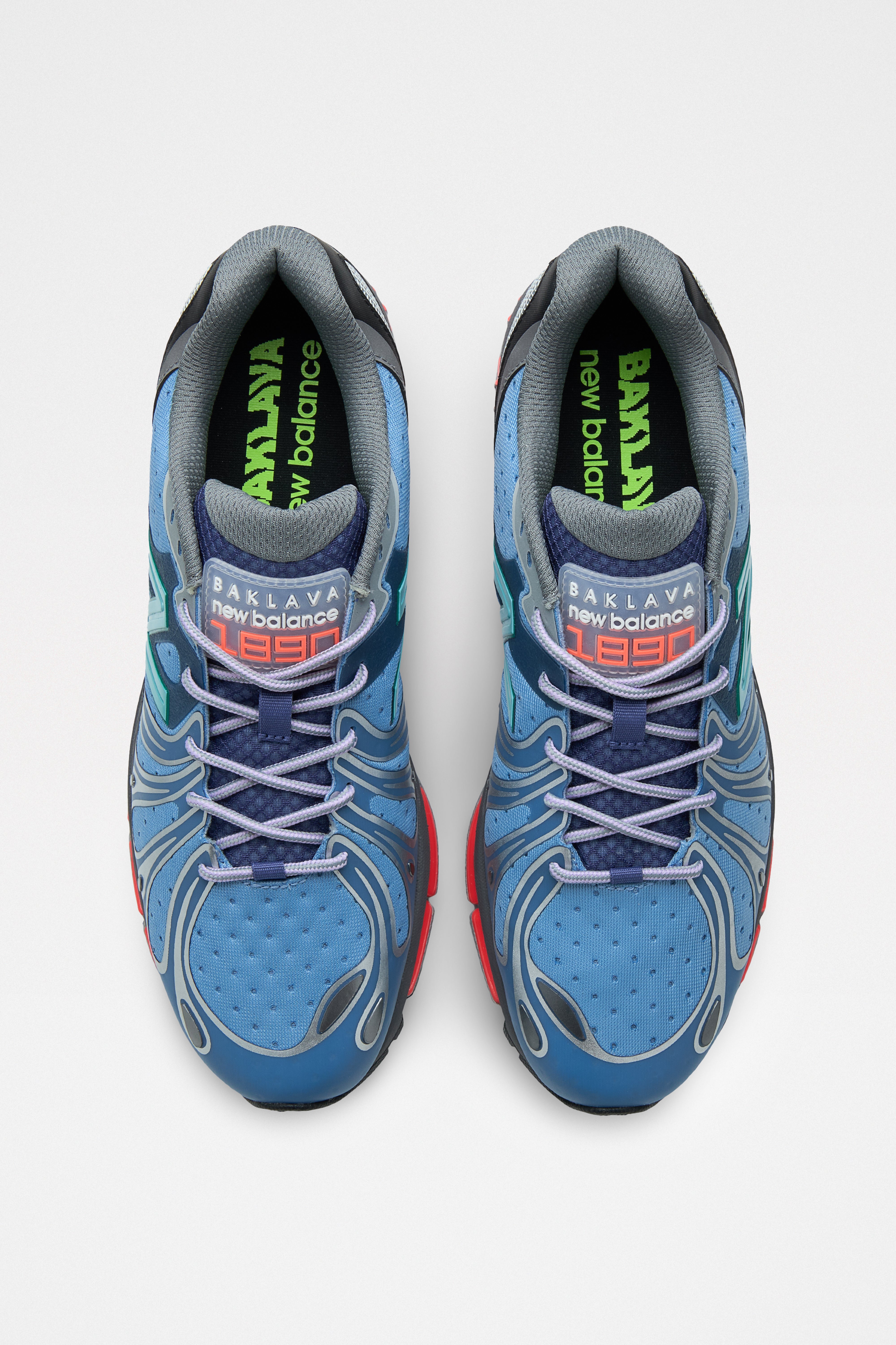 Running shoes from New Balance x Action Bronson. A mesh base sits under sculpted wave cutout overlays in synthetic TPU. Lightweight polywoven construction appears across the upper with reflective accents on select panels. Underfoot, a cushioned midsole with squared sidewall pods meets a durable rubber outsole. Co-branding and Baklava tongue details across the design.