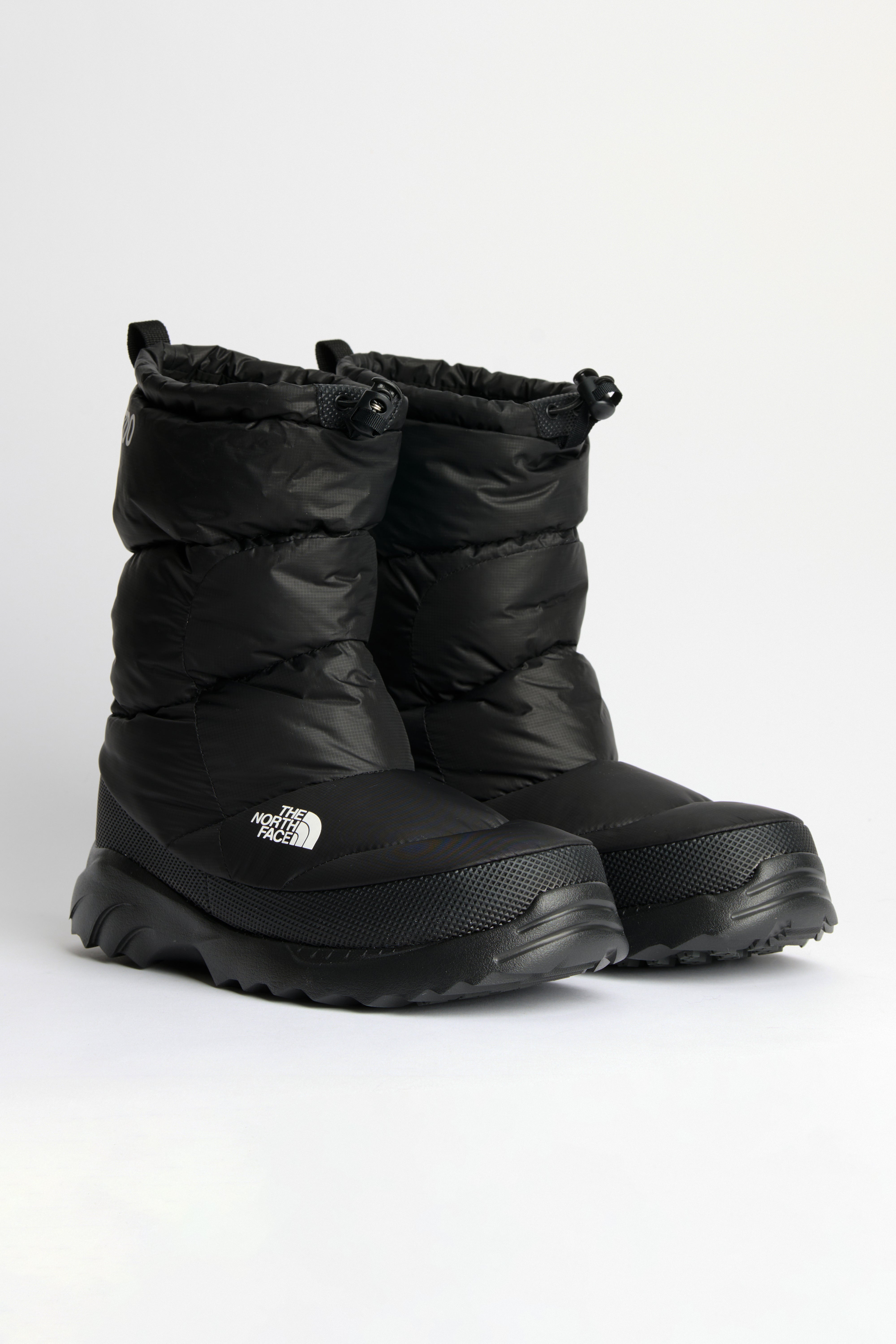 Apres boots from The North Face. Polyester ripstop uppers house 700‑fill down insulation with quilted baffles. The slip‑on shaft rises above the ankle. Underfoot, a rubber outsole with IcePick temperature‑sensitive lugs improves grip in cold conditions. The silhouette references Nuptse outerwear lines with bold quilting and branding on the side.