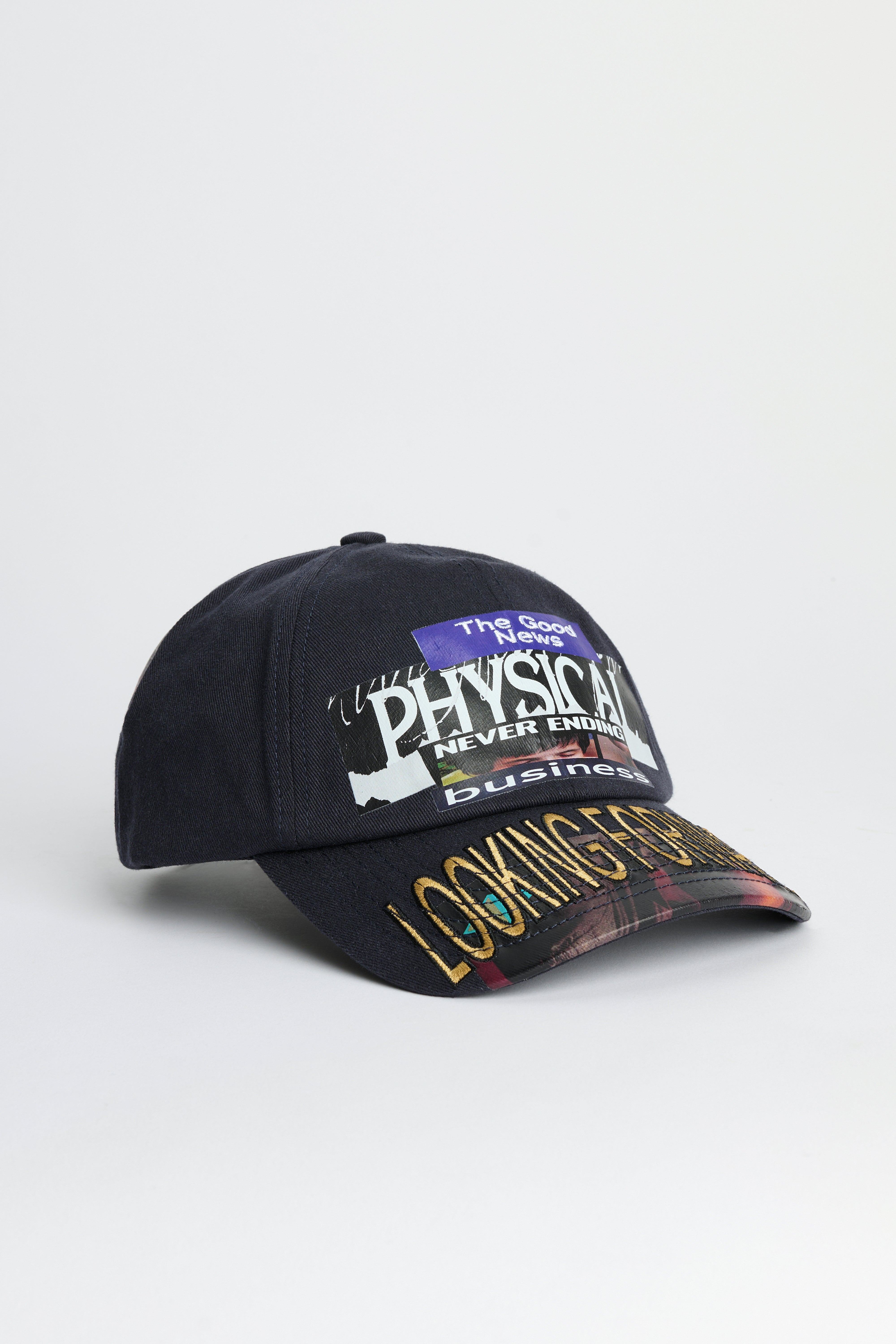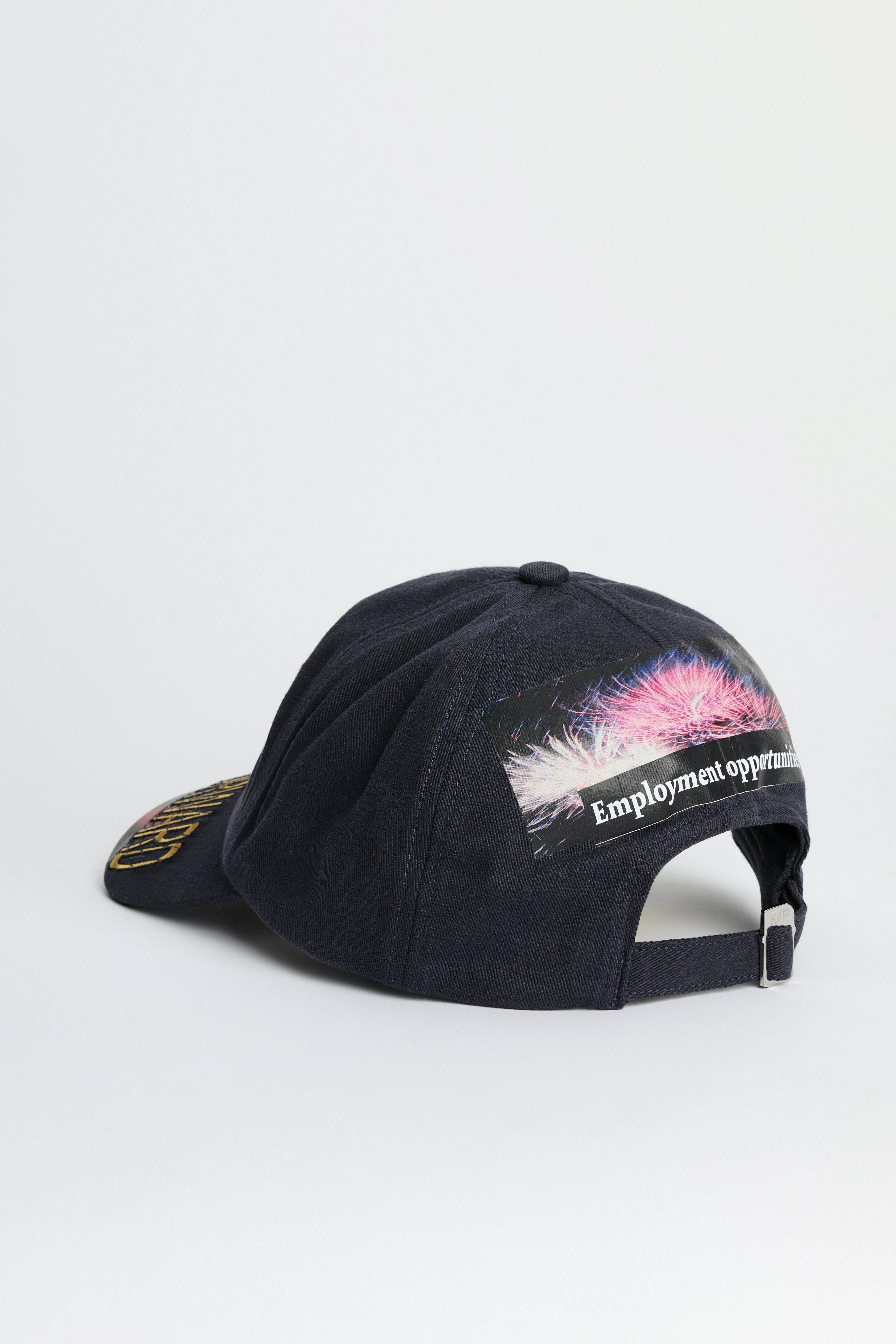 Cap from KAP made in collaboration with graphic artist Ehsan Morshed. Features a mix of embroidery and printed graphics at the front, and “Employment opportunities” print on the back panel. Designed with a six-panel unstructured construction, a curved brim and an adjustable strap with a stainless steel SIM card buckle.