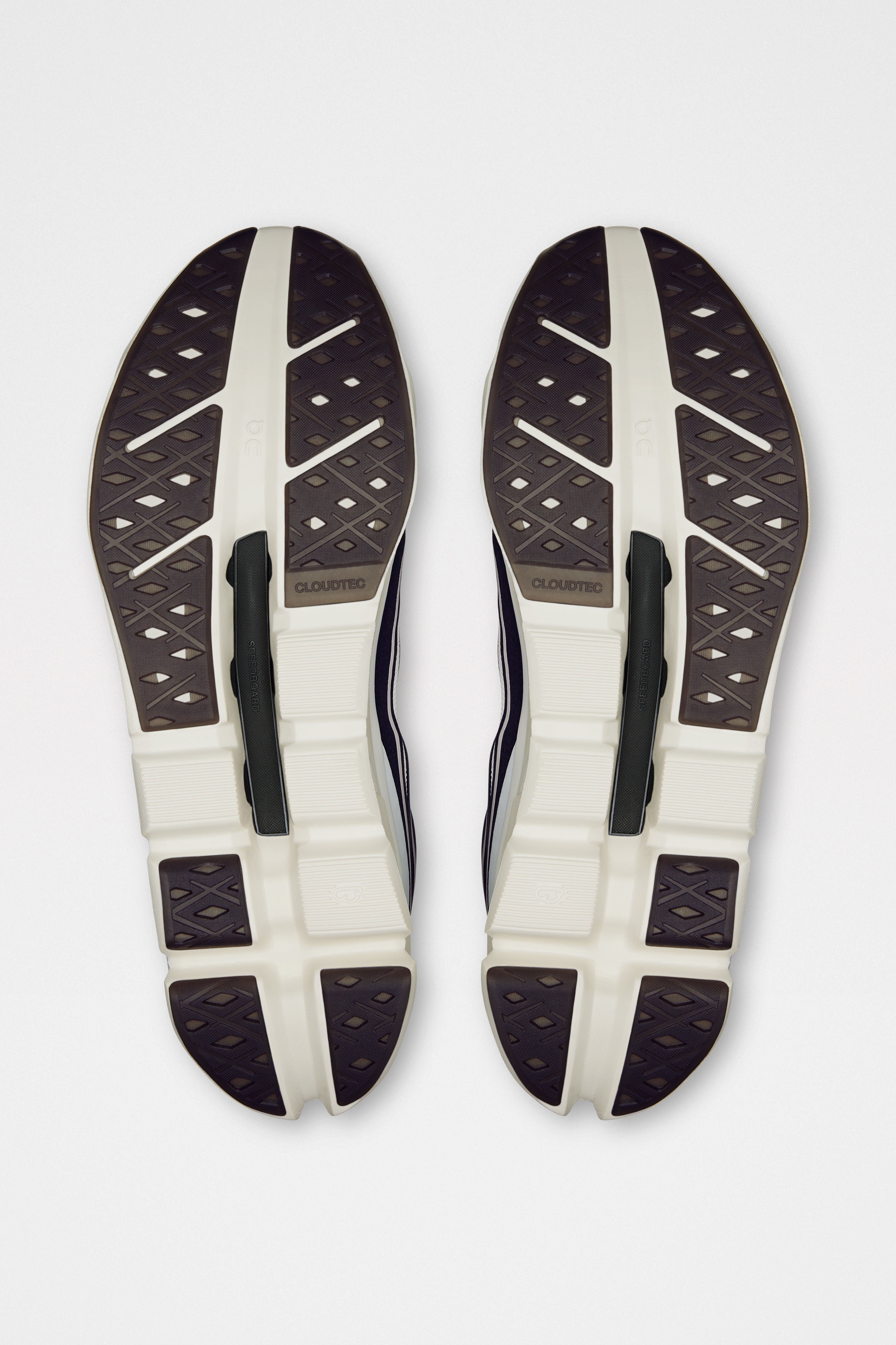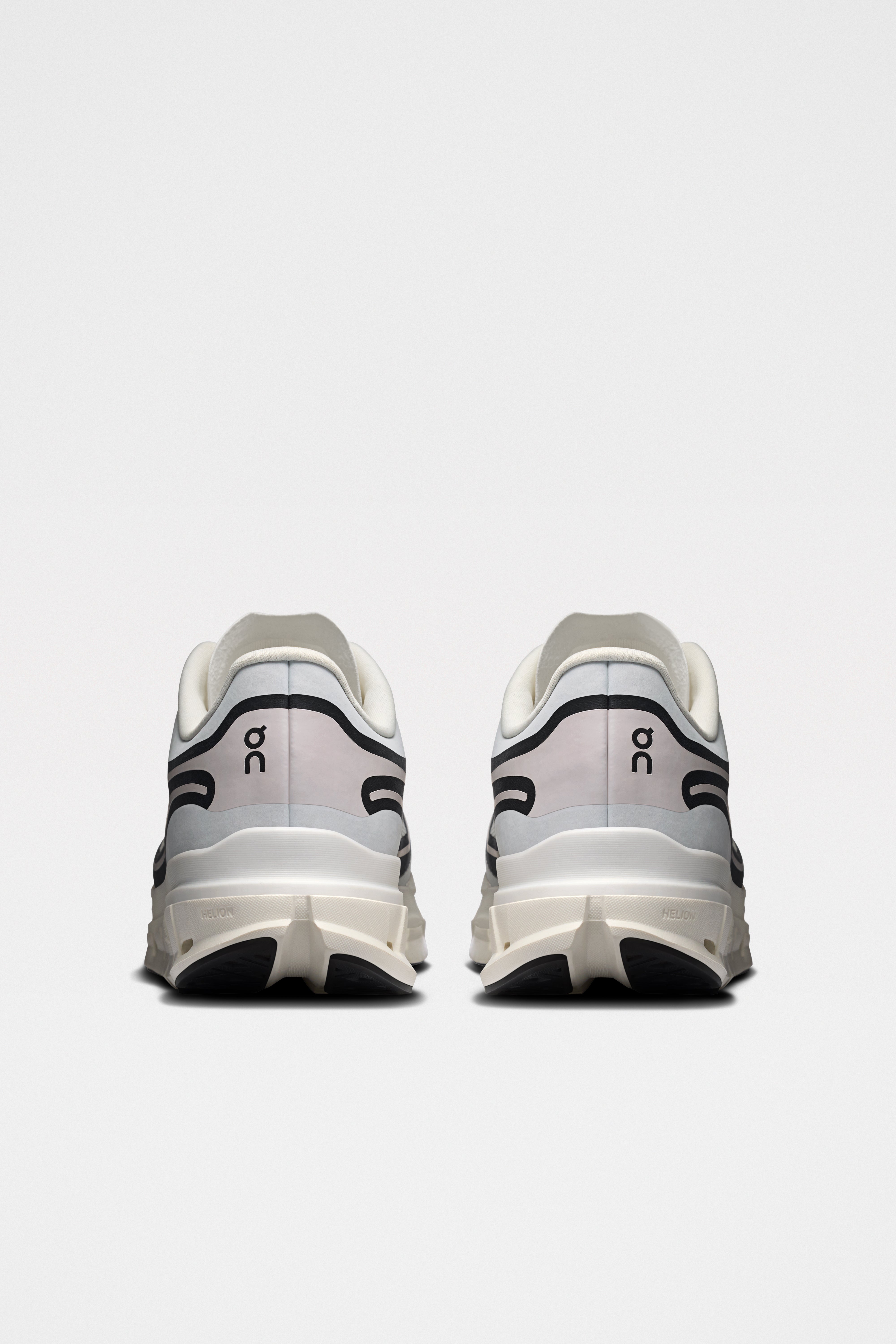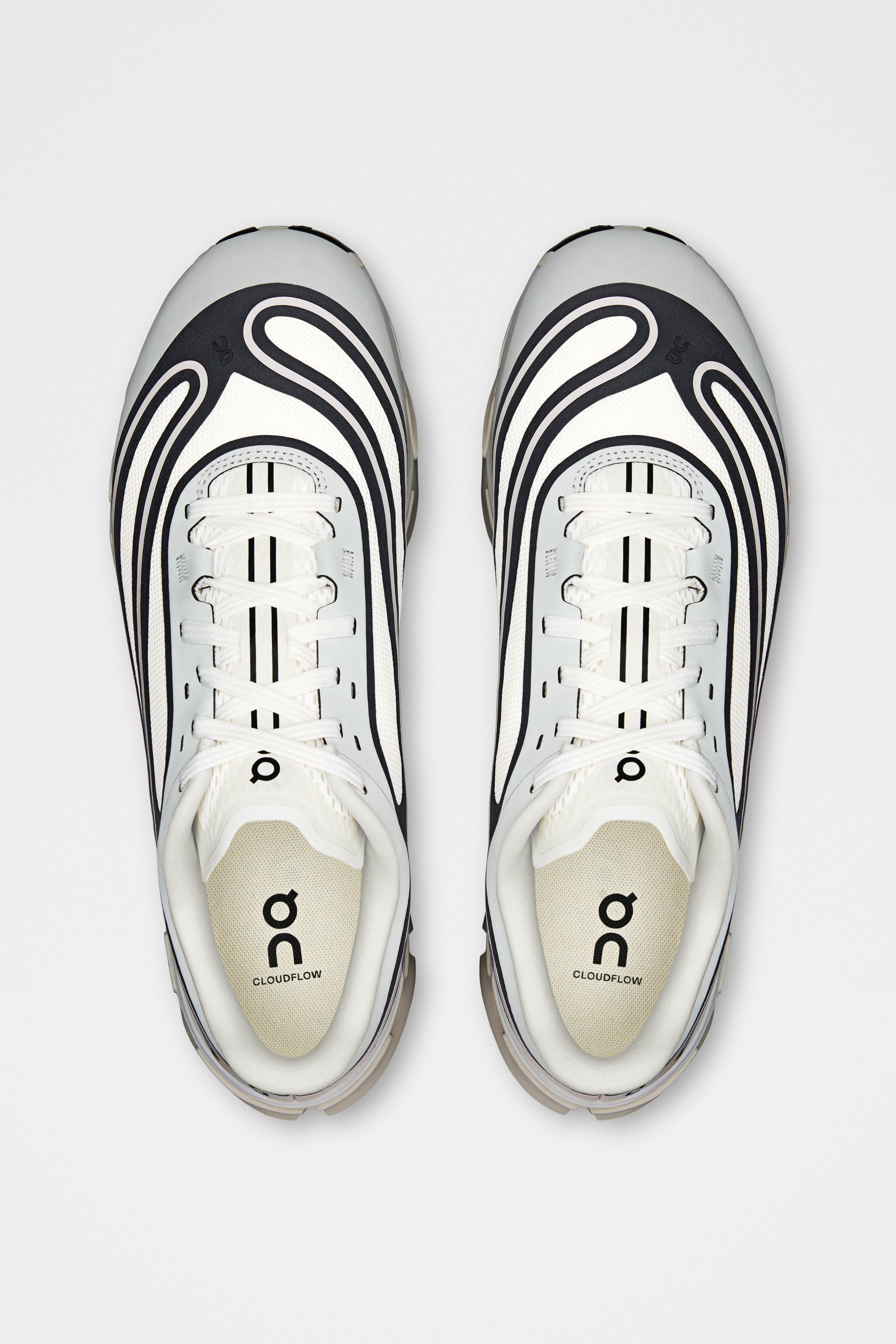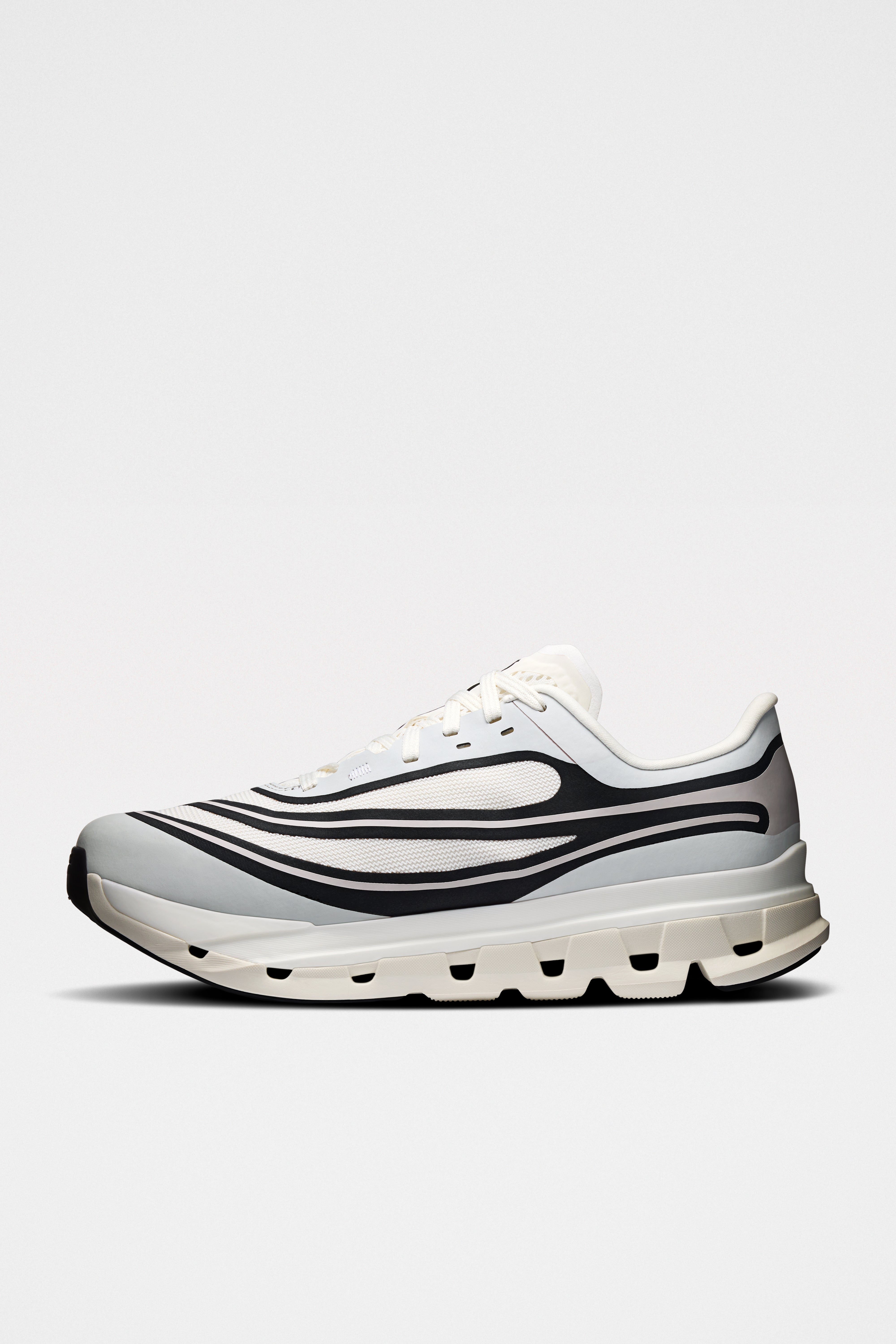 Running shoes from On. Cloudflow 5 AD design with a textile and synthetic upper in ivory white and black. CloudTec cushioning and Helion HF foam in the midsole for impact absorption and energy return. A padded collar and tongue frame the ankle. A rubber outsole with a defined tread pattern underfoot for road traction.