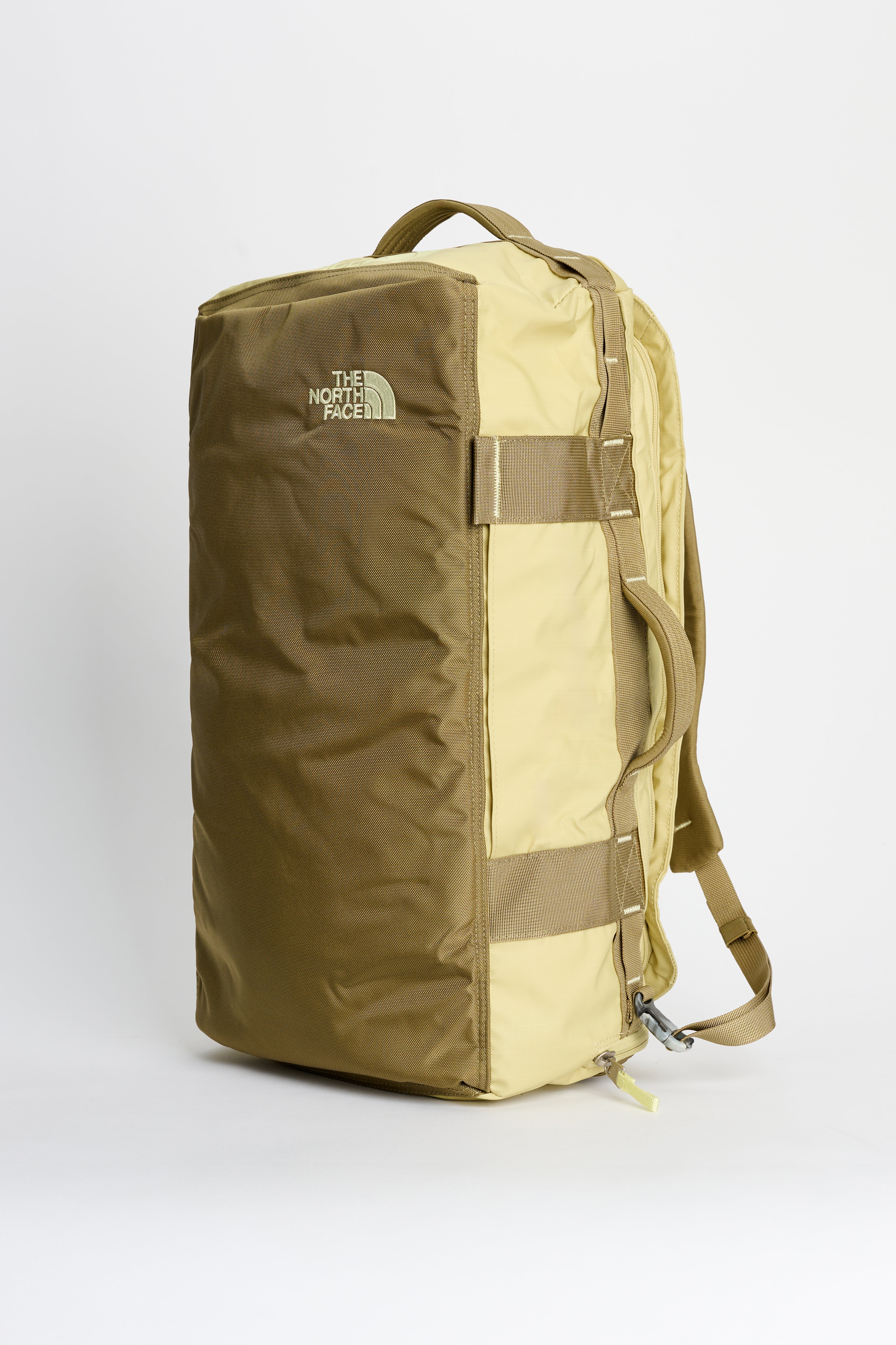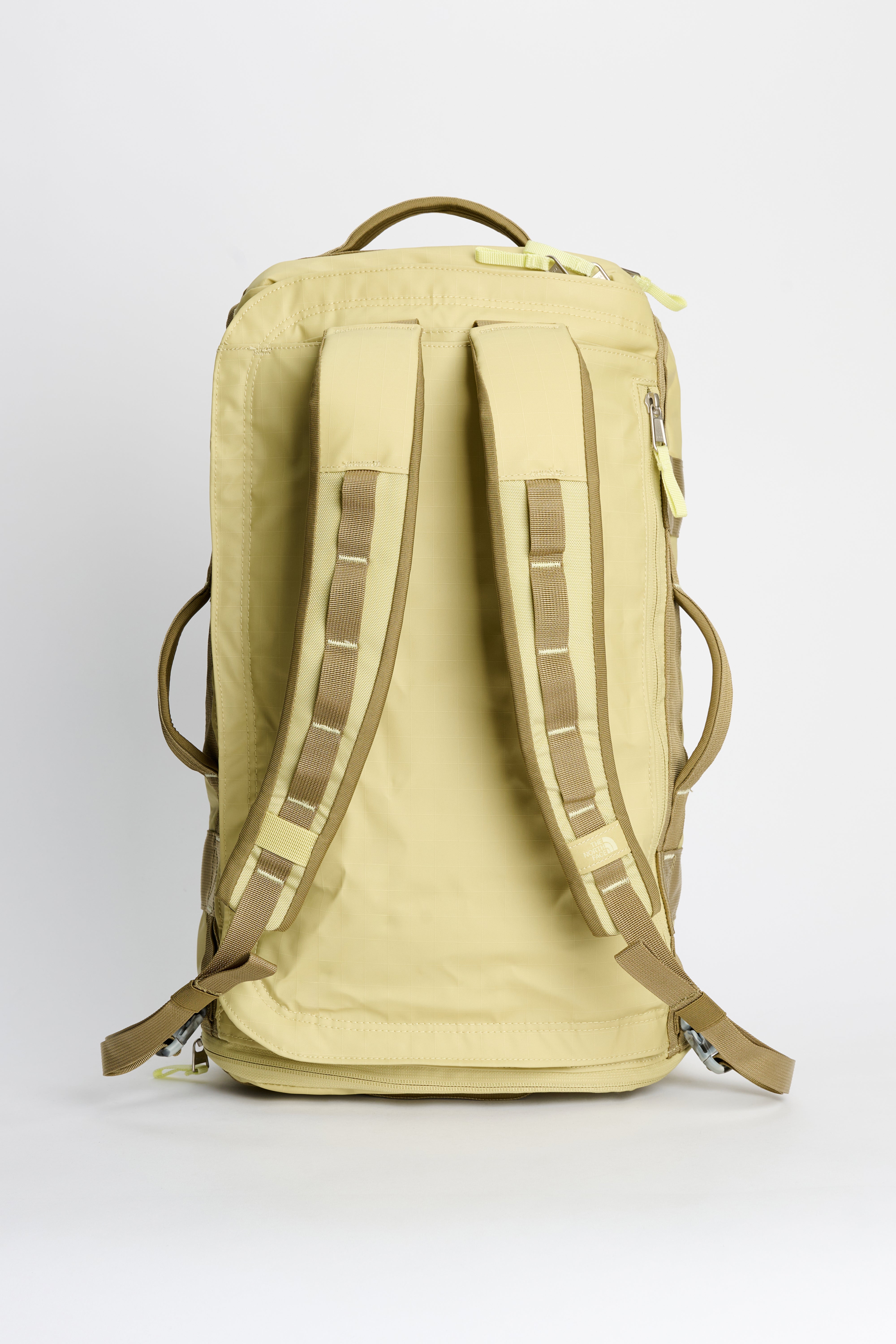 Duffel bag from The North Face. Constructed from recycled polyester with TPU laminate in pear green, cedar brown and lemon mist yellow. Features a 32-liter main compartment with wide U-zip lid, internal divider and mesh pocket. Includes stowable padded shoulder straps for backpack carry, external 15-inch laptop sleeve, small zip pocket, lash points and side water bottle pocket.