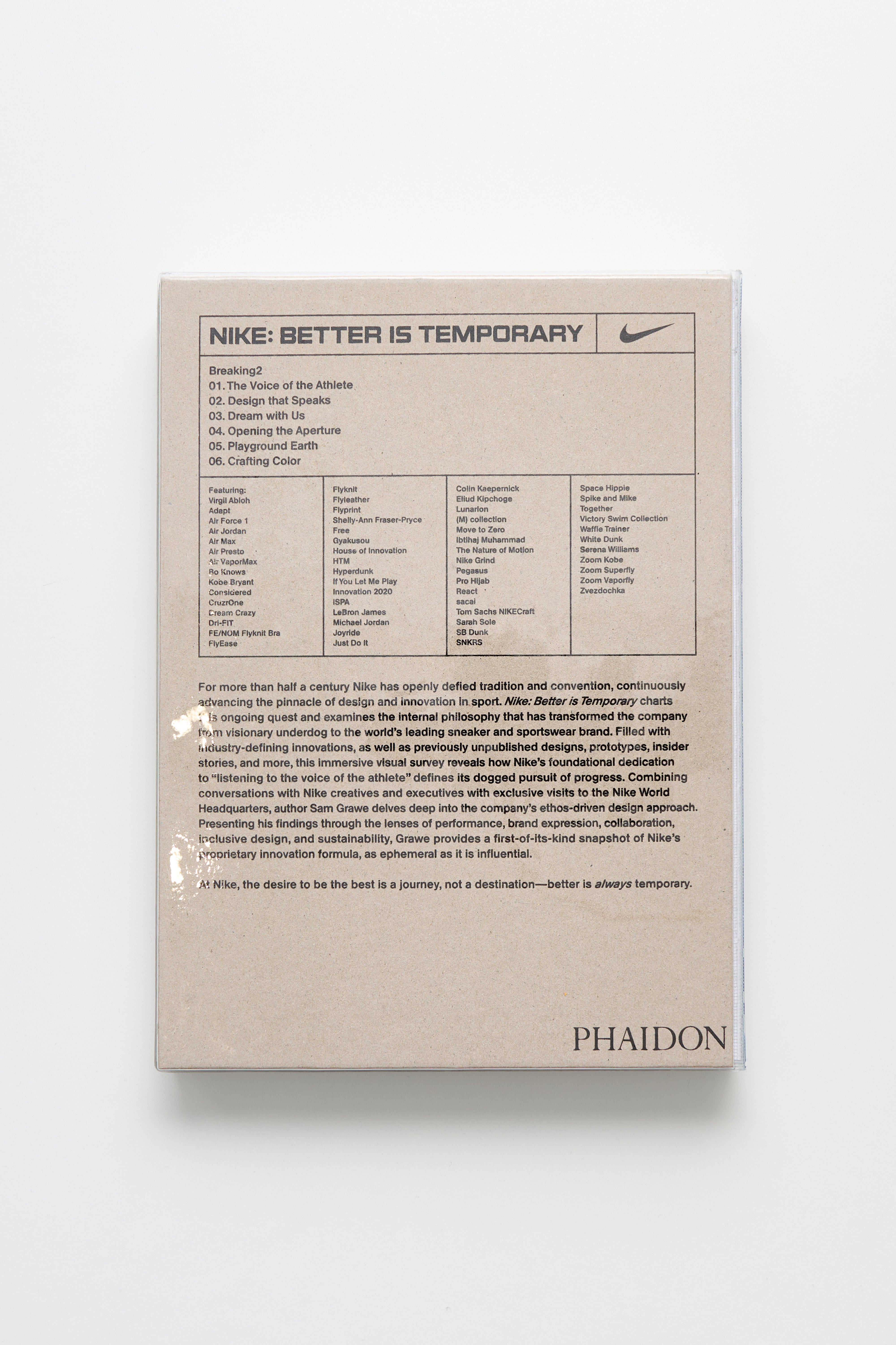 Book written by Sam Grawe and published by Phaidon. Documents Nike’s design history through archival material, internal narratives and previously unpublished designs. Includes over 500 illustrations spanning product development, graphics and research.