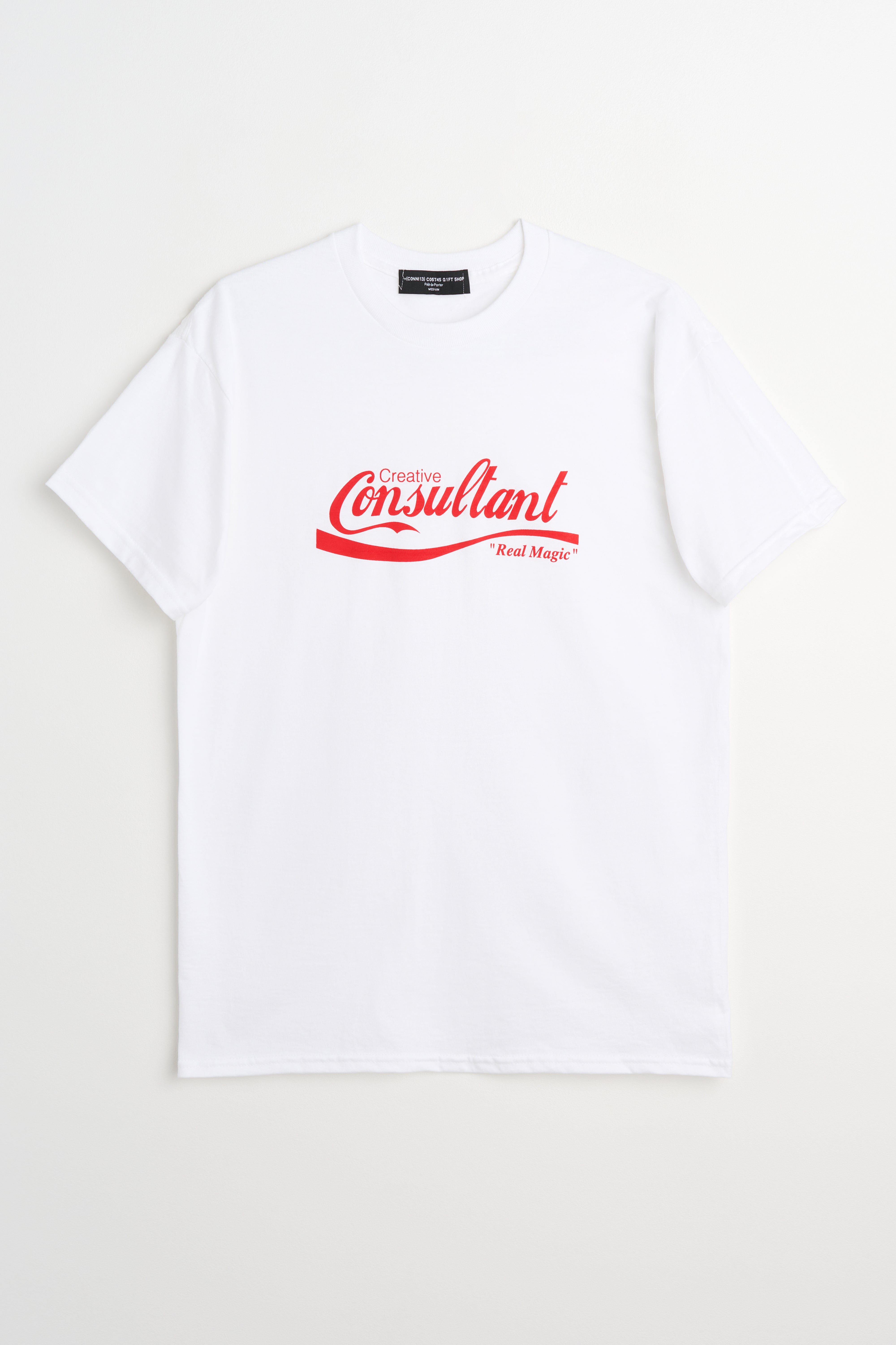 Graphic t-shirt from Connie Costas. Features a Creative Consultant text motif on the chest. Cut in a regular shape with set-in sleeves. Finished with a ribbed neckline, double-stitched cuffs and hem, and a solid white base. No print on the back.
