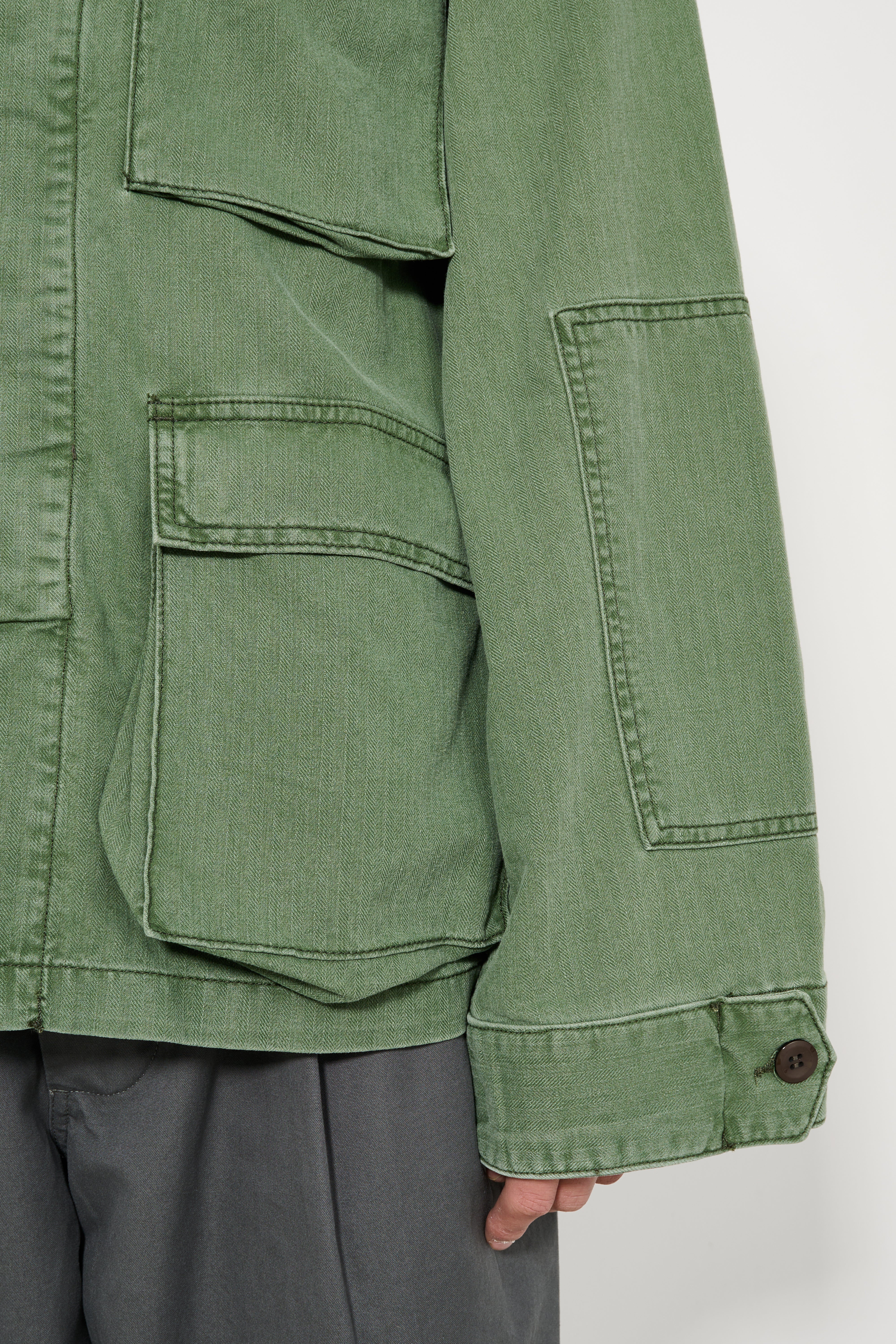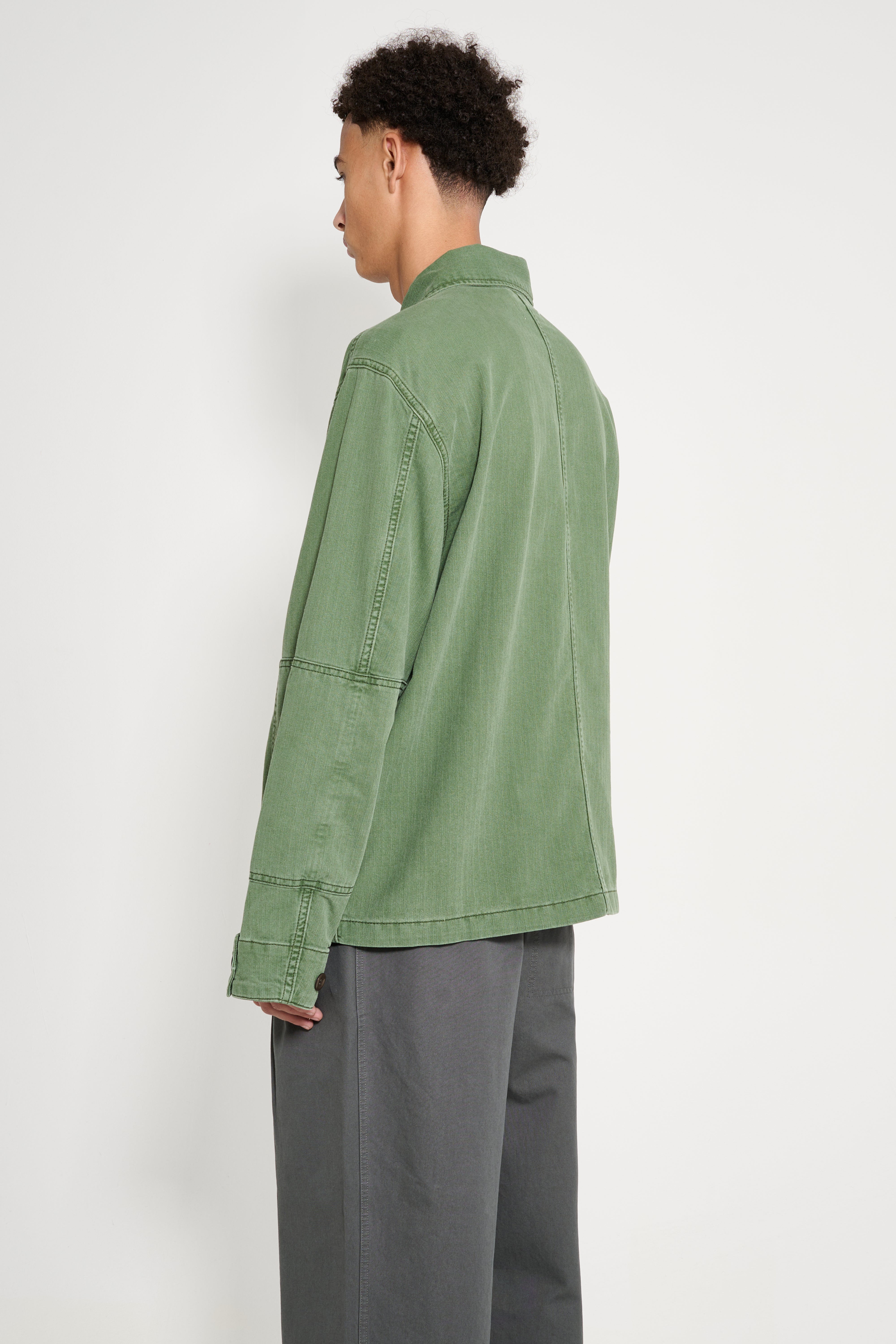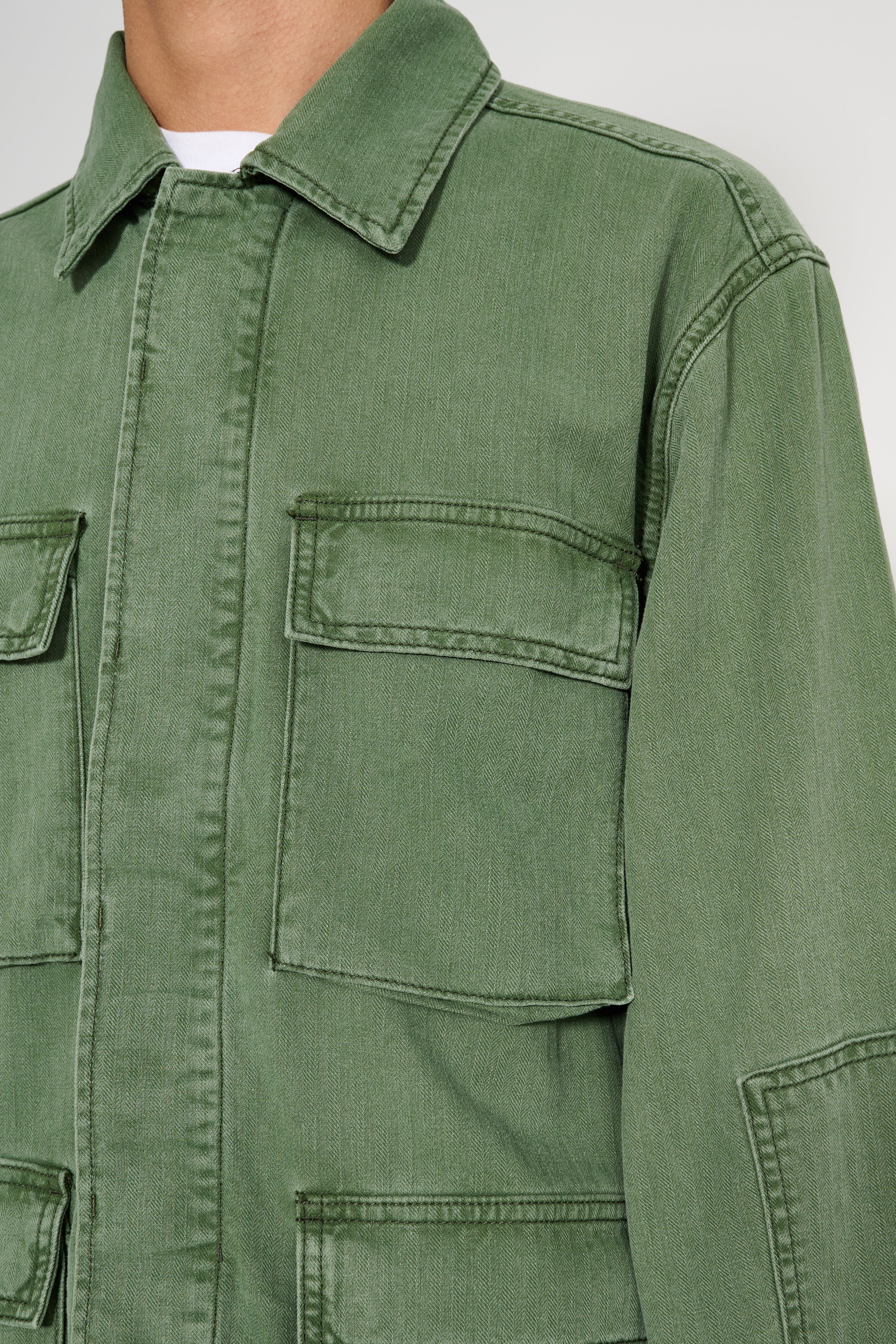 Jacket from Jeanerica. Luc is cut from chevron green cotton-blend fabric with a straight silhouette and unlined construction. A hidden button placket runs along the front. Four patch pockets sit on the chest and lower body. Buttoned tabs adjust the cuffs. Shoulder detailing and a classic collar reference heritage army pieces.
