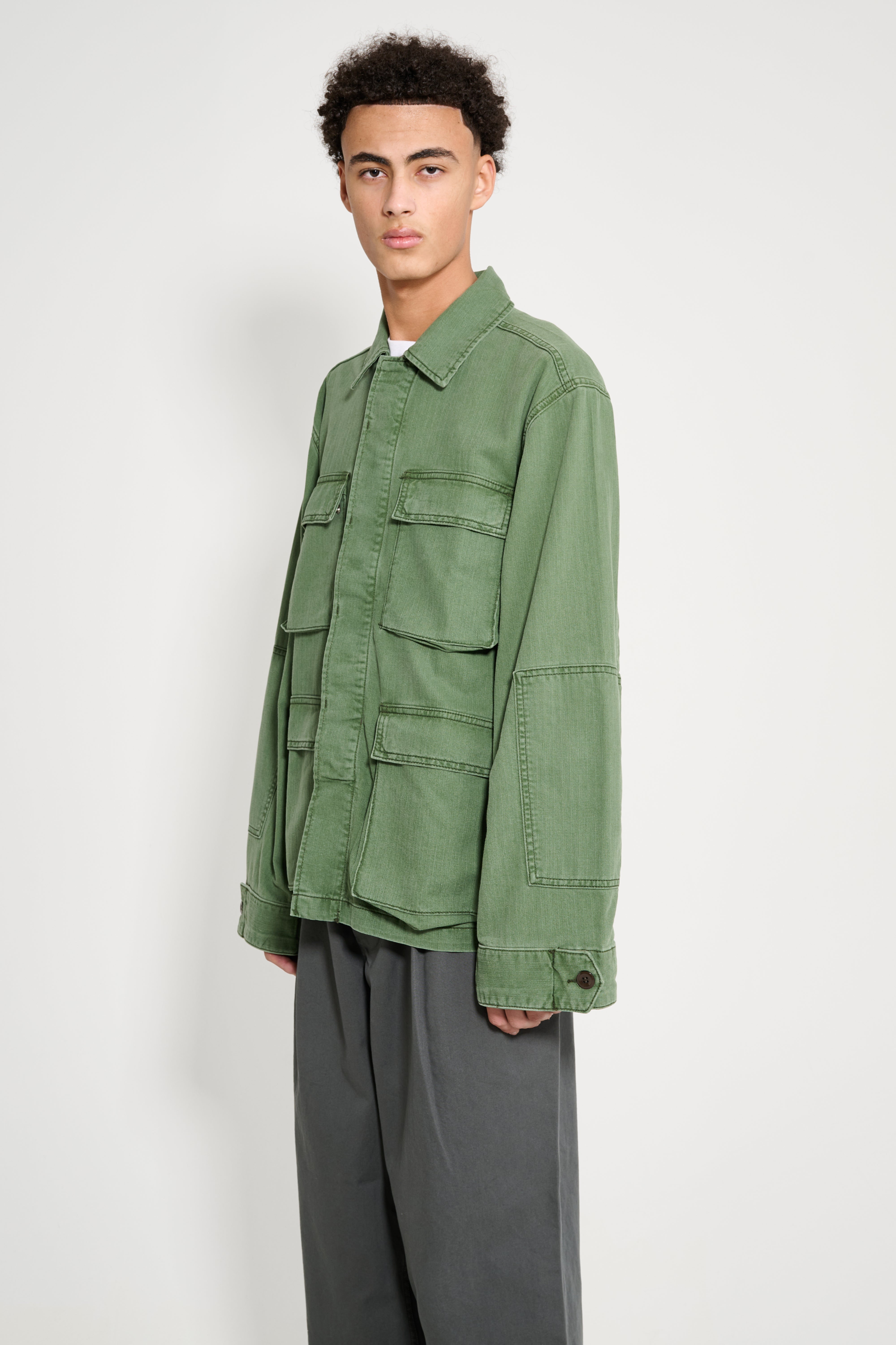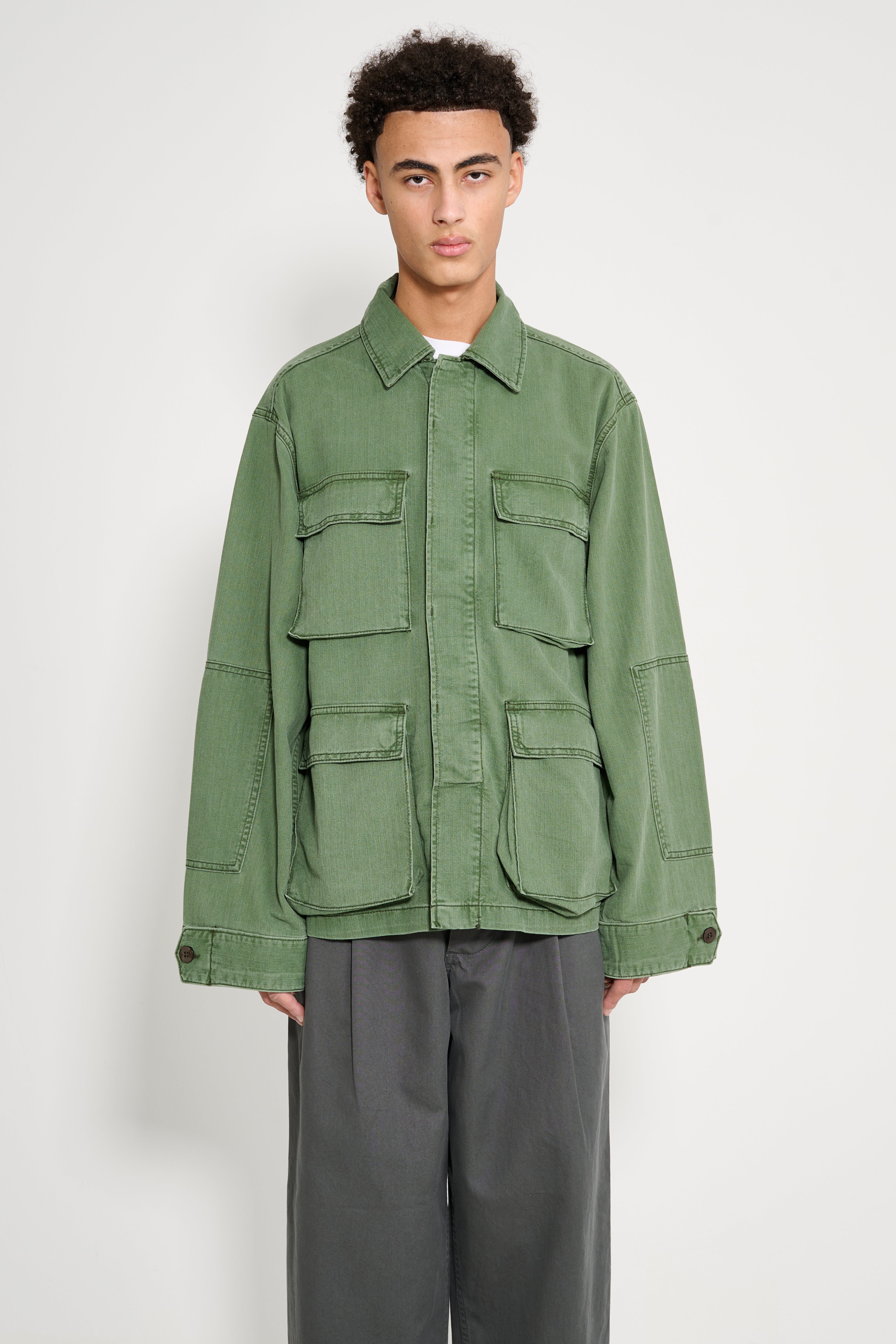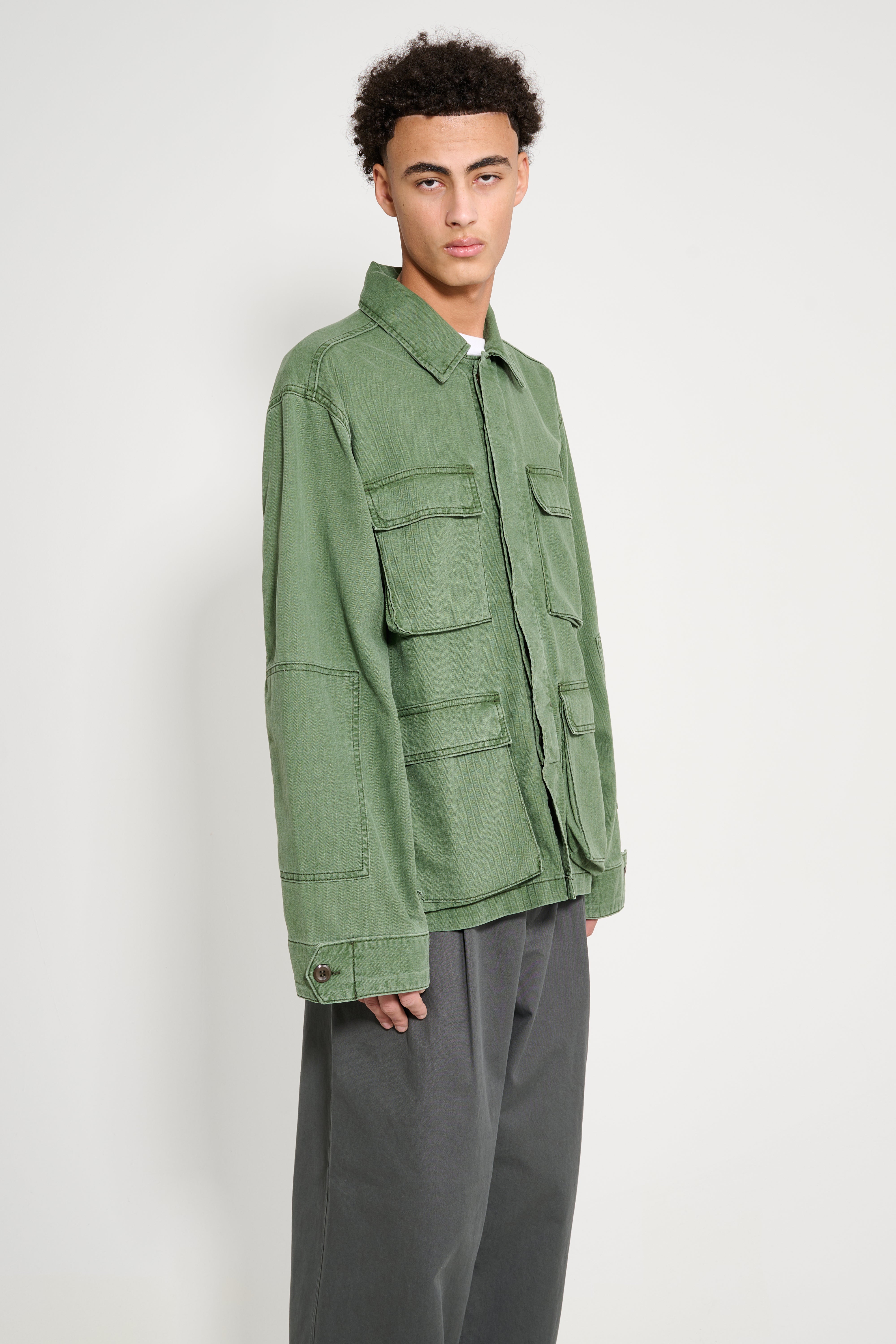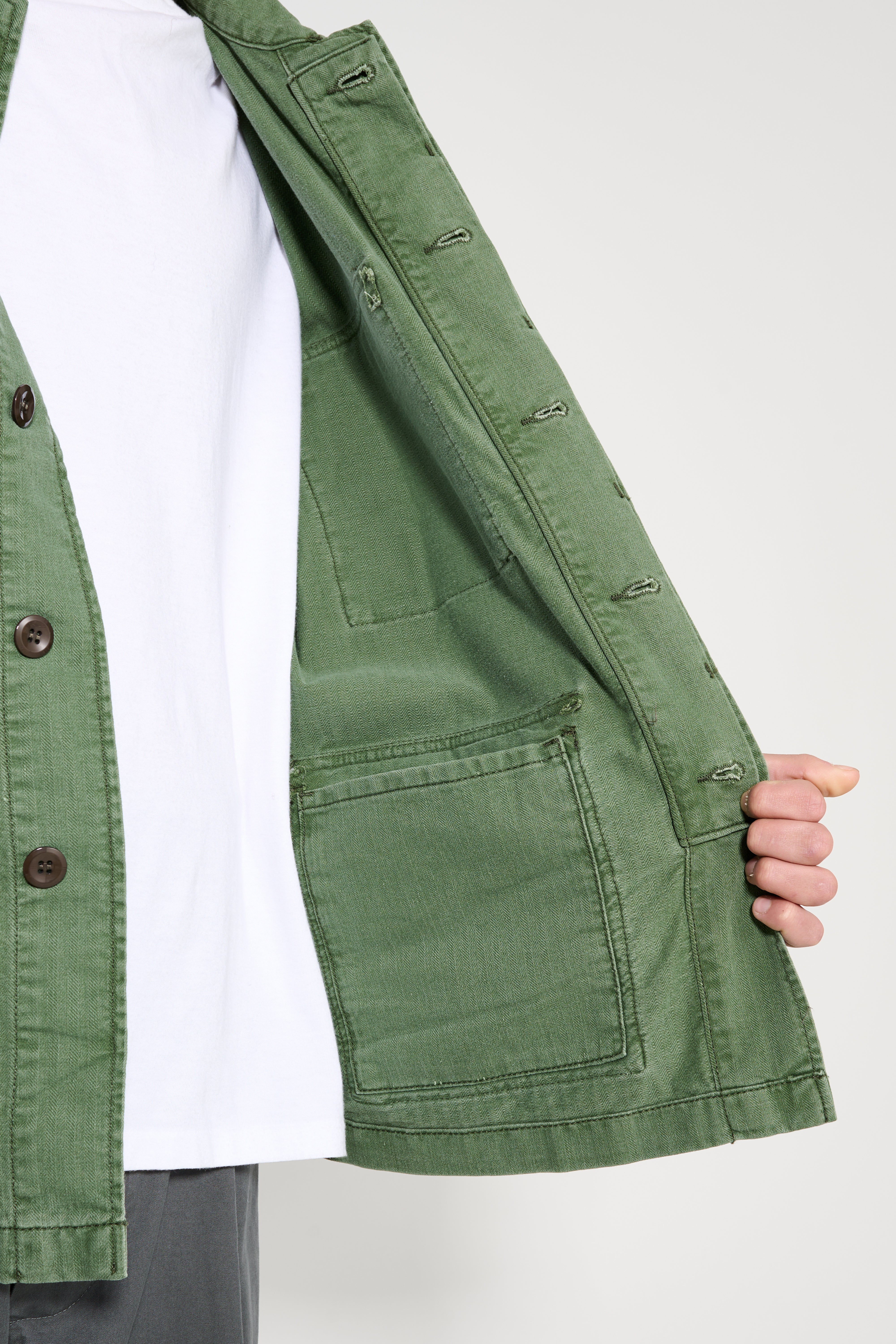 Jacket from Jeanerica. Luc is cut from chevron green cotton-blend fabric with a straight silhouette and unlined construction. A hidden button placket runs along the front. Four patch pockets sit on the chest and lower body. Buttoned tabs adjust the cuffs. Shoulder detailing and a classic collar reference heritage army pieces.