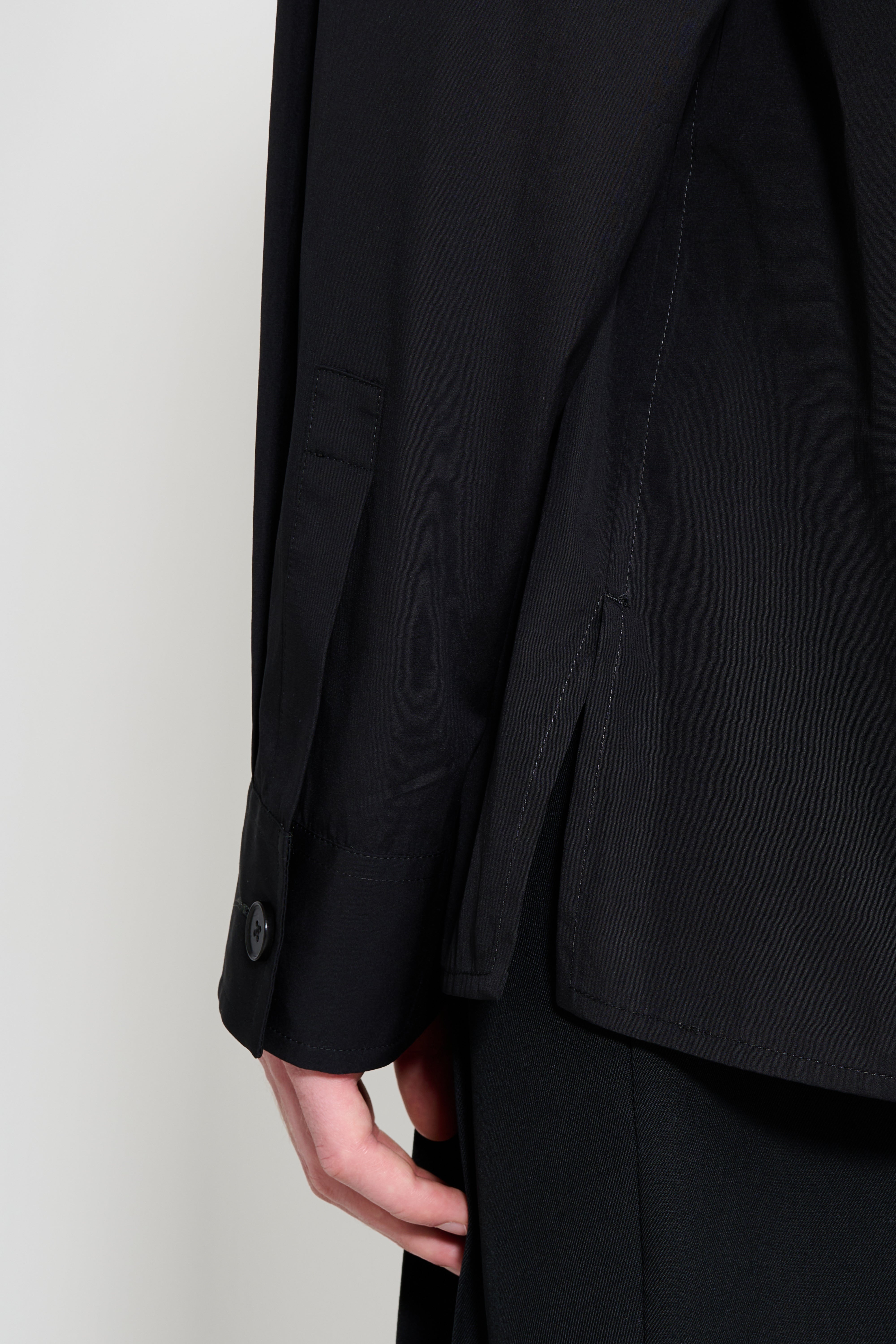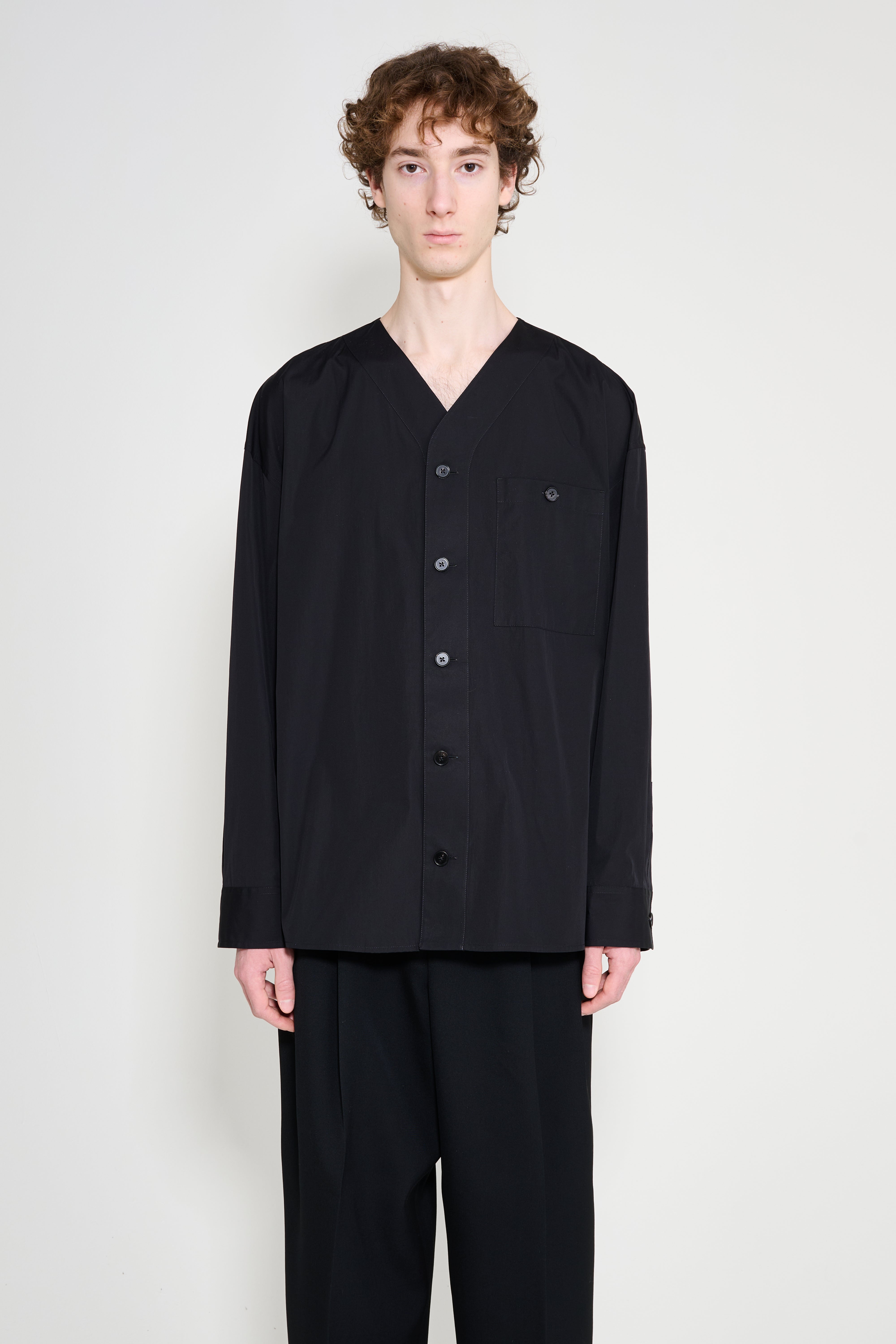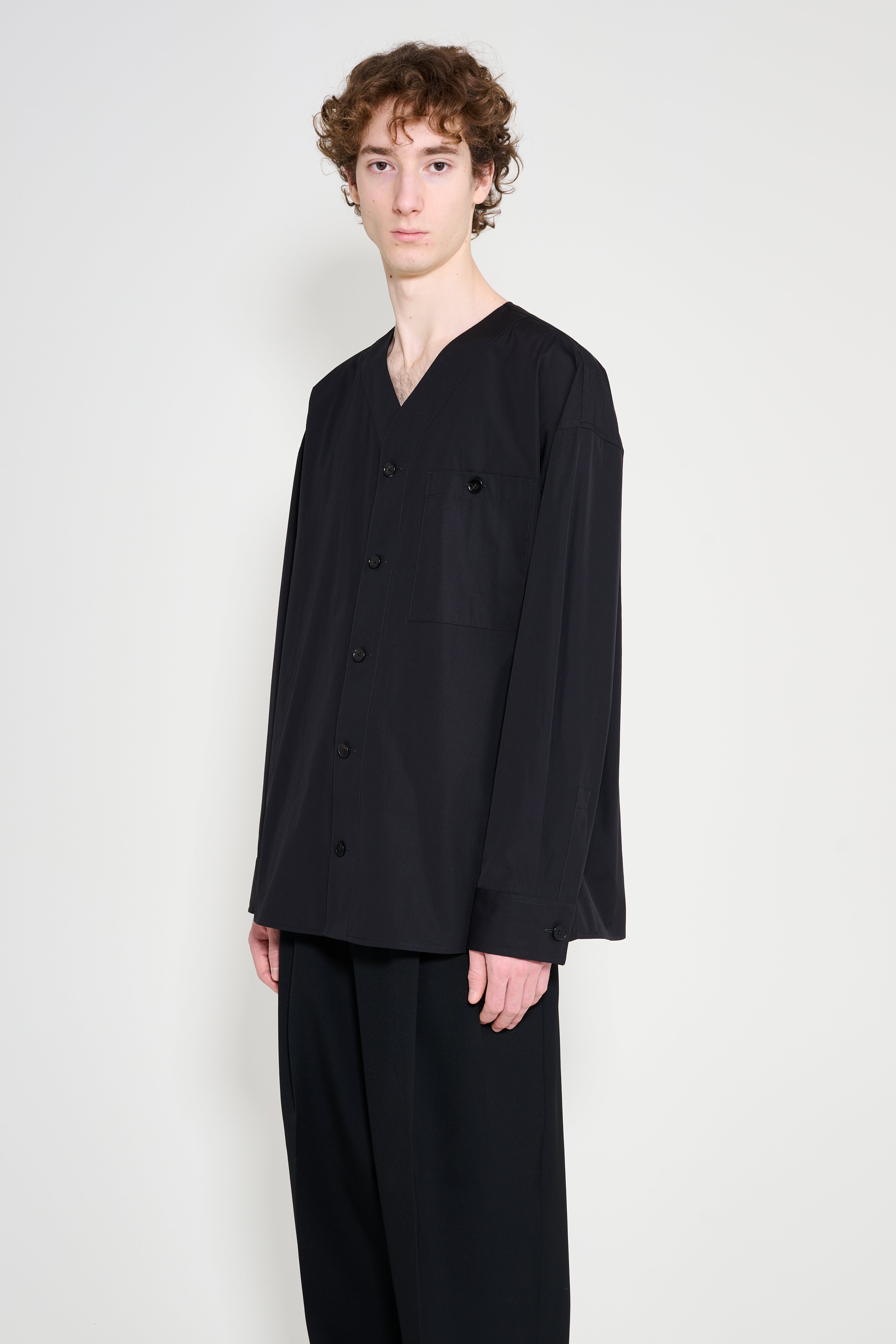 Collarless shirt from Jil Sander+. Made in Italy, cut in black with a relaxed, boxy profile. Features a band collar and a concealed front button closure for a clean aesthetic. Includes long sleeves with button cuffs and a single patch pocket at the chest. The hem is straight with side slits and tonal stitching.