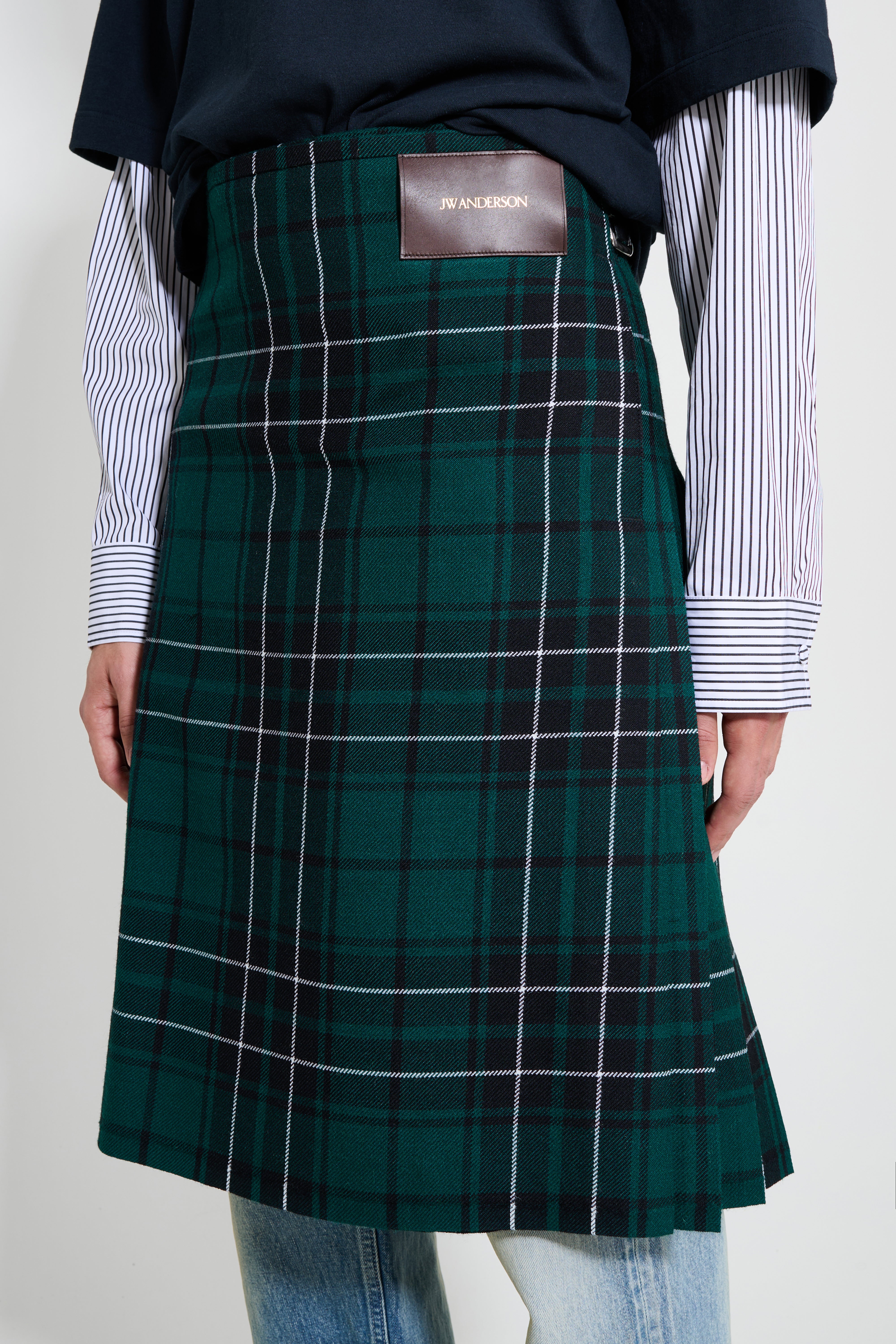 Kilt from JW Anderson. Made in Scotland from forest green woven fabric. Cut in a wrap construction with pleated panels. Features a structured waistband with side fastening, side pockets and leather strap adjusters with buckles. Finished with a leather logo patch and a mid-length profile.