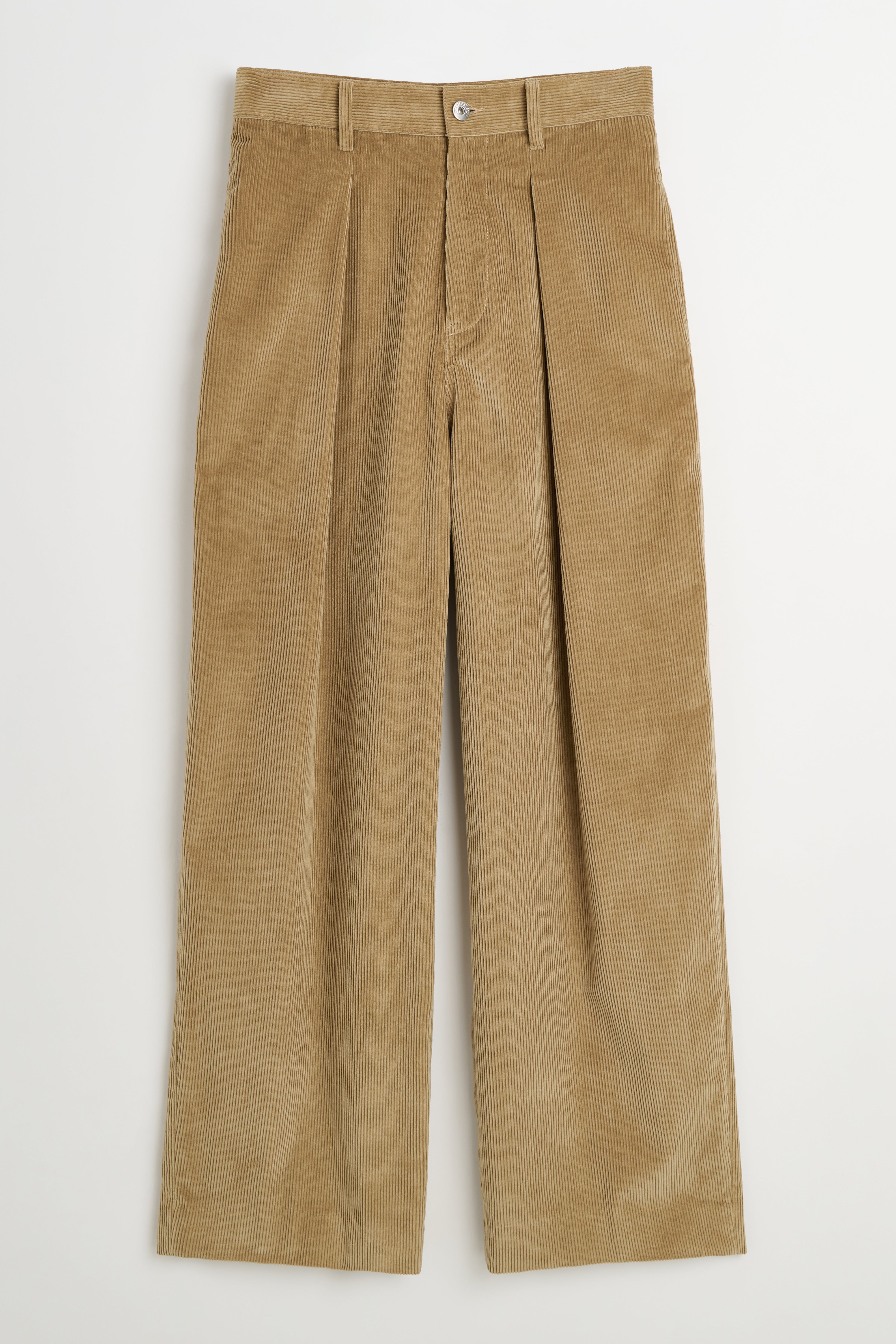 Trousers from JW Anderson. Made in Italy from a biscuit beige woven fabric with a single pleat at the front and a wide leg profile. Detailed with a waistband featuring belt loops, slanted side pockets and welt pockets at the back.