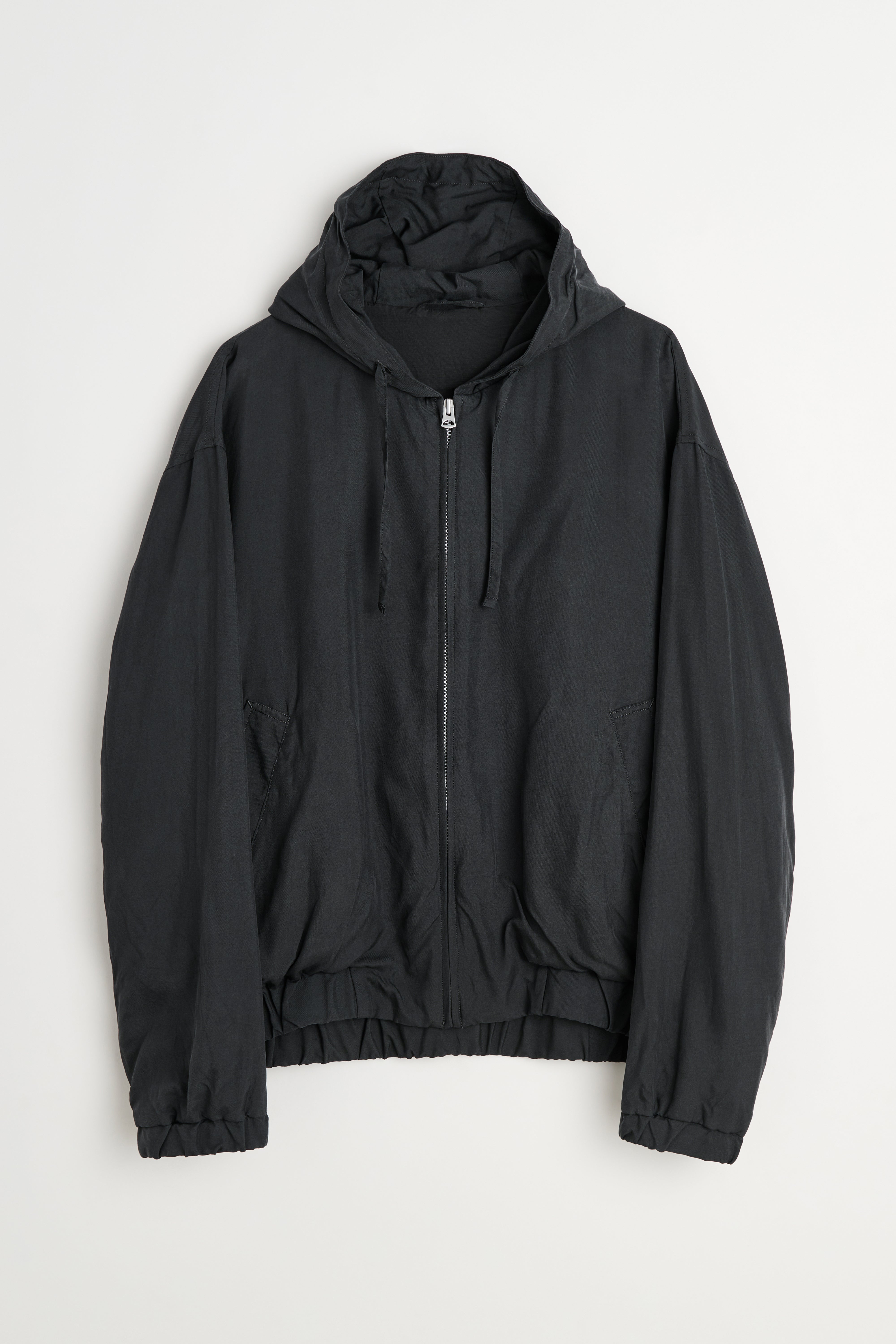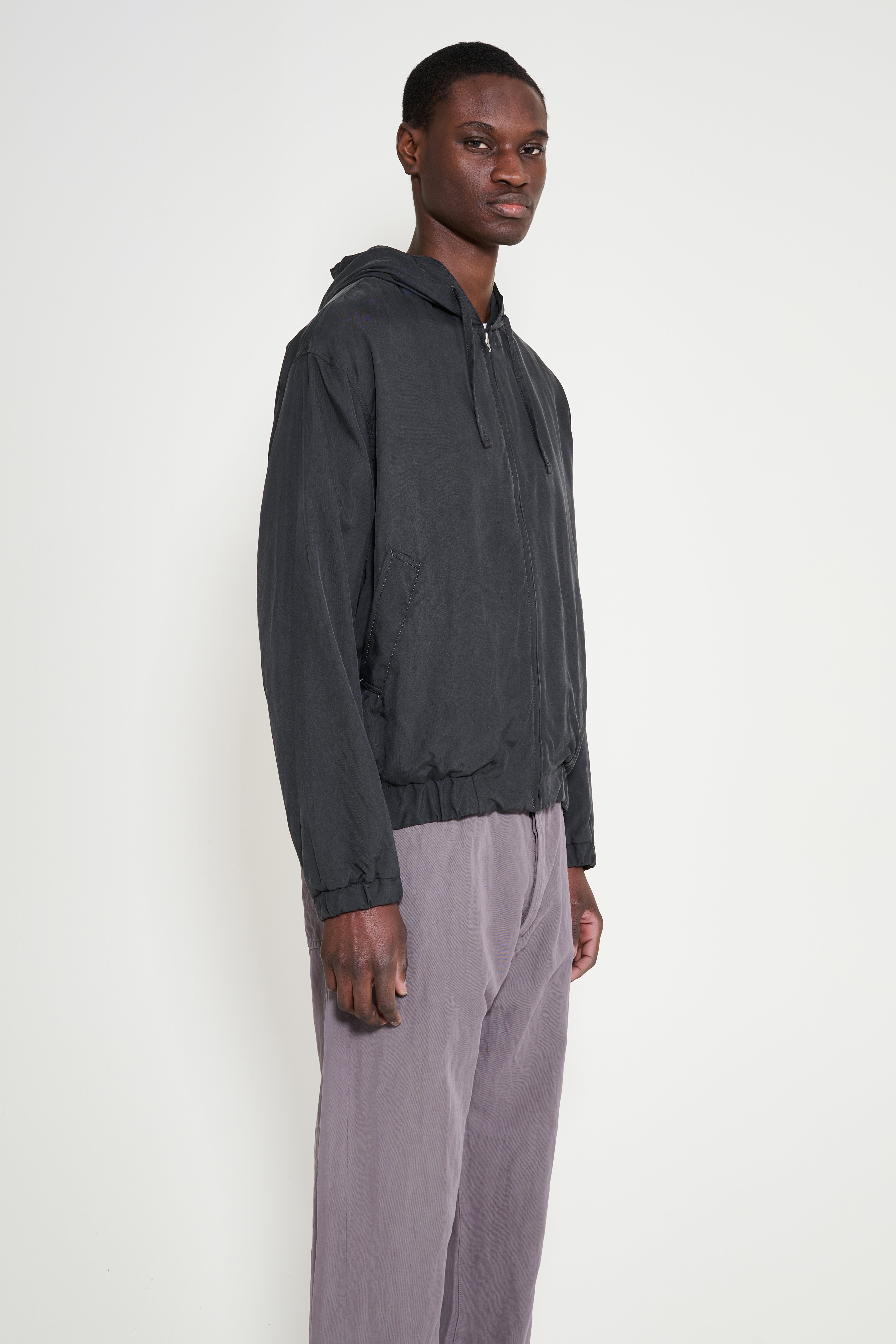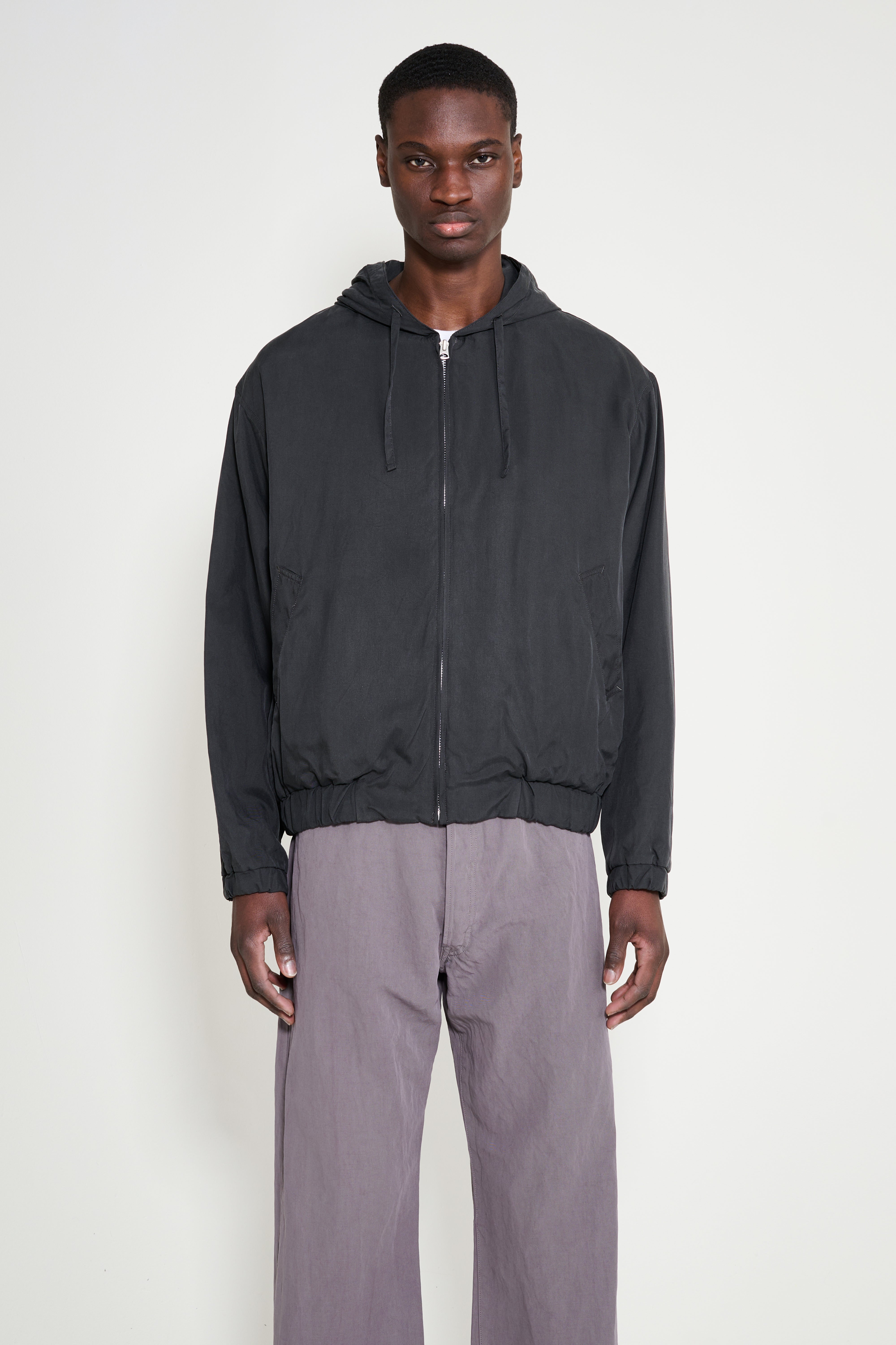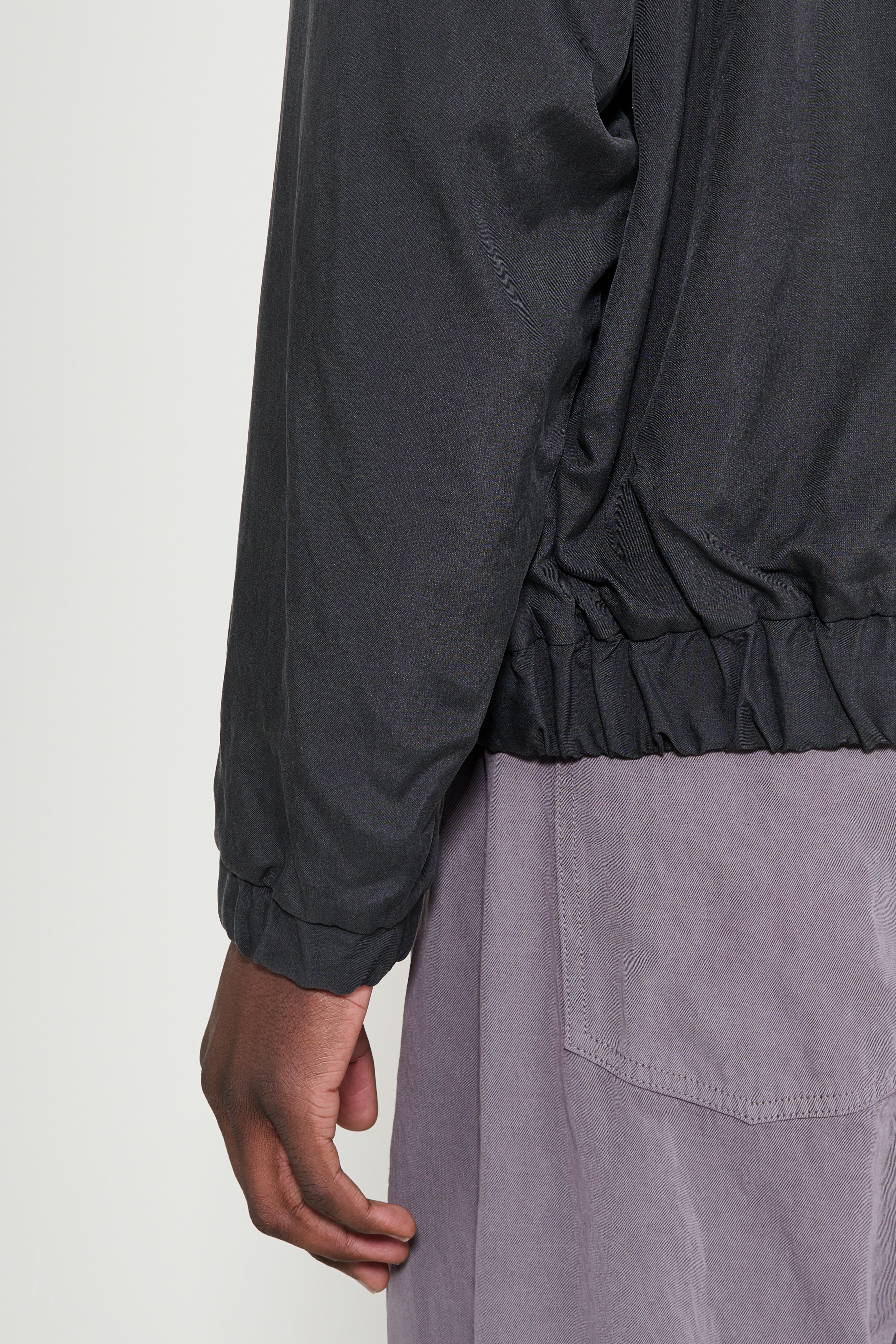 Silk blouson from Lady White Co. x Kaptain Sunshine. Cut in a regular silhouette in black. Features a structured collar and a front opening. Includes set-in sleeves and a straight hem. Finished with collaborative branding details.