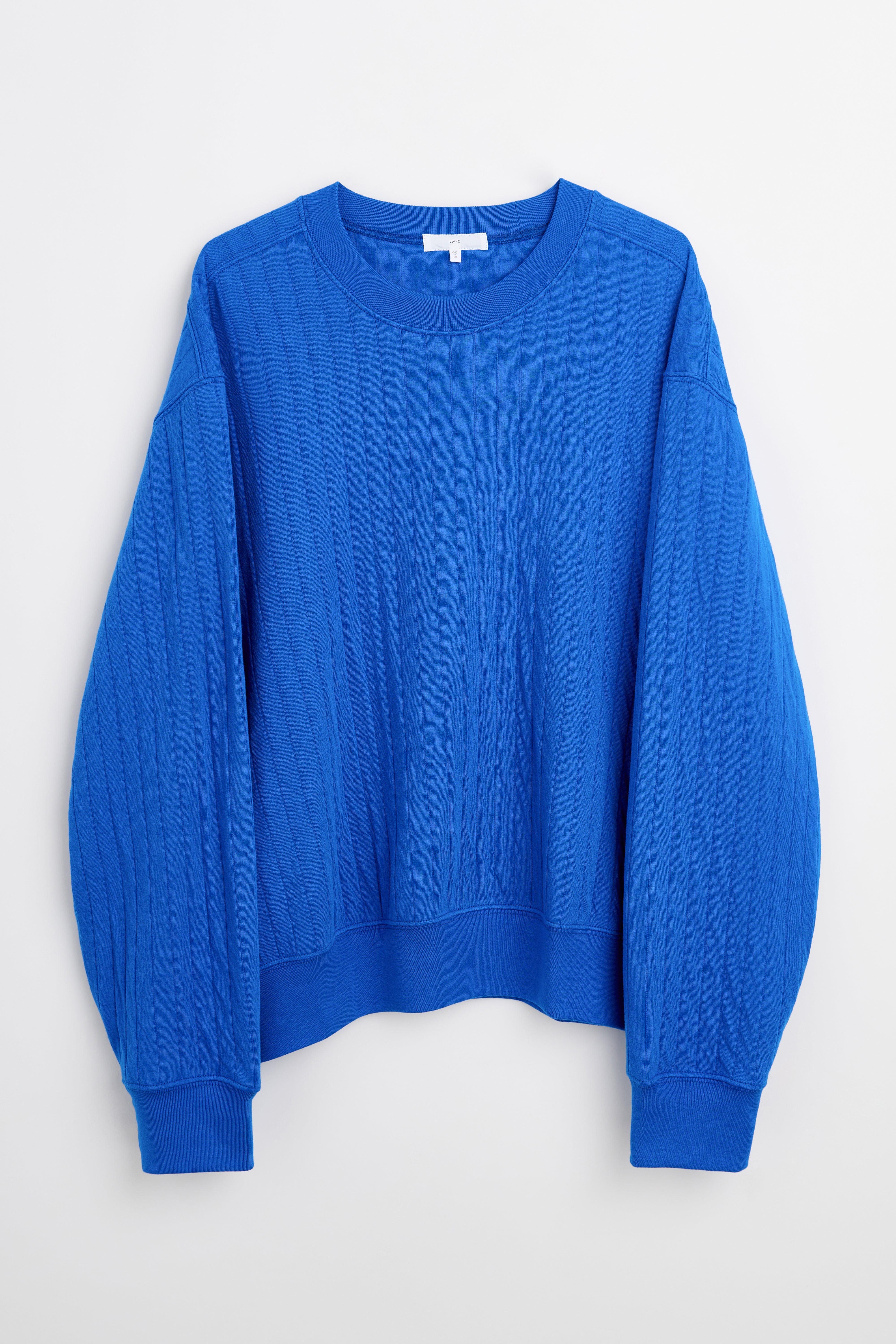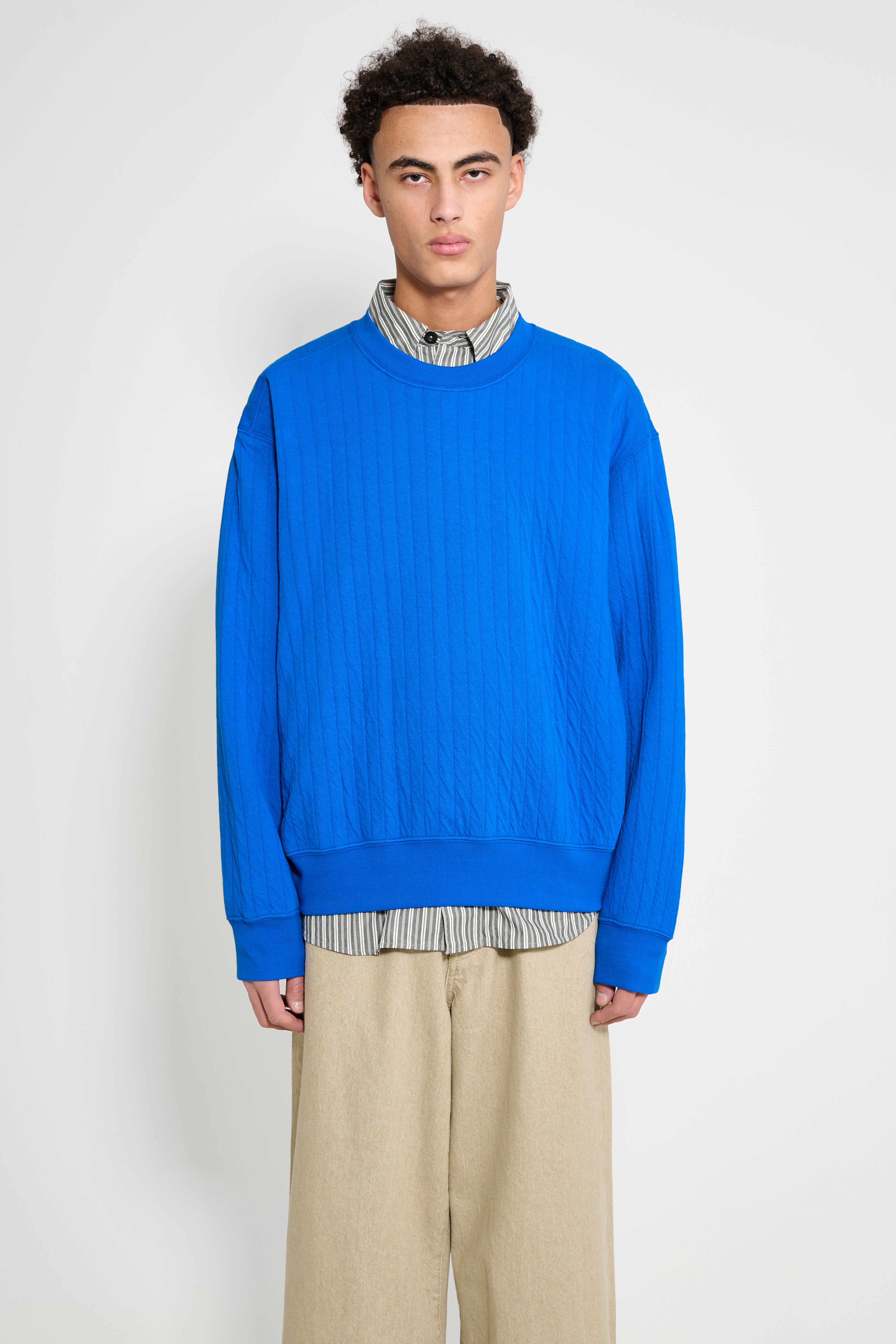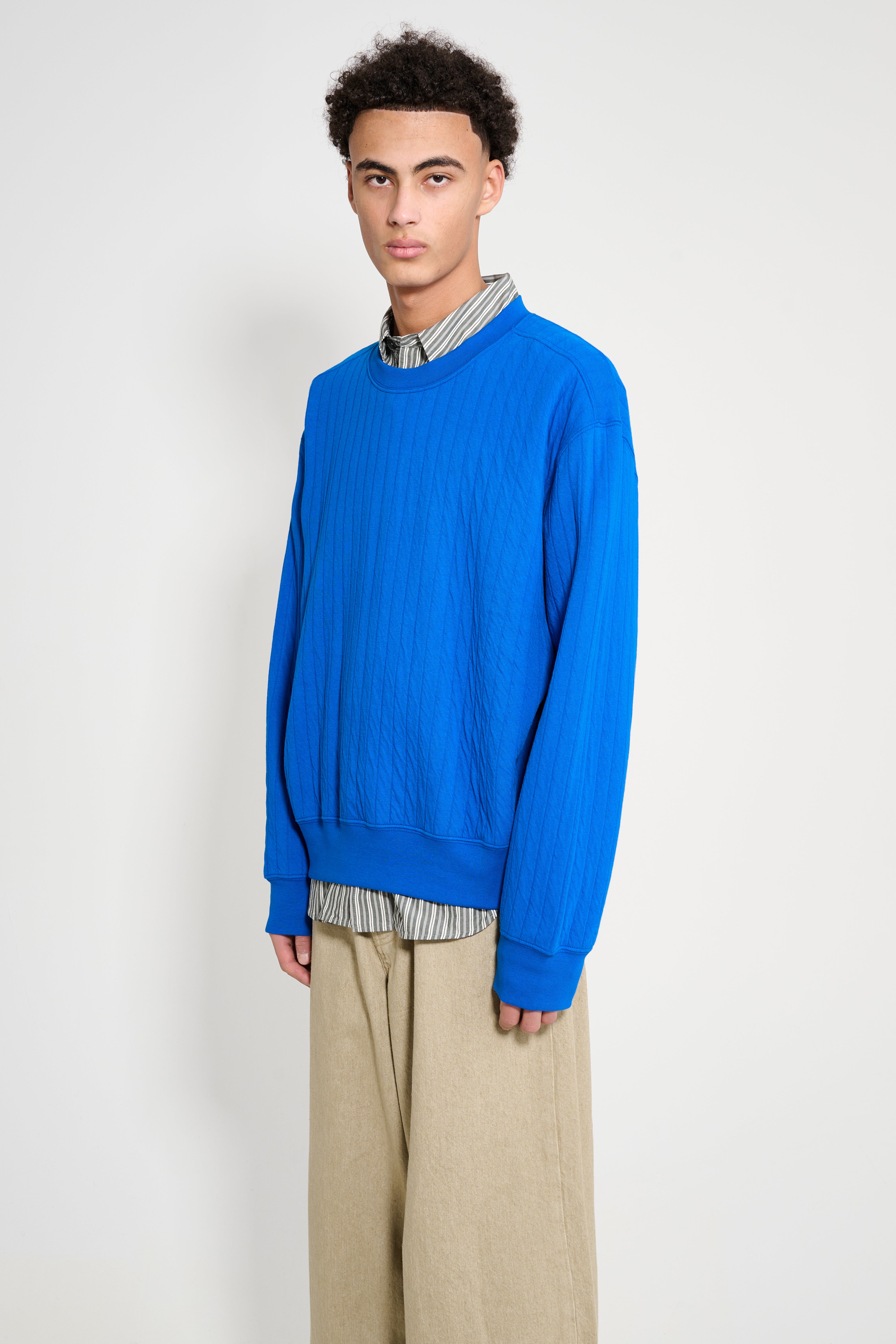 Quilted crewneck sweatshirt from Lady White Co. in a TRÈS BIEN exclusive colorway. Crafted from all-cotton quilt knit produced in Japan with a cable-like surface. Body is roomy through the chest with a boxy shape that tapers slightly toward the hem. Collar sits high on the neck. Ribbed edges, three-needle overlock seams, and split coverstitch details in a preshrunk finish.