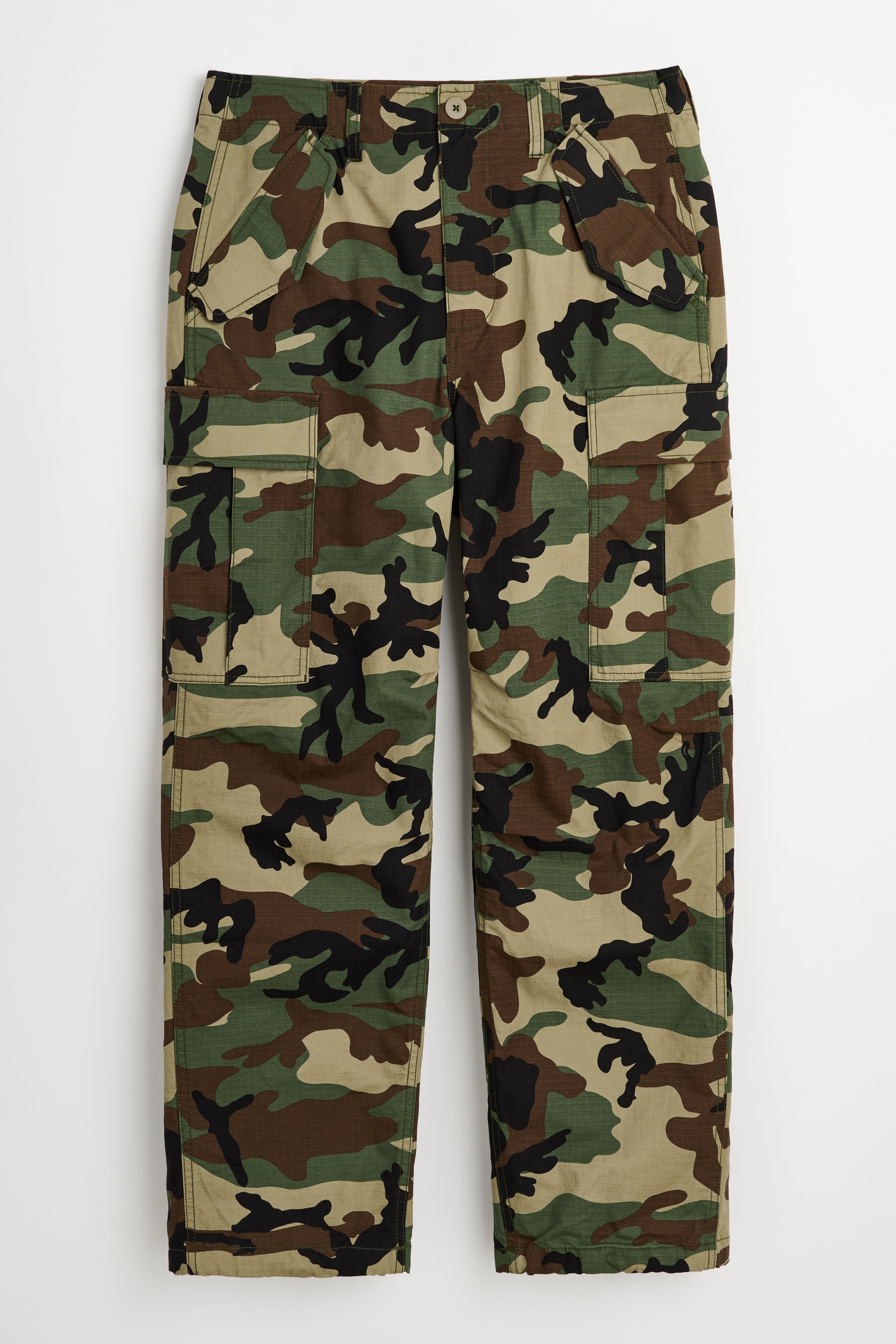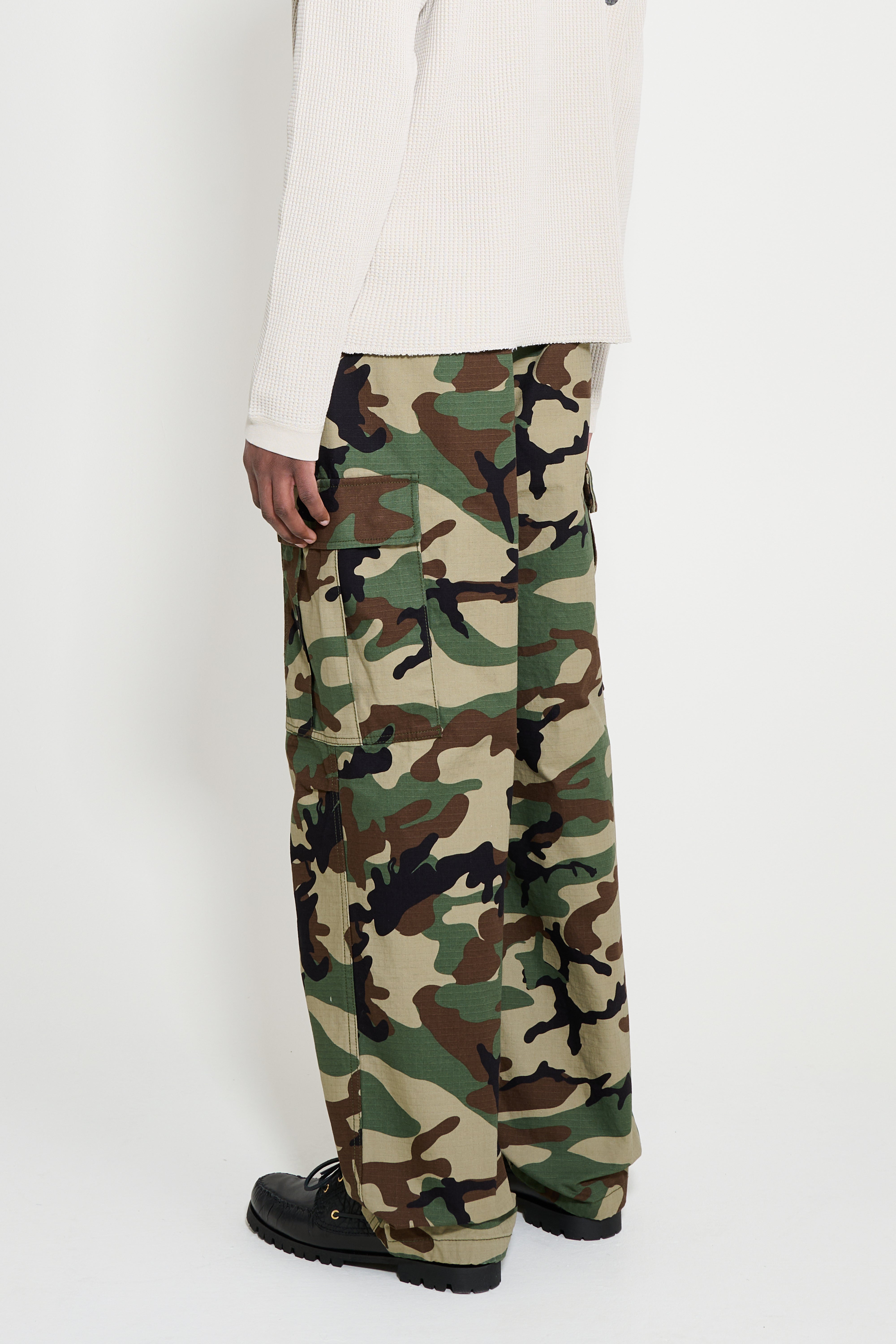 Cargo pant from Stüssy. Covered in a woodland camouflage pattern. Features multiple cargo pockets on the legs. Includes an adjustable waist and straight leg.