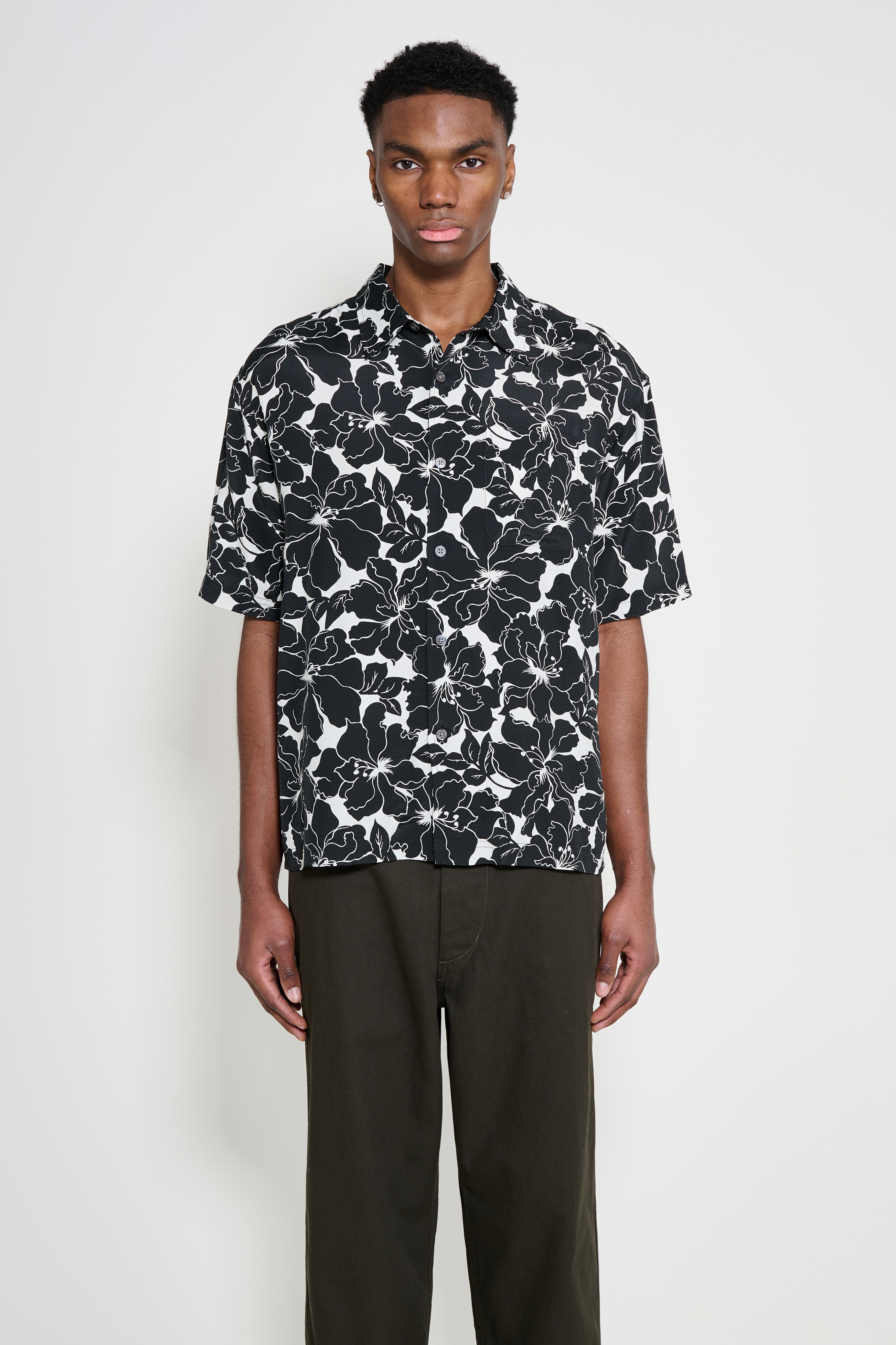Hawaiian shirt from Stüssy. Designed with a black allover floral pattern set against a white base. Features a camp collar and short sleeves. Includes a button-front closure and straight hem.