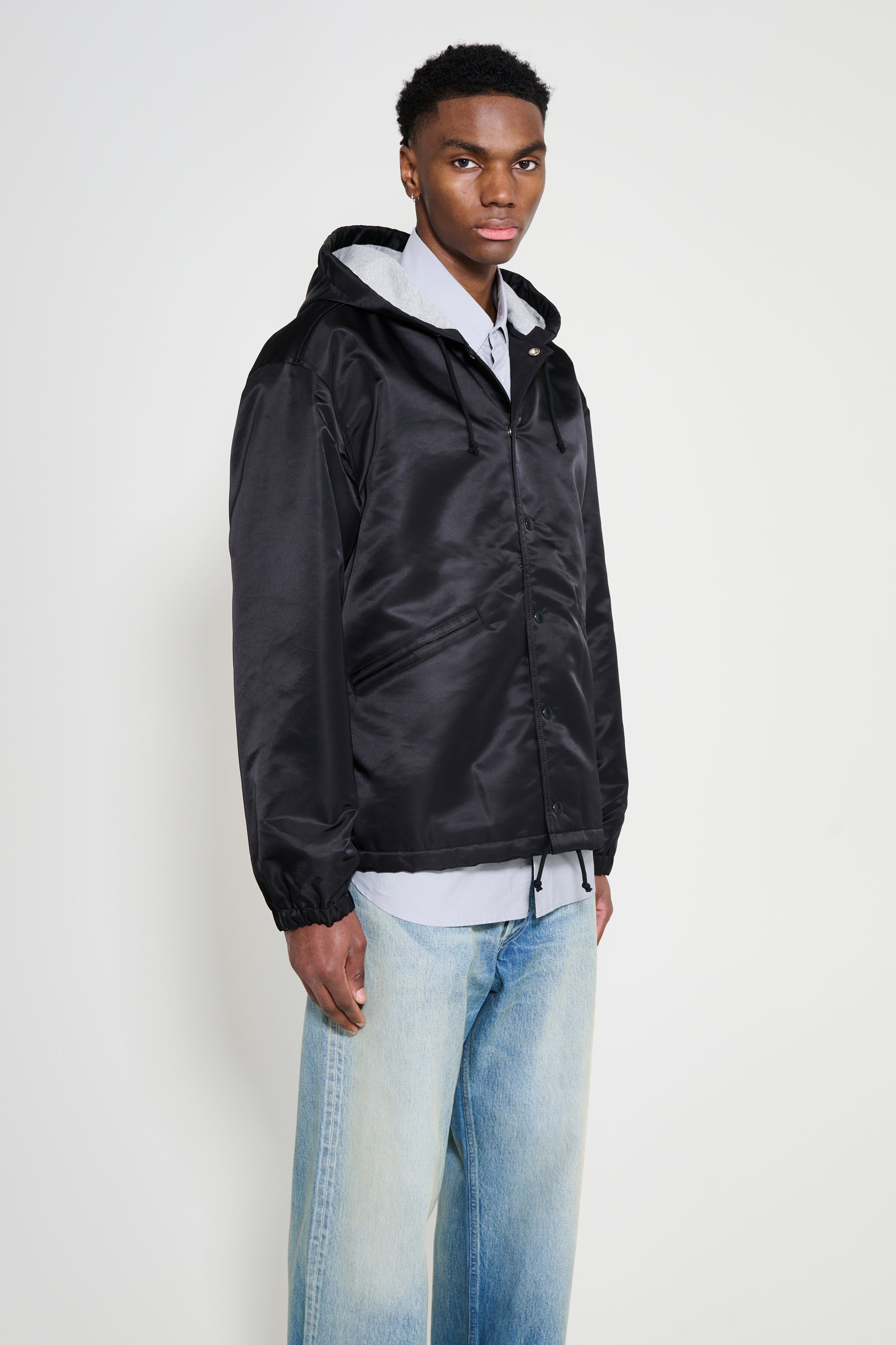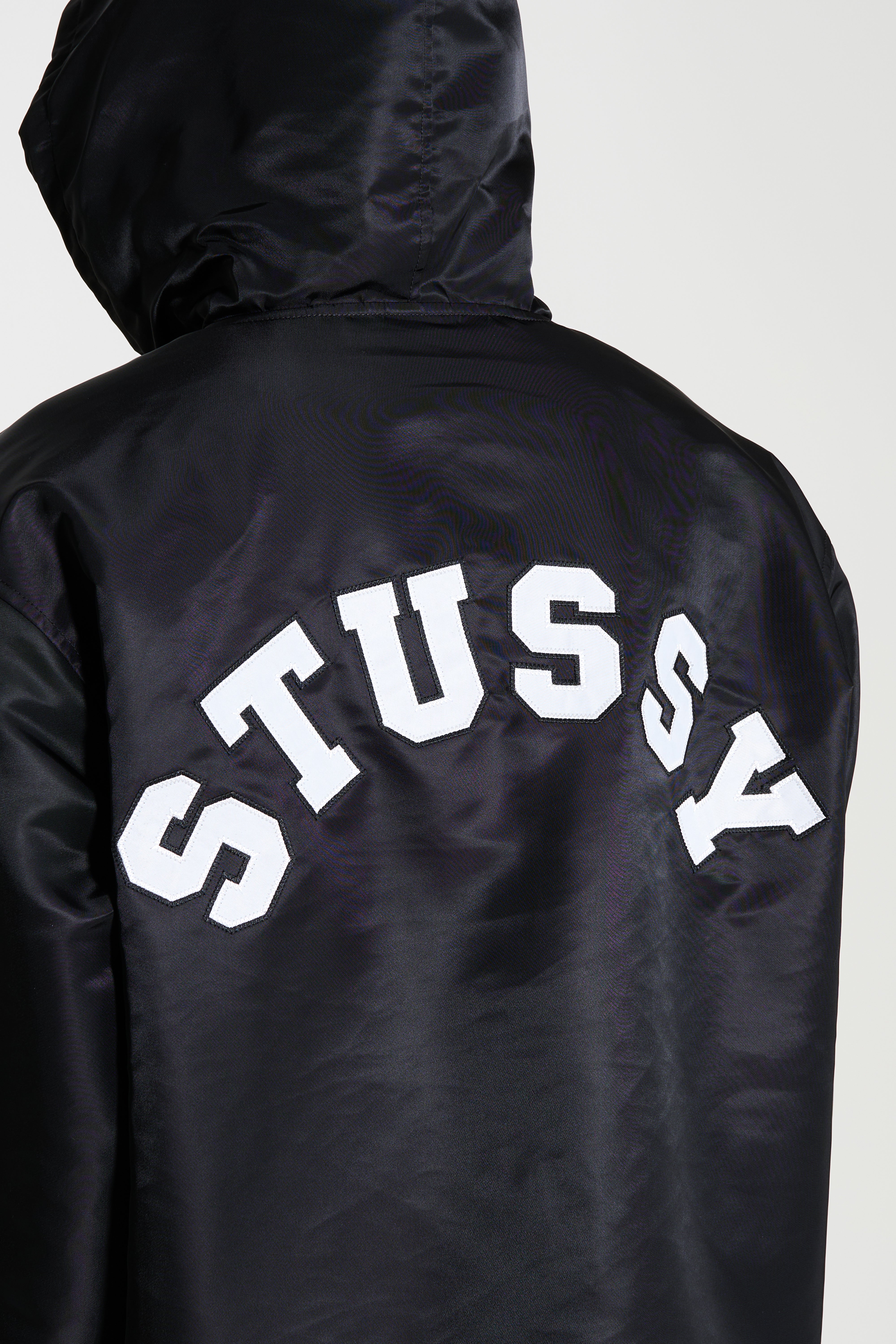 Hooded coaches jacket from Stüssy. Designed in a solid black tone with a snap-front closure. Includes a fixed hood with adjustable cords. Finished with side welt pockets and elasticated cuffs.