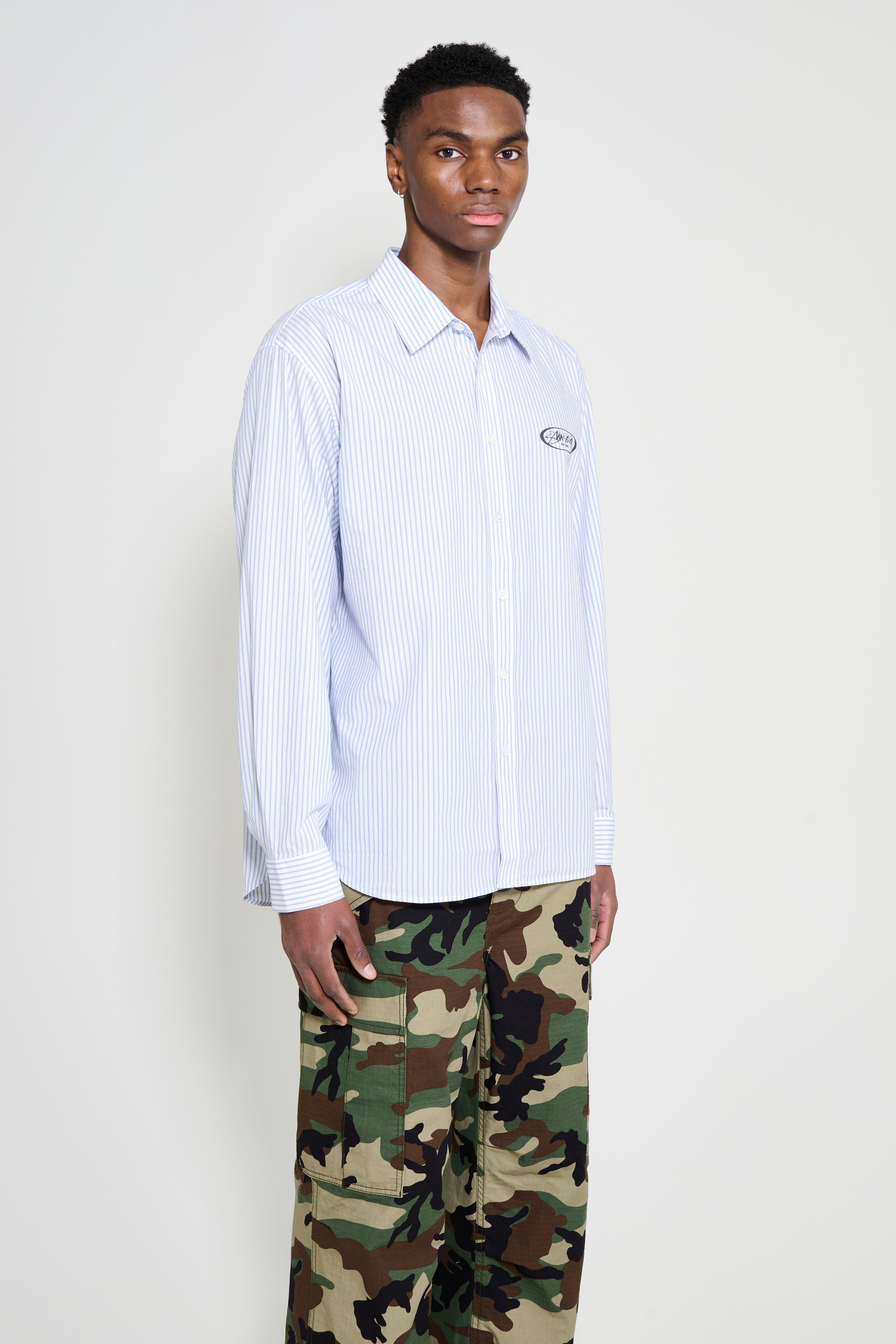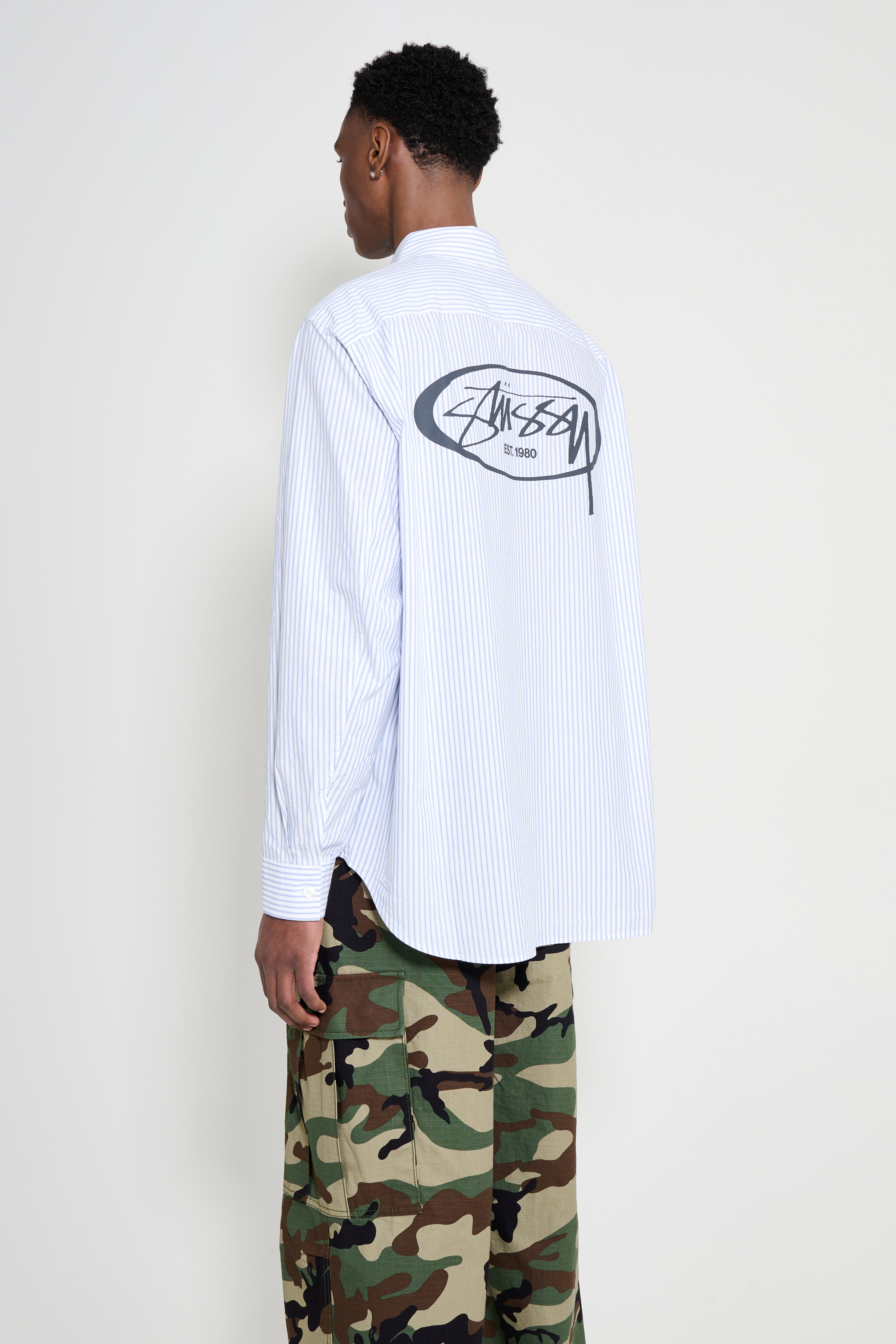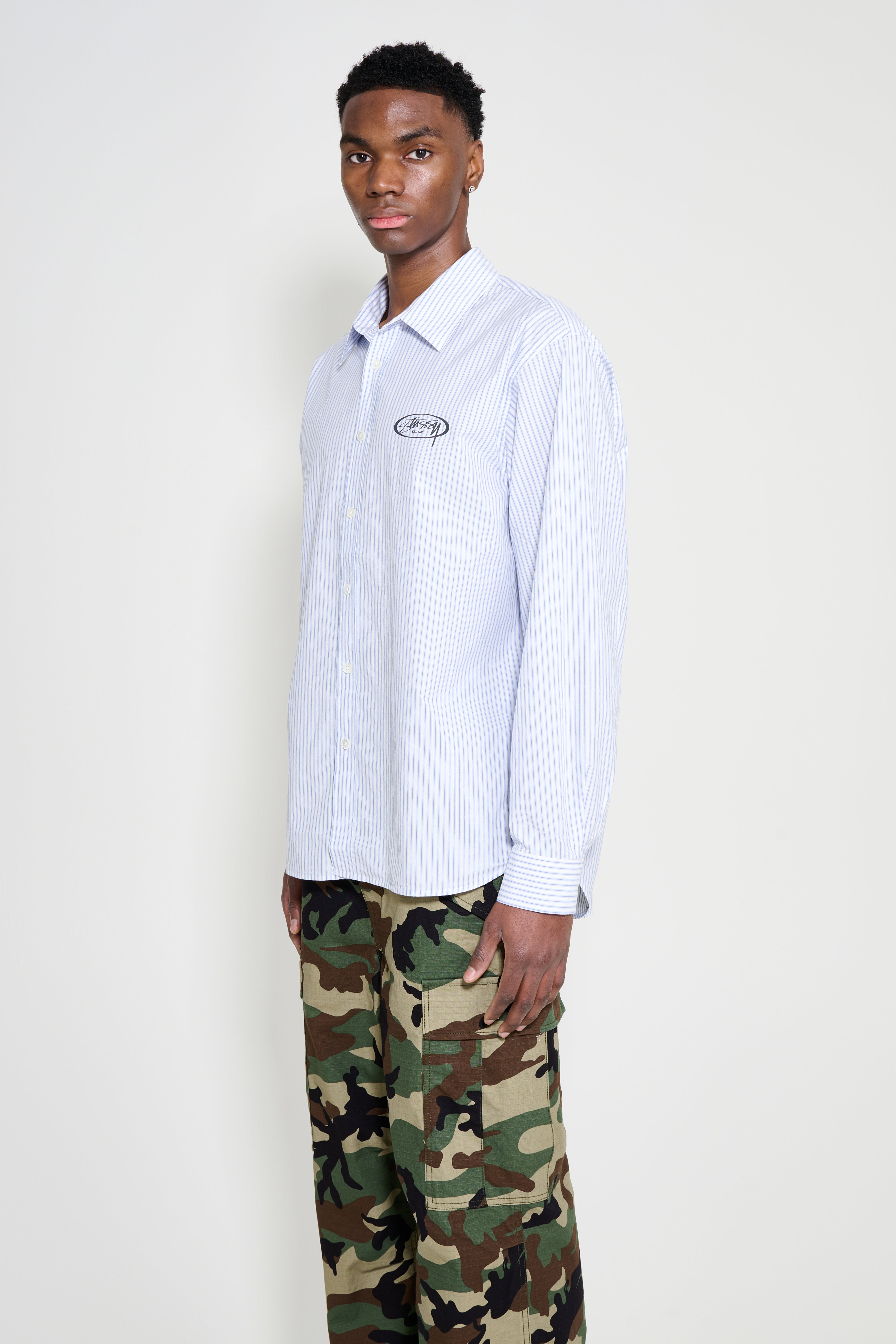 Long-sleeve shirt from Stüssy. Cut in a blue striped fabric with a button-down front. Features a pointed collar, buttoned cuffs and a curved hem. Finished with logos at the chest and back.