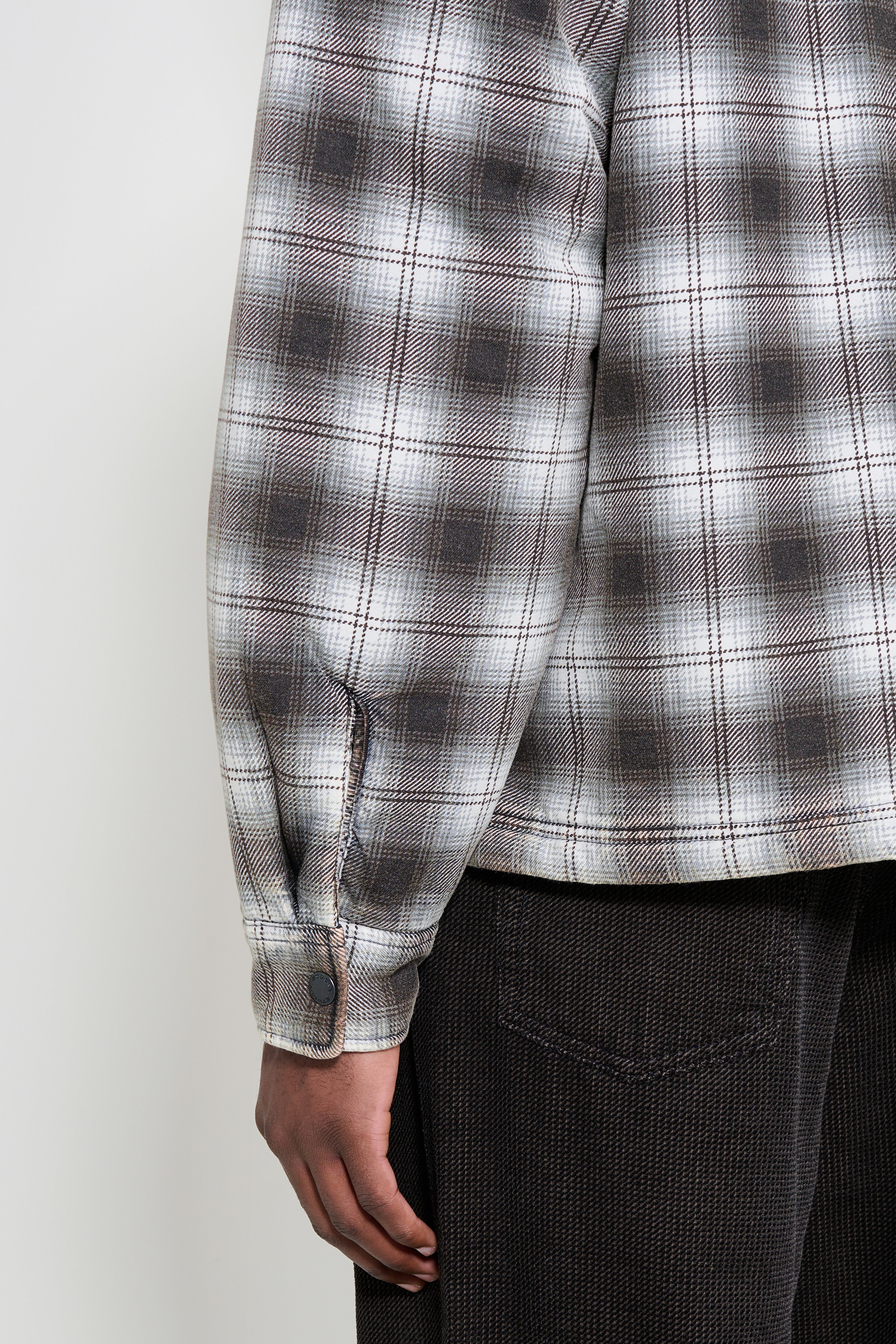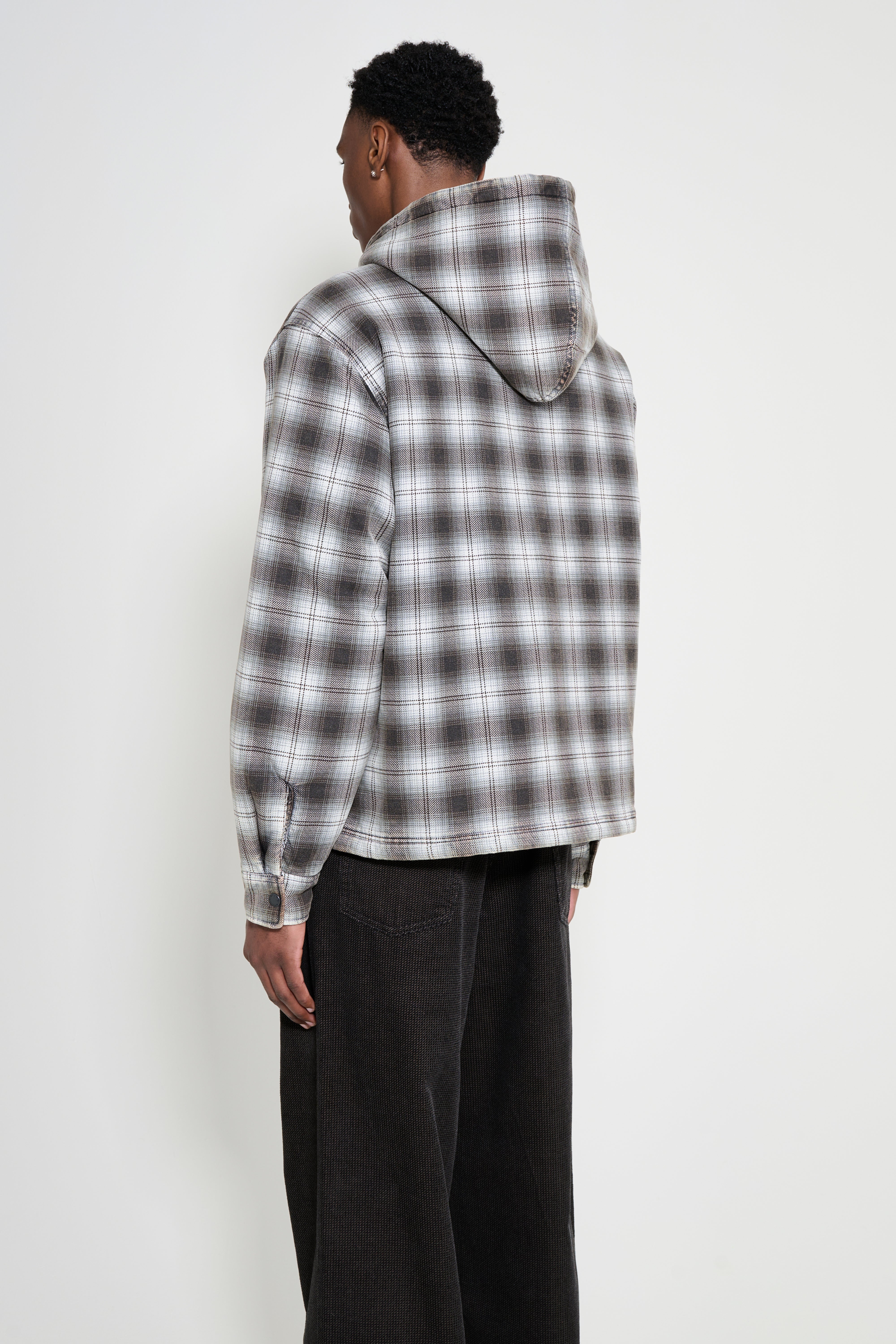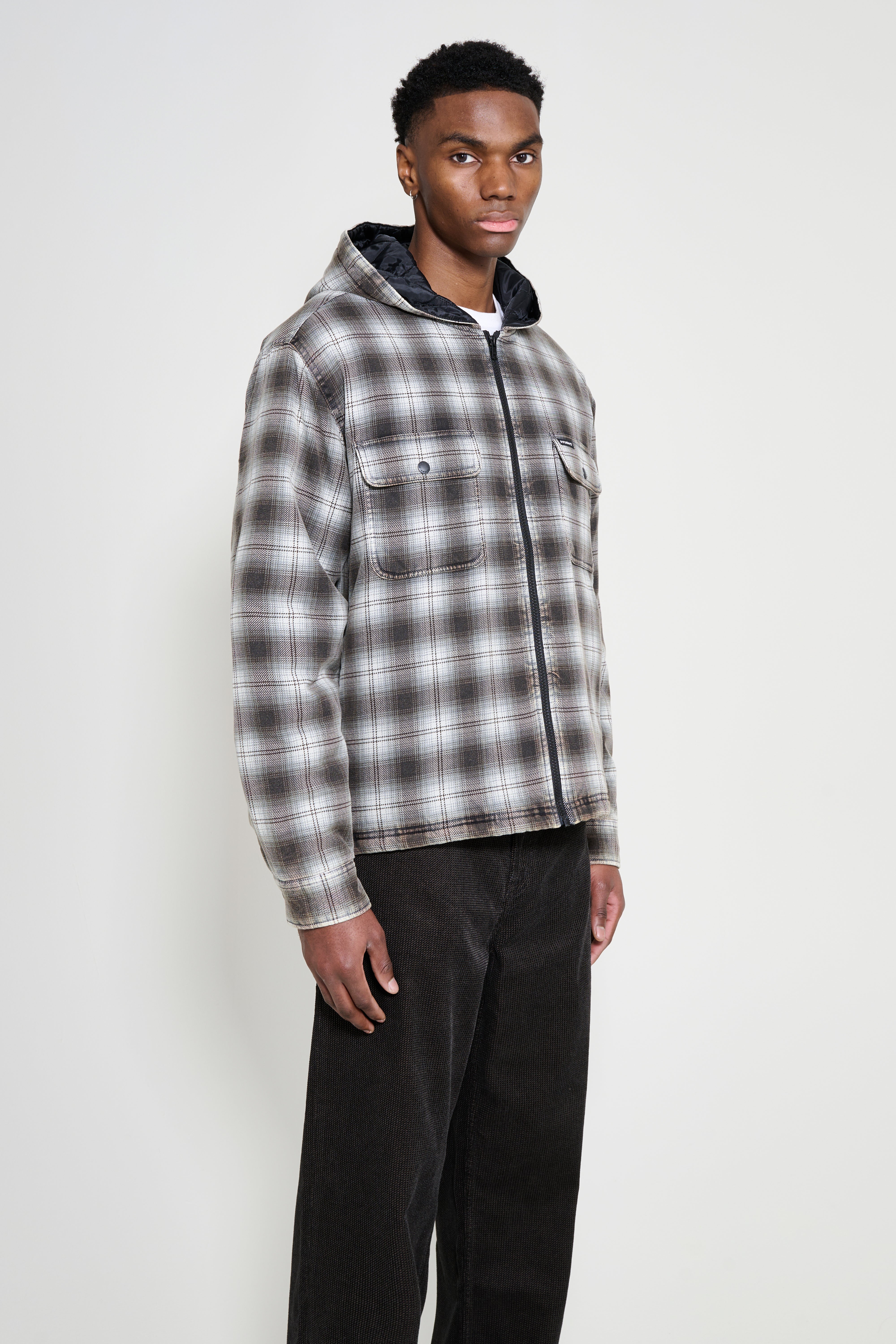 Hooded shirt jacket from Stüssy. Cut in a relaxed profile with a washed cotton blend in charcoal plaid. Features a full-length YKK Vislon zip and fully quilted interior. Includes snap-closure patch pockets at the front and side seam pockets. Finished with pleated cuffs with snaps, a straight hem, and a woven label on the left chest pocket.