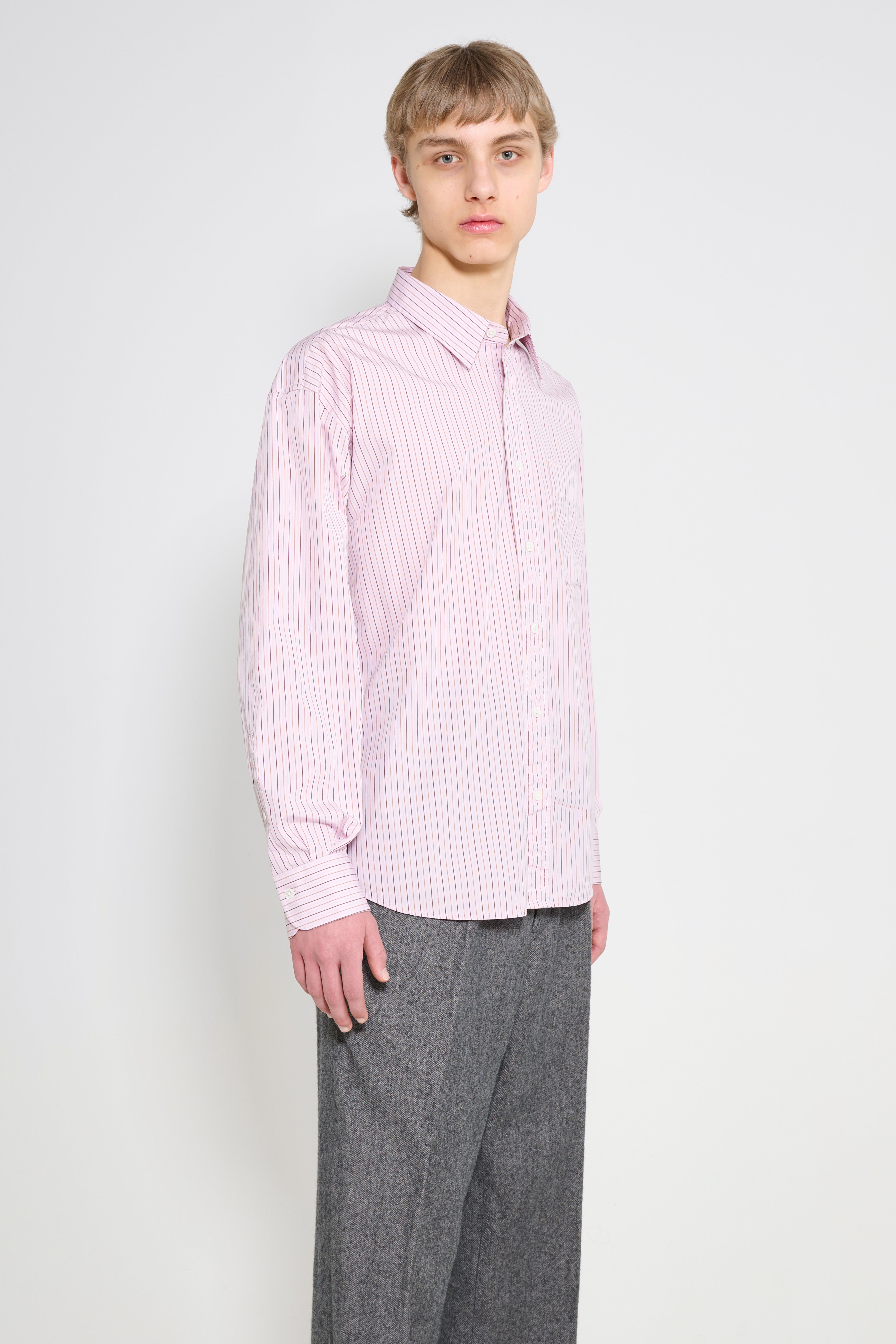 Button up shirt from Sunflower. Cut from 100’s cotton poplin with yarn dyed pink stripes and a relaxed, slightly oversized shape. Features a classic collar, locker loop and back pleat. The front fastening uses real mother-of-pearl buttons. Completed with a chest pocket and buttoned cuffs.