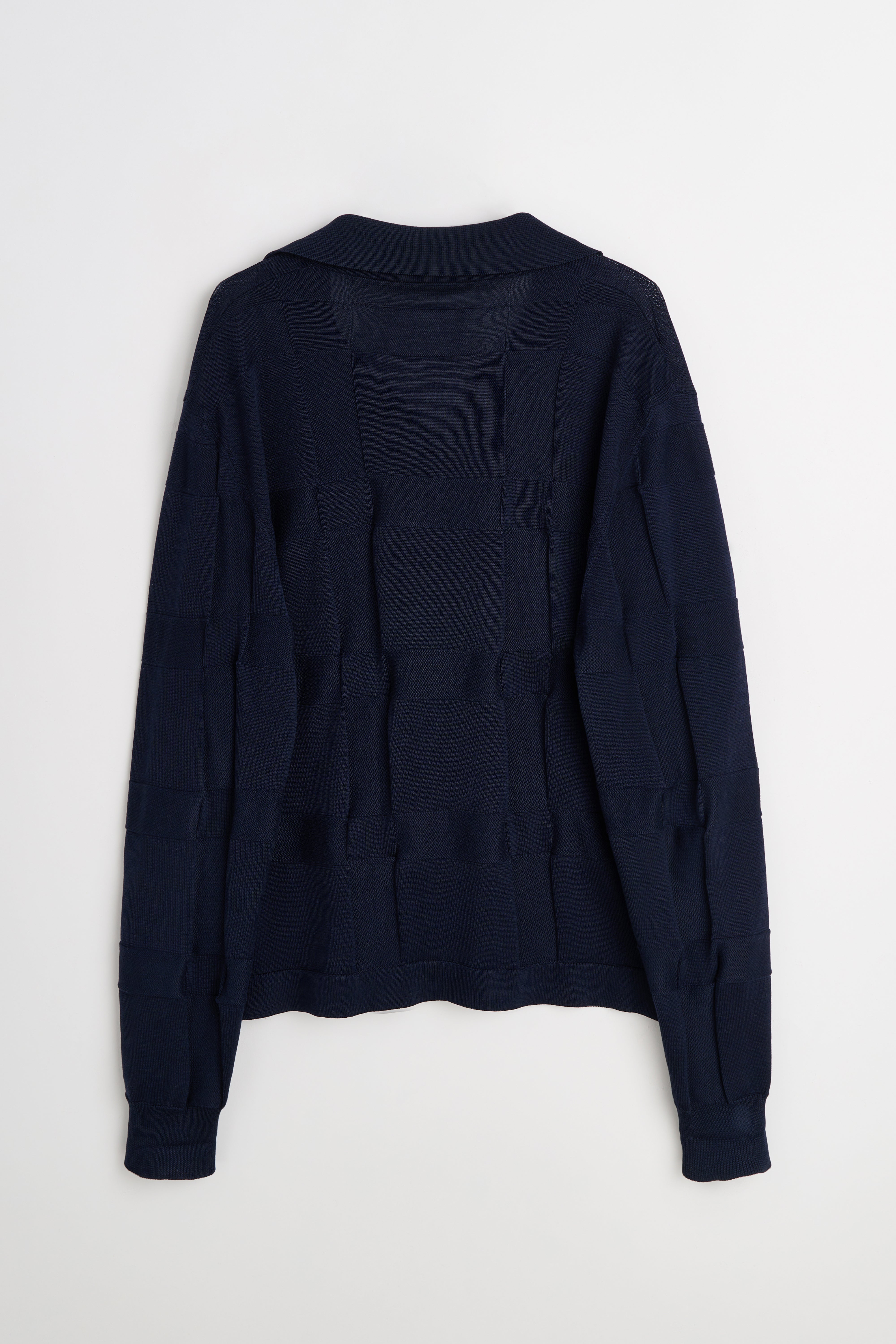 Intricate knitted sweater from Paris-based Maison Margiela. This piece features a complex, tonal grid construction with raised panels that create a unique tactile finish. Designed with a relaxed open collar and ribbed cuffs, it offers a sophisticated take on the classic polo sweater. Finished with the brand’s signature four white stitches at the back neck. Crafted from high-quality 100% cotton yarn in a deep navy hue. Pre-owned in good condition. Please review images for more information.