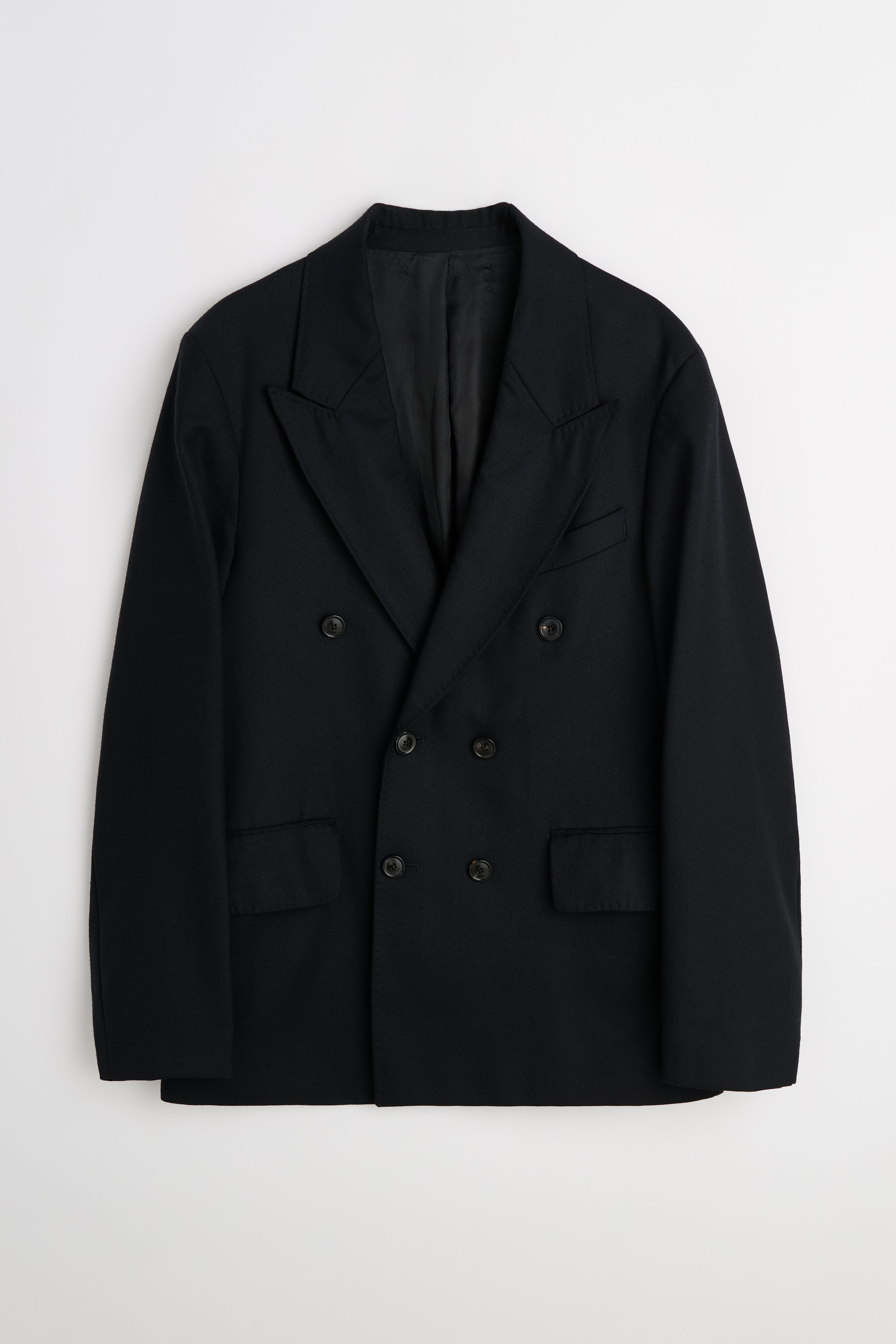 A rare double-breasted blazer from Swedish brand Our Legacy. This specific garment is a show collection sample, offering a unique opportunity to own a piece of the brand’s design process. Crafted from a mid-weight 100% wool fabric with a distinct grain, the blazer features wide peaked lapels, a six-button front, and two flap pockets. Good pre-owned condition. Please review images for more information.