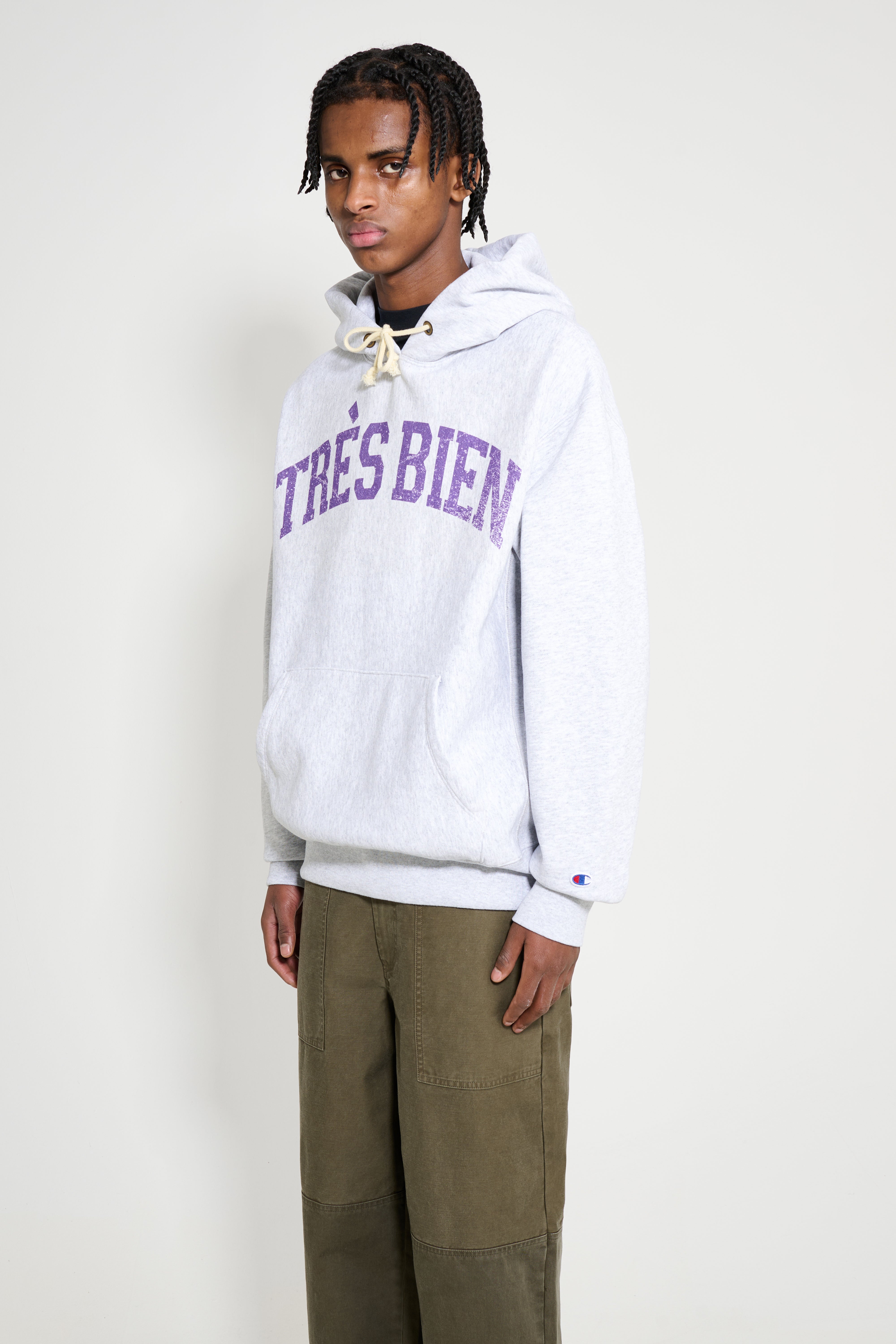 Hooded sweatshirt from TRÈS BIEN in collaboration with Champion. Made from soft, durable cotton jersey with a relaxed fit and dropped shoulders, and a wide body and sleeves. Features a contrast screen print at the chest, a kangaroo pocket, adjustable drawstring hood, ribbed trims and the signature embroidered Champion logo on the left sleeve.
