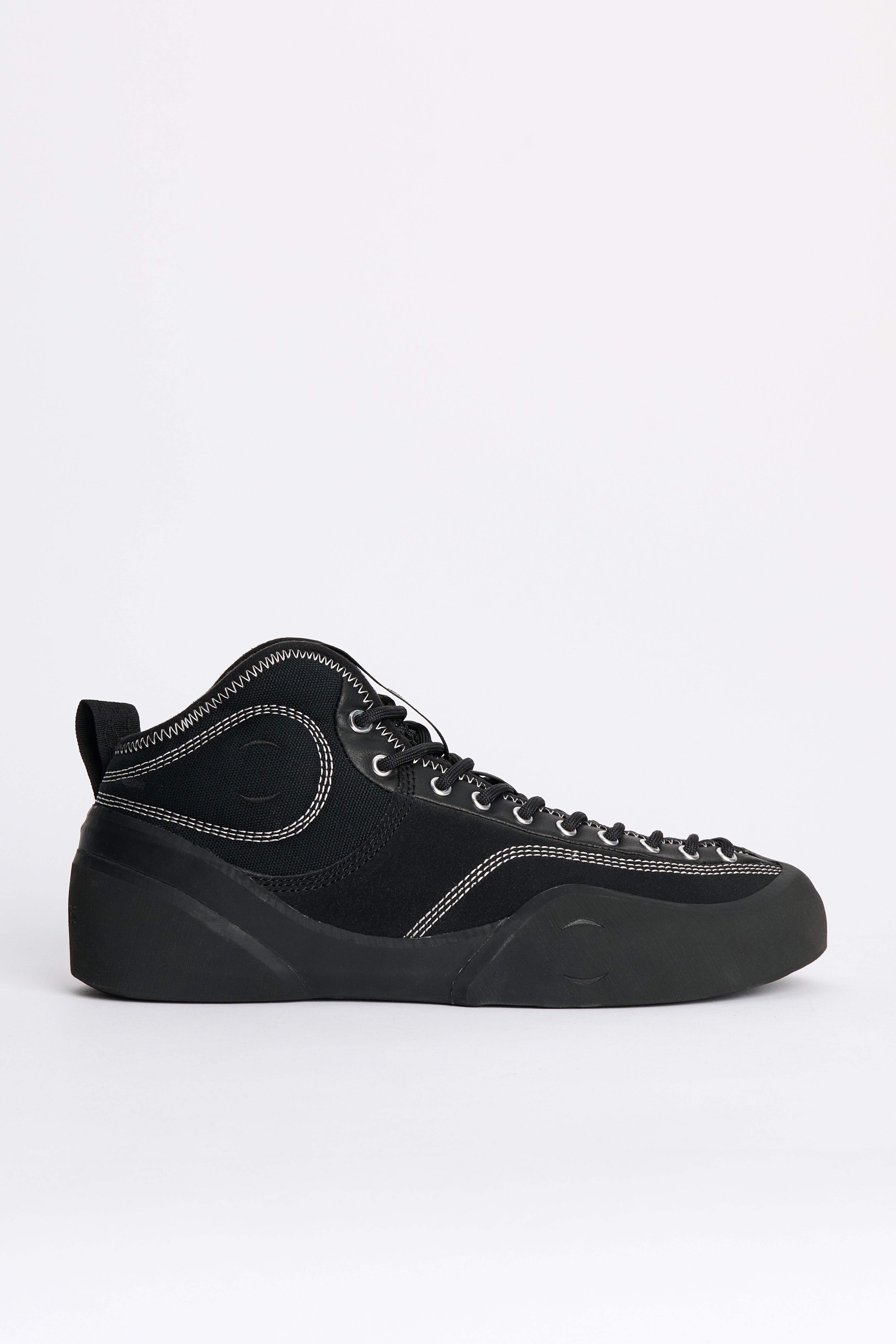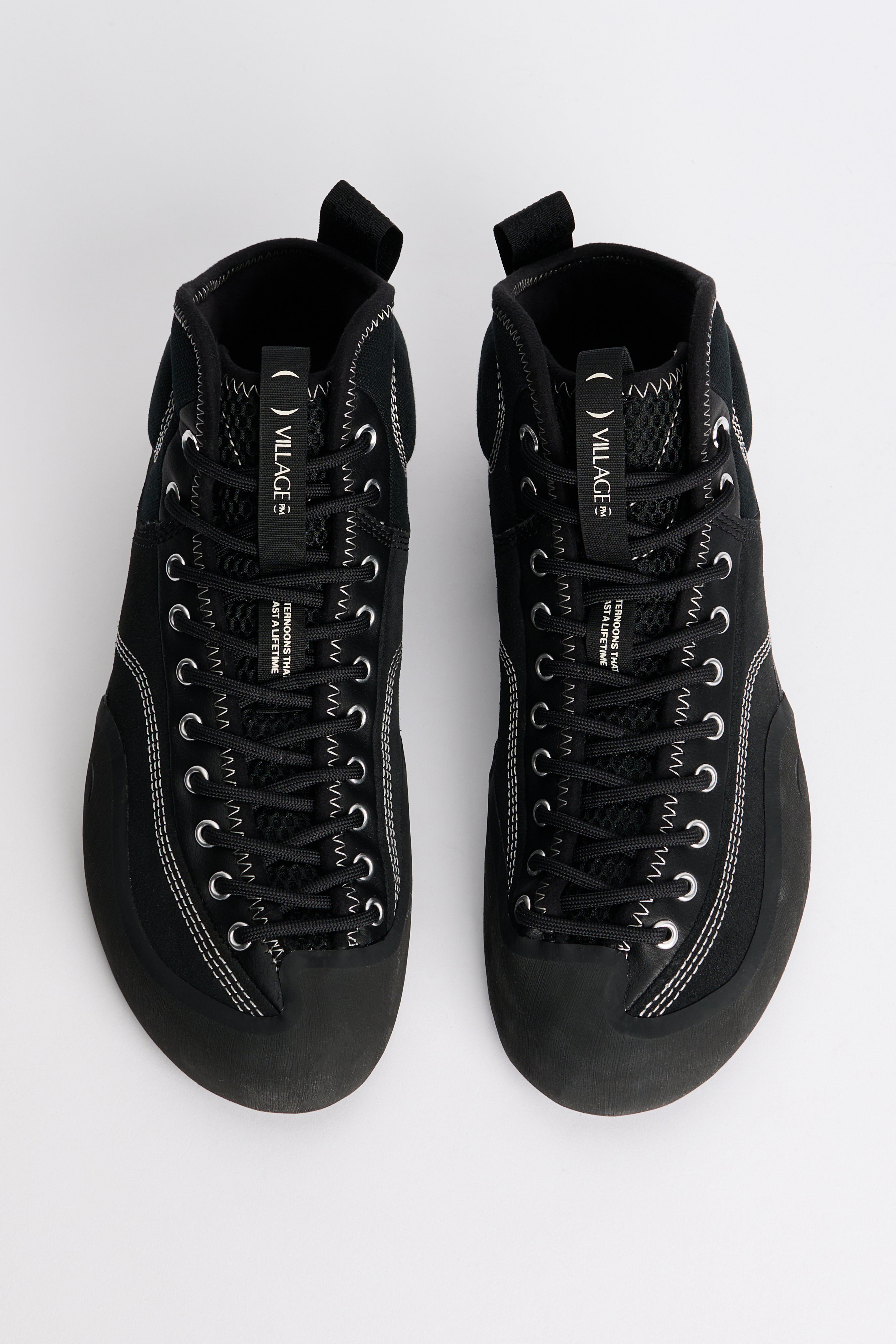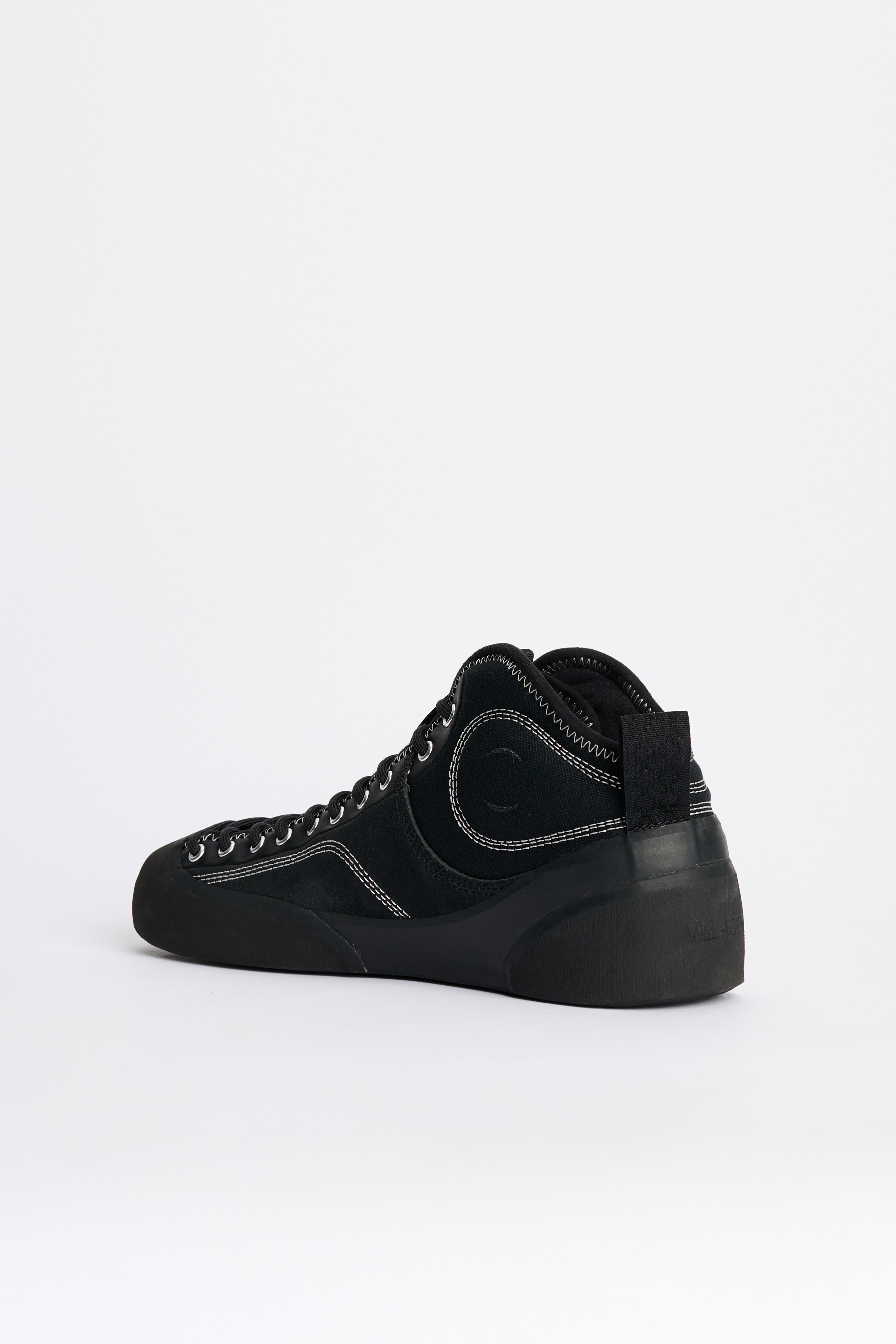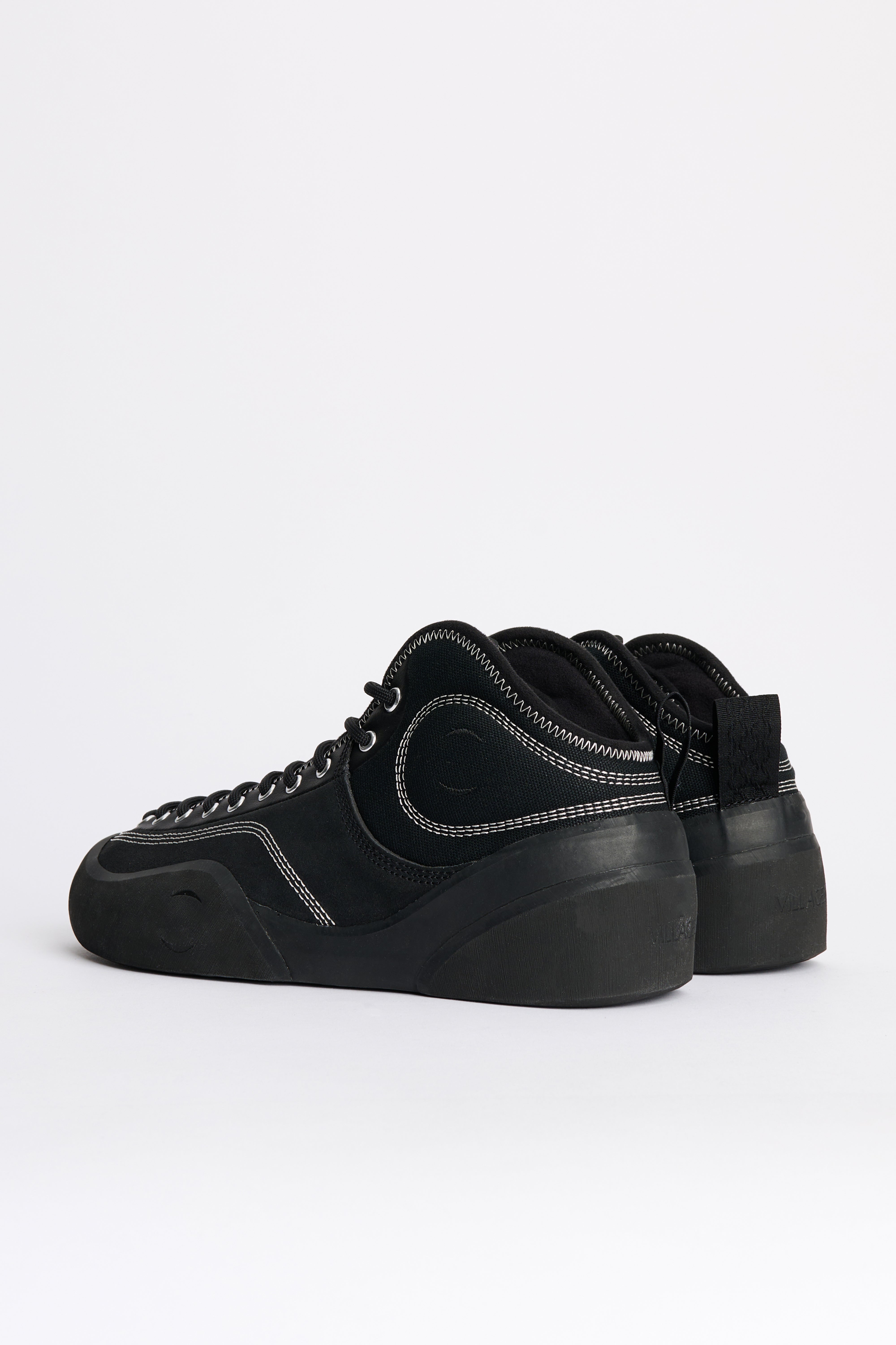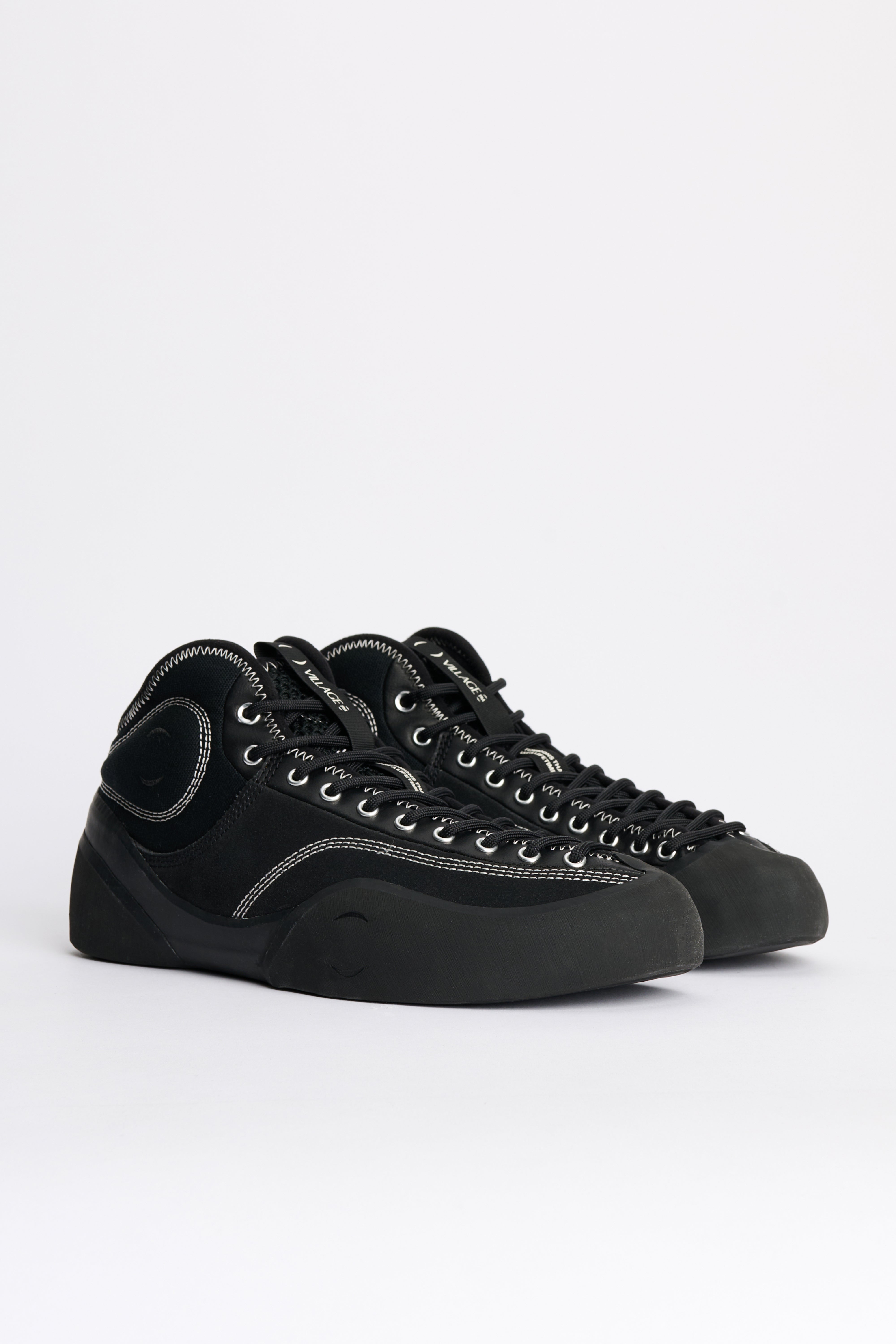 Mid-top sneakers from Village PM. A mixed suede and canvas upper in black sits above climbing rubber that encases toe and heel. The mid-height collar is cut lower at the back and padded for support. Asymmetrical full-foot lacing combines with a removable EVA midsole and a durable rubber outsole.